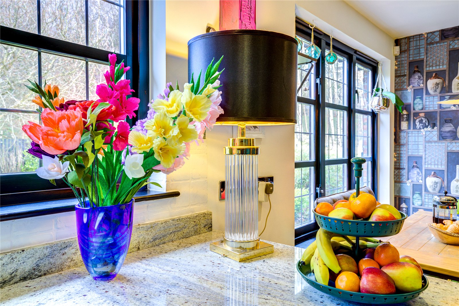 The spacious kitchen and breakfast room offers breathtaking garden views. This exceptional space features solid oak cabinetry, granite worktops, integrated appliances, a classic range-style cooker, and an inviting breakfast area. The kitchen leads to a generous pantry and well-equipped utility room, which provides direct access to the garden through a charming stable door.