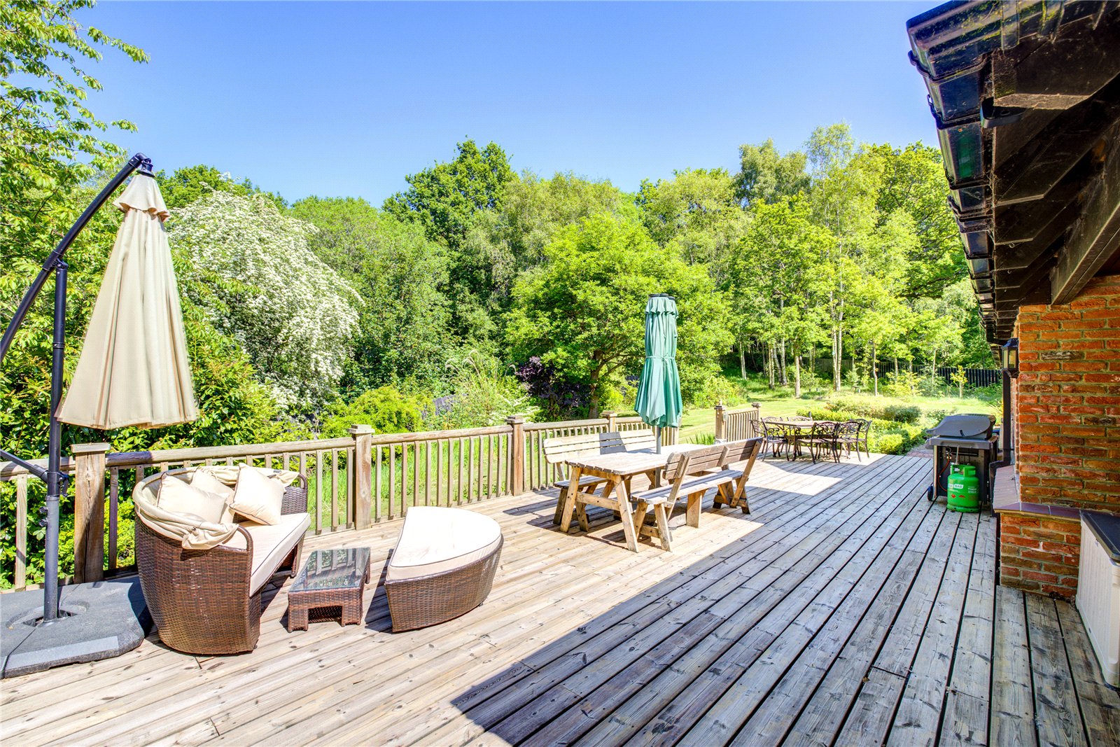 Set within approximately one acre of beautifully landscaped gardens, the outdoor space is nothing short of spectacular. Expansive green lawns provide a picturesque extension of the home, perfect for both relaxation and recreation. The wrap-around decked terrace offers an idyllic setting for al fresco dining and outdoor entertaining.