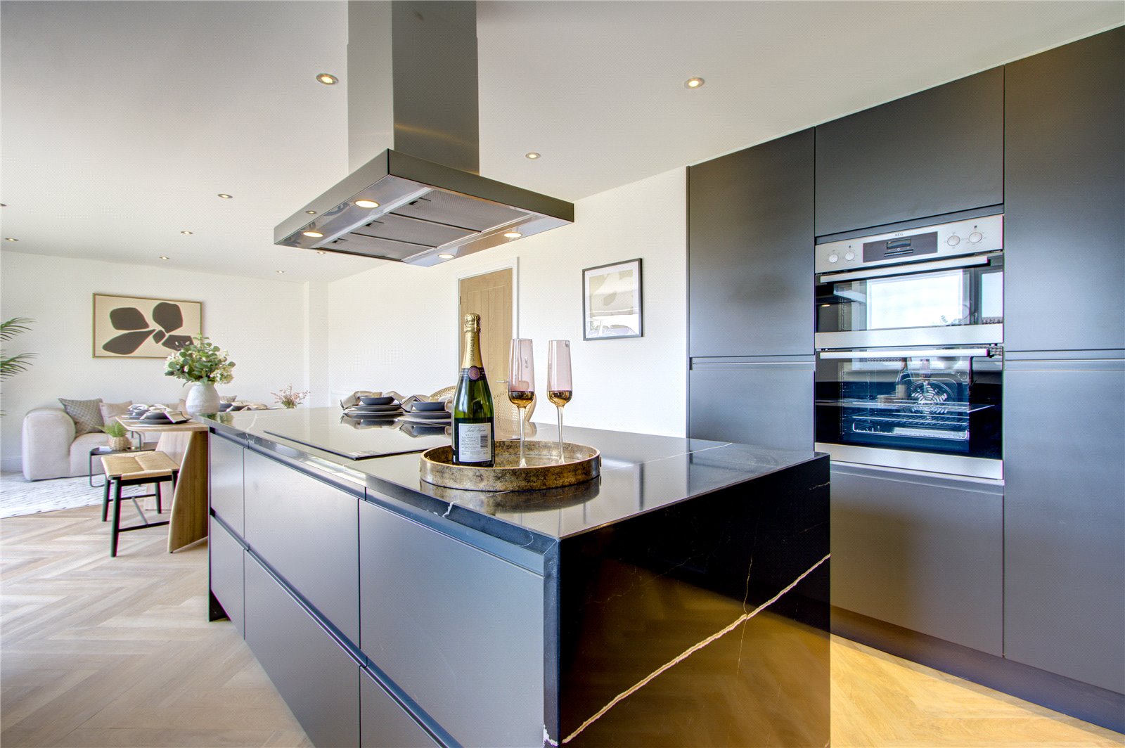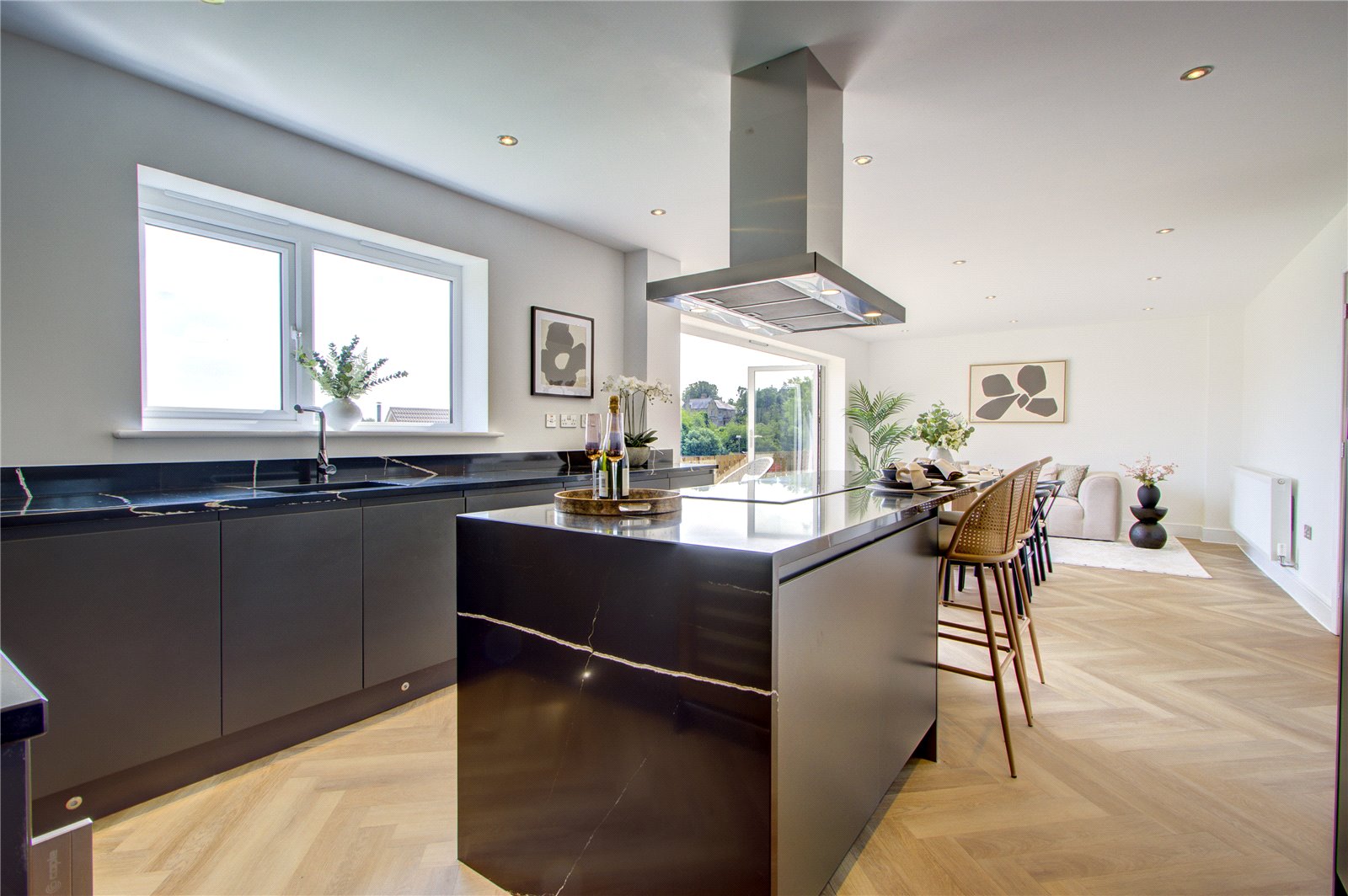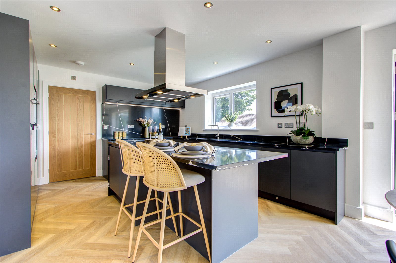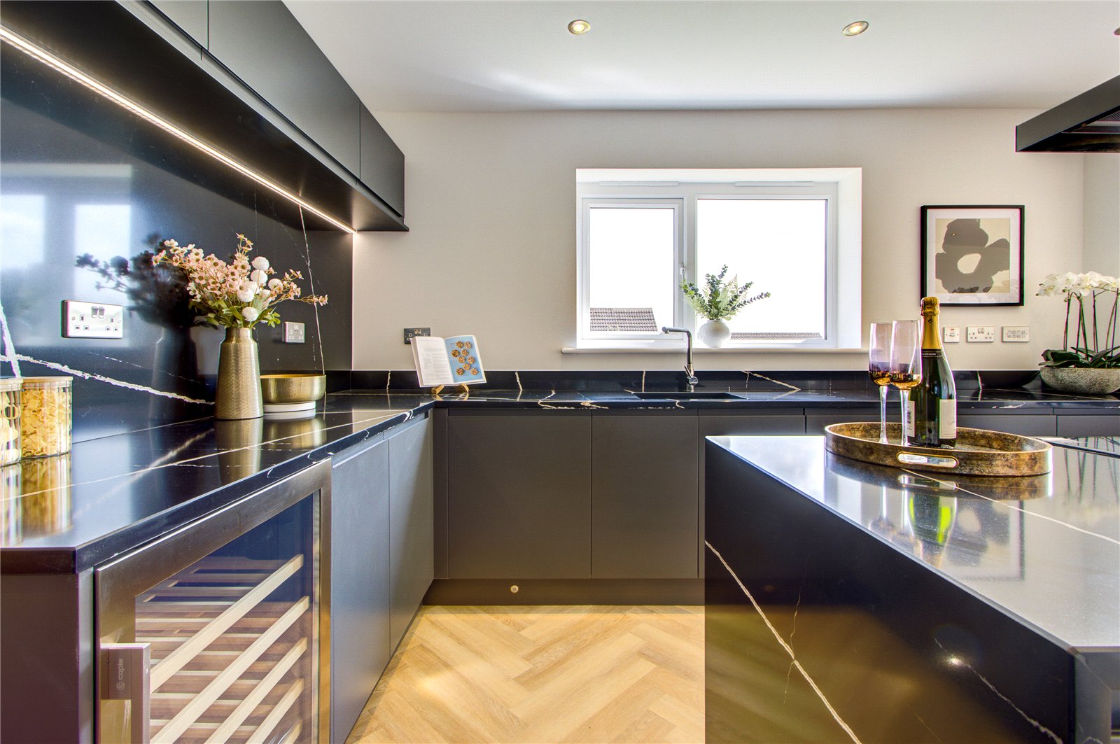 The kitchen itself is a true highlight, combining contemporary design with practical functionality. A central island, complete with hob and sleek ceiling extractor, anchors the space, while high-spec integrated appliances—including a fridge/freezer, wine fridge, and double oven—ensure convenience and style. Ample storage solutions enhance the clean, streamlined aesthetic.
