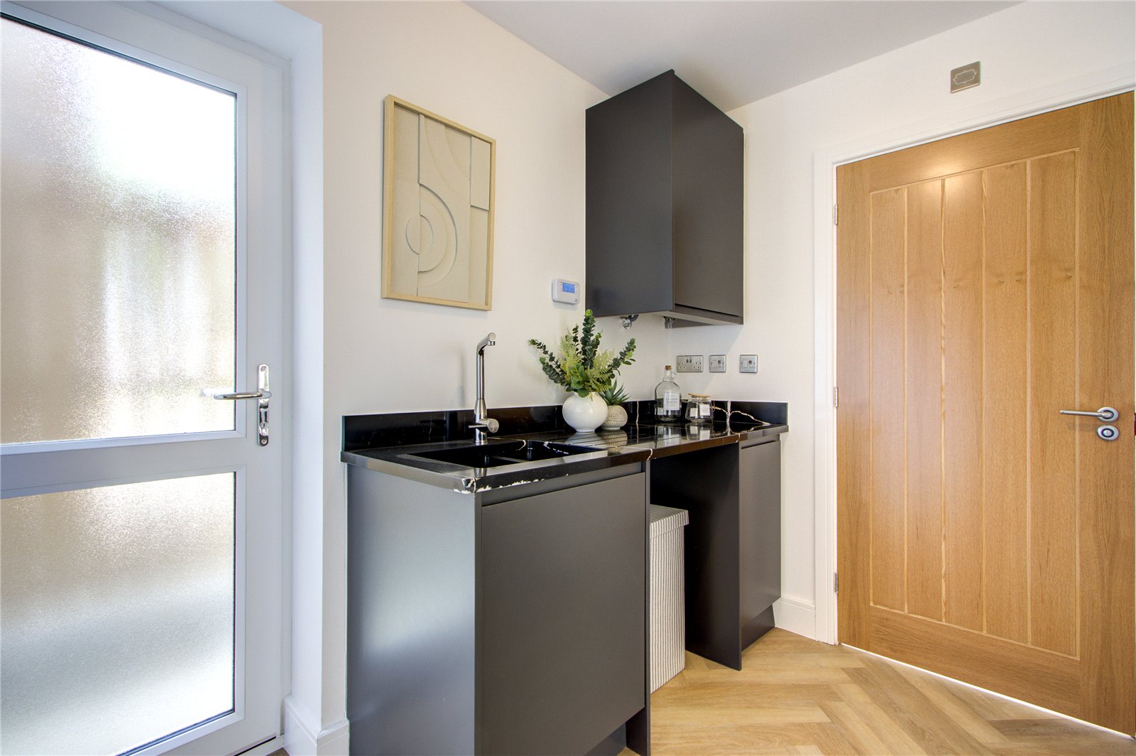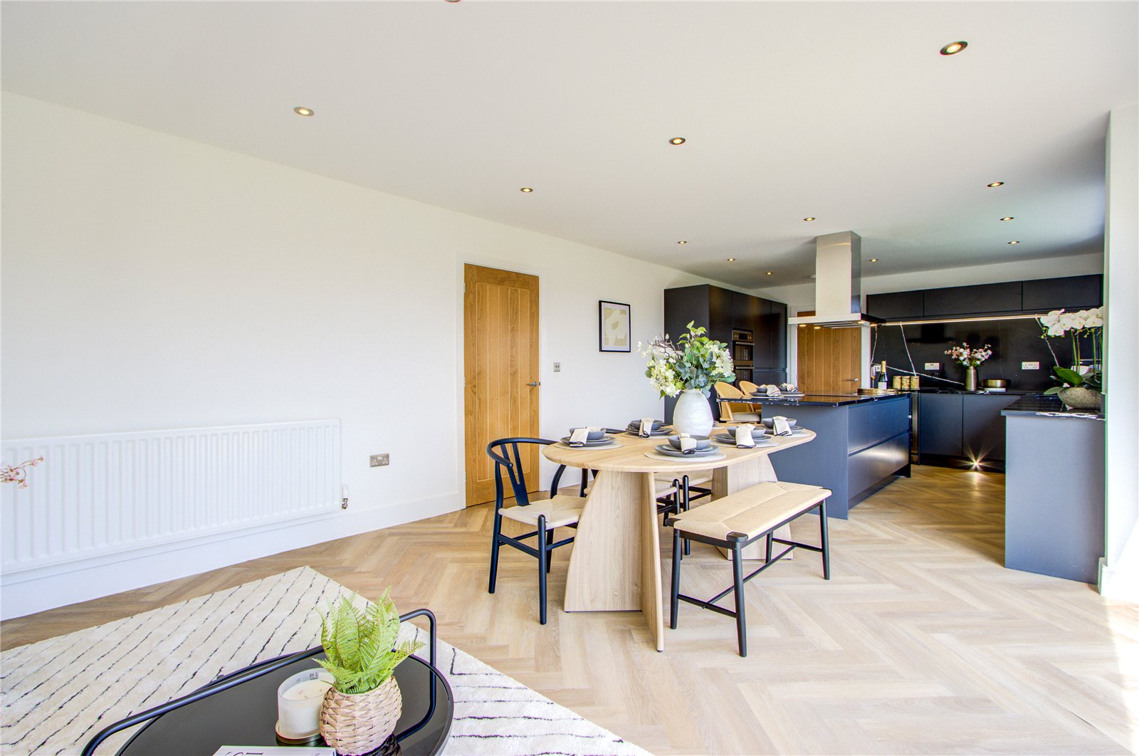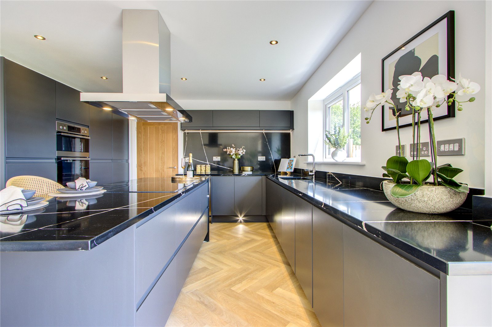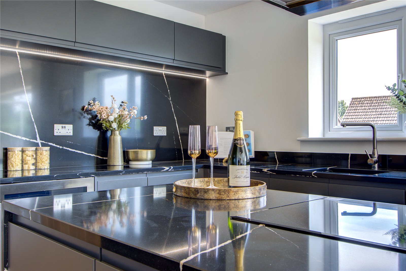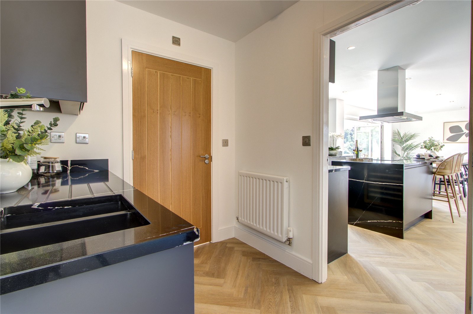 The kitchen itself is a true highlight, combining contemporary design with practical functionality. A central island, complete with hob and sleek ceiling extractor, anchors the space, while high-spec integrated appliances—including a fridge/freezer, wine fridge, and double oven—ensure convenience and style. Ample storage solutions enhance the clean, streamlined aesthetic.