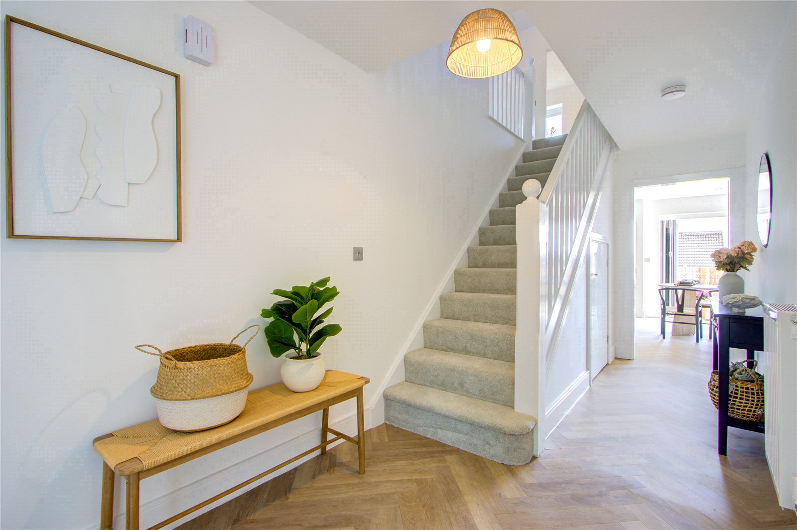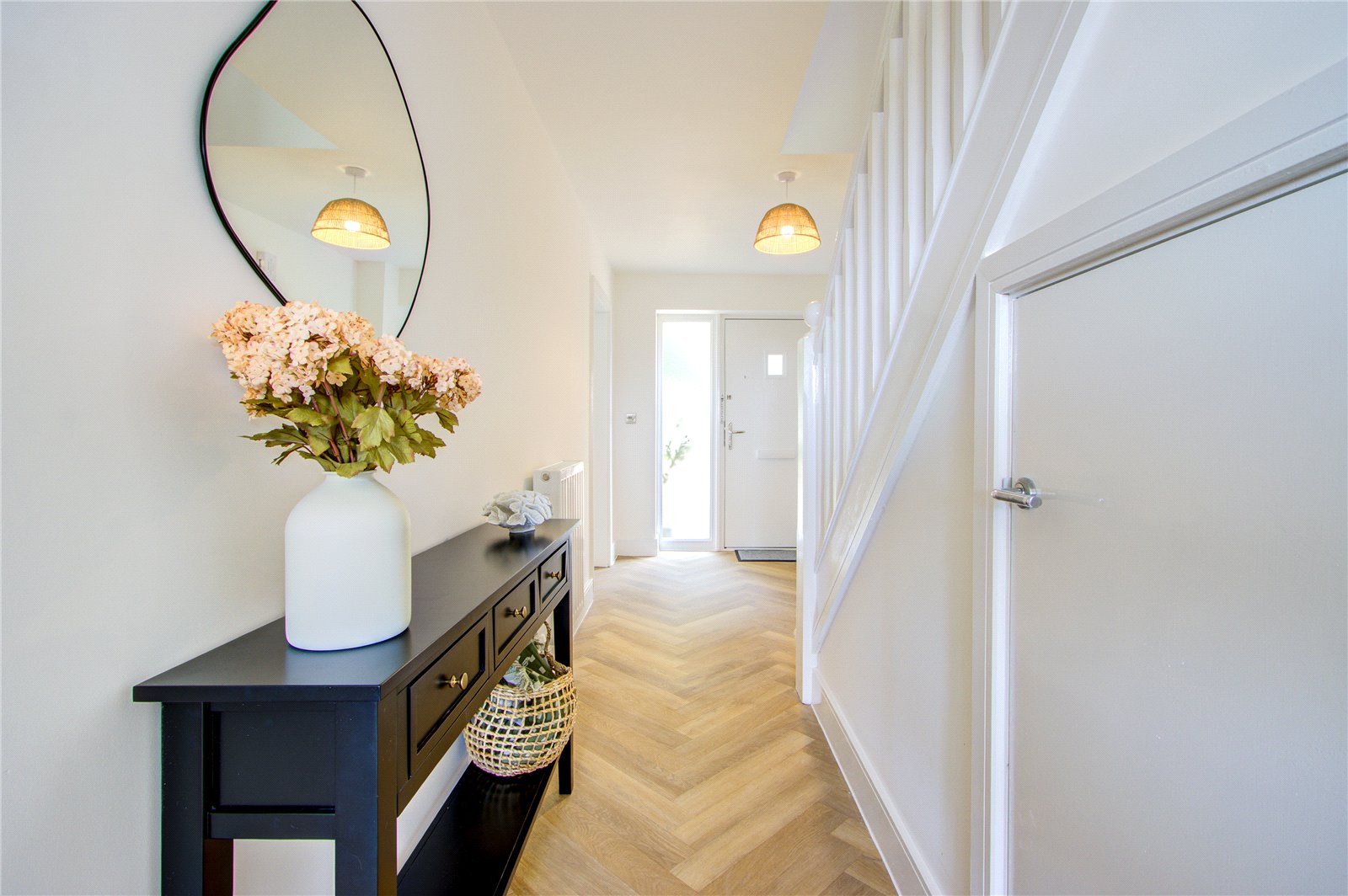 The generous entrance hall immediately sets the tone for the home’s impeccable style, featuring elegant herringbone flooring that seamlessly flows into the beautifully curated, light-filled kitchen/dining space.