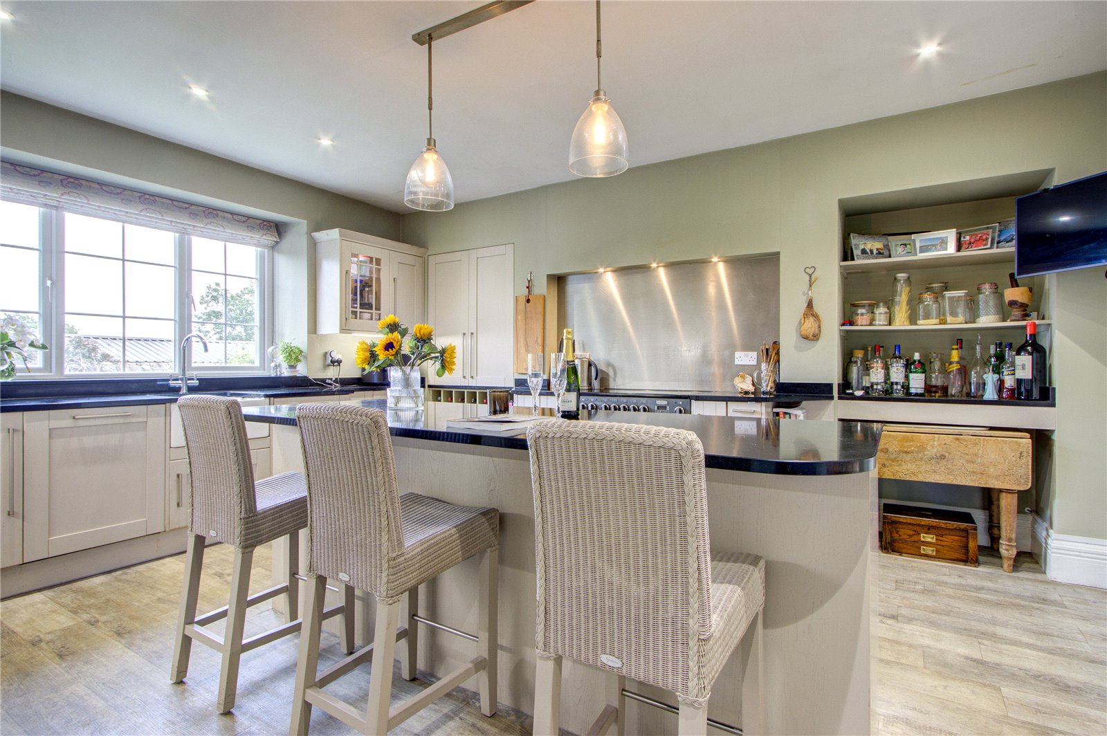 At the heart of the home lies the expansive farmhouse-style kitchen, a wonderful space for family life and entertaining alike. Featuring an excellent range of bespoke fitted cabinetry, a large central island and ample room for casual dining, this kitchen invites everything from early morning coffees to weekend baking sessions and relaxed gatherings with friends. It's a true hub of the home, where functionality meets character.