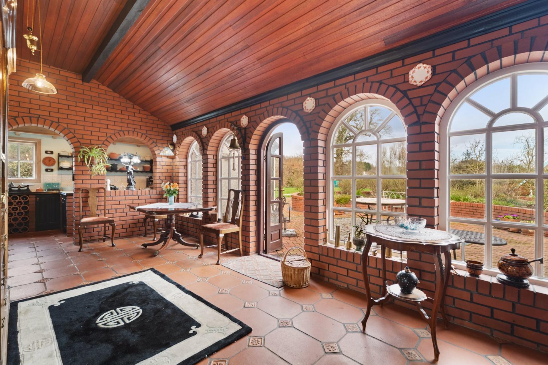 Continuing the journey, discover the Mediterranean-inspired kitchen/breakfast room, where red brick accents and the arched glass windows and doorway frame picturesque views of the garden and outdoor pool area. Entertaining is effortless here, with ample space to create culinary delights while enjoying the company of loved ones.