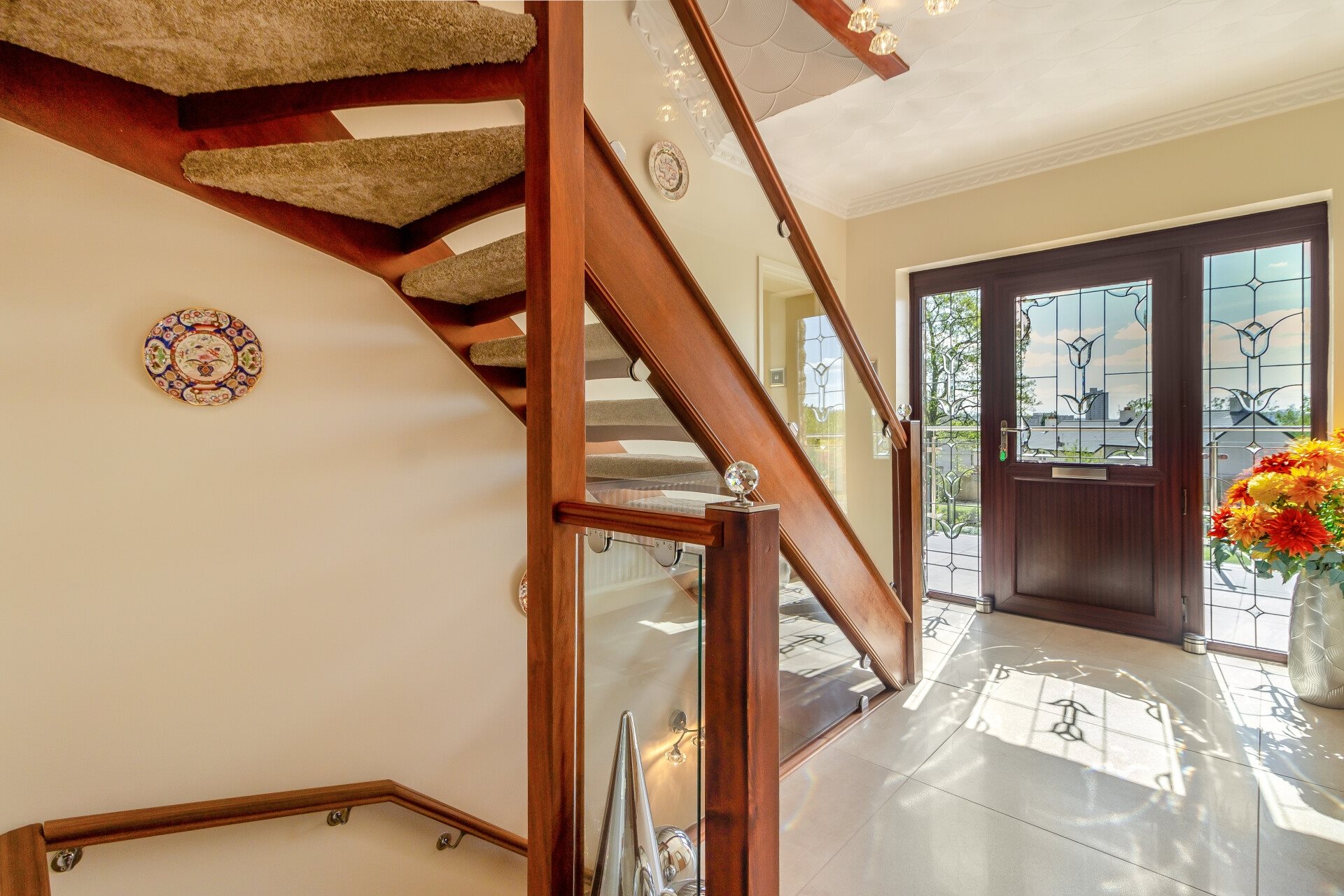 As you step into the welcoming entrance hall, you're immediately drawn into the spacious family dining room. This generous space is perfect for gatherings and includes direct access to a balcony, where you can enjoy panoramic views of your beautifully landscaped garden.