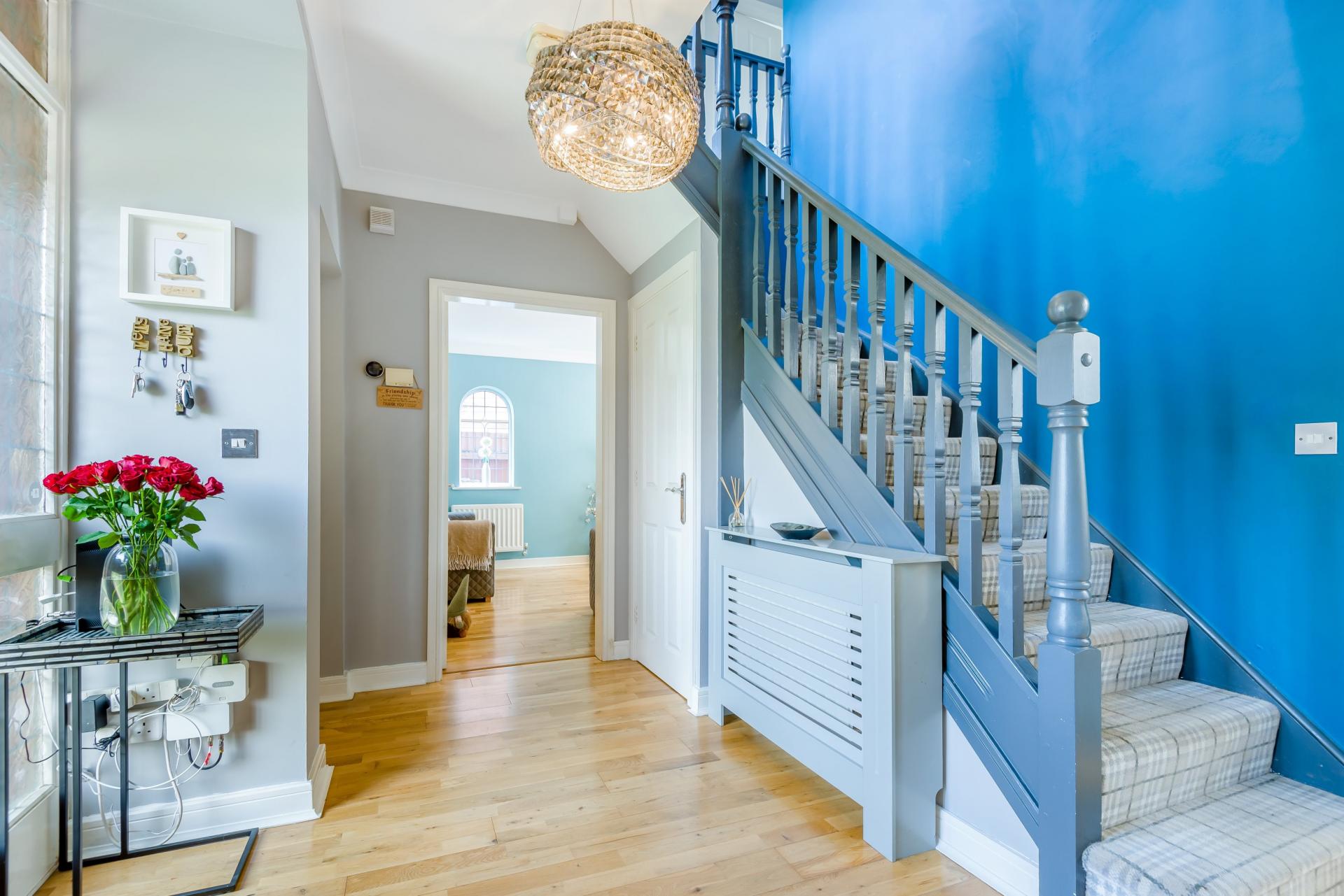 Step inside - From the front driveway, a path leads down the side of the garage to the front door, inset under an arched open fronted porch. The door opens to a hallway, with a wooden floor and doors leading off to the main ground floor rooms and to a downstairs cloakroom, finished in striking green Metro tiles. A staircase rises to the first floor and there is a useful under stairs storage cupboard.
