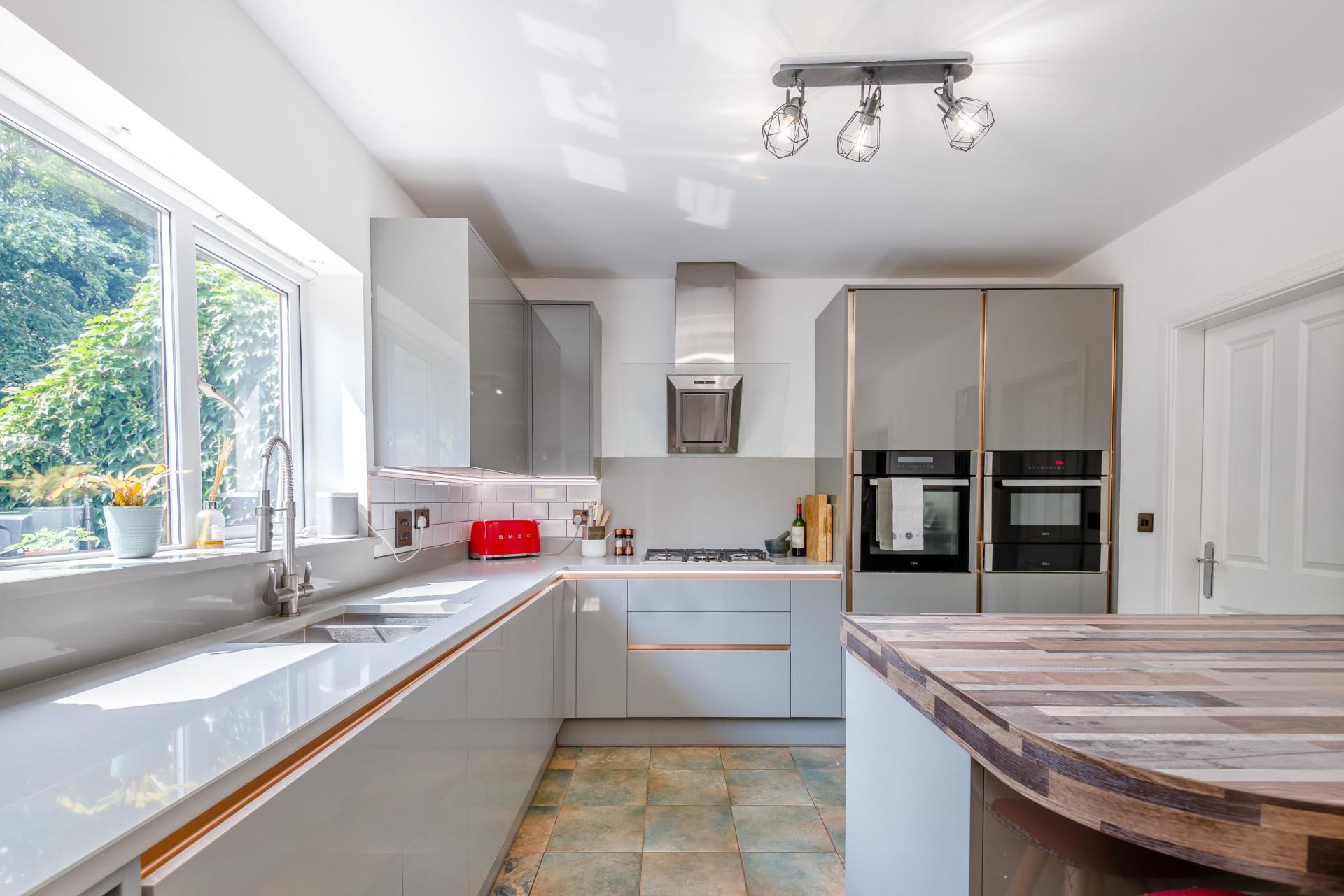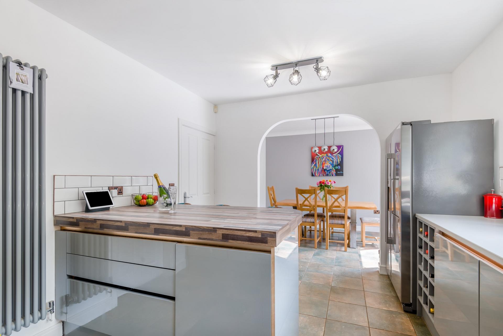 The heart of this family home is the spacious, open plan kitchen/dining room, which is located at the rear of the property, overlooking the well-maintained, enclosed gardens. The sleek, contemporary-style kitchen has been recently fitted with attractive grey high gloss units and incorporates a selection of integrated appliances, whilst there is also ample space for a freestanding fridge freezer. A large central island doubles up as a breakfast bar. Off the kitchen there is a useful utility room with space and plumbing for a washing machine and tumble dryer.