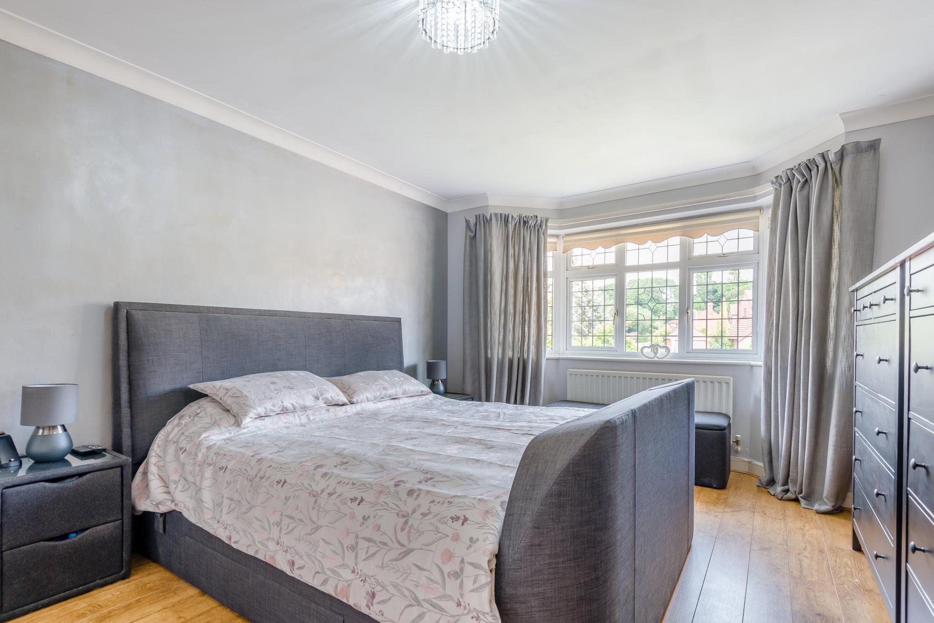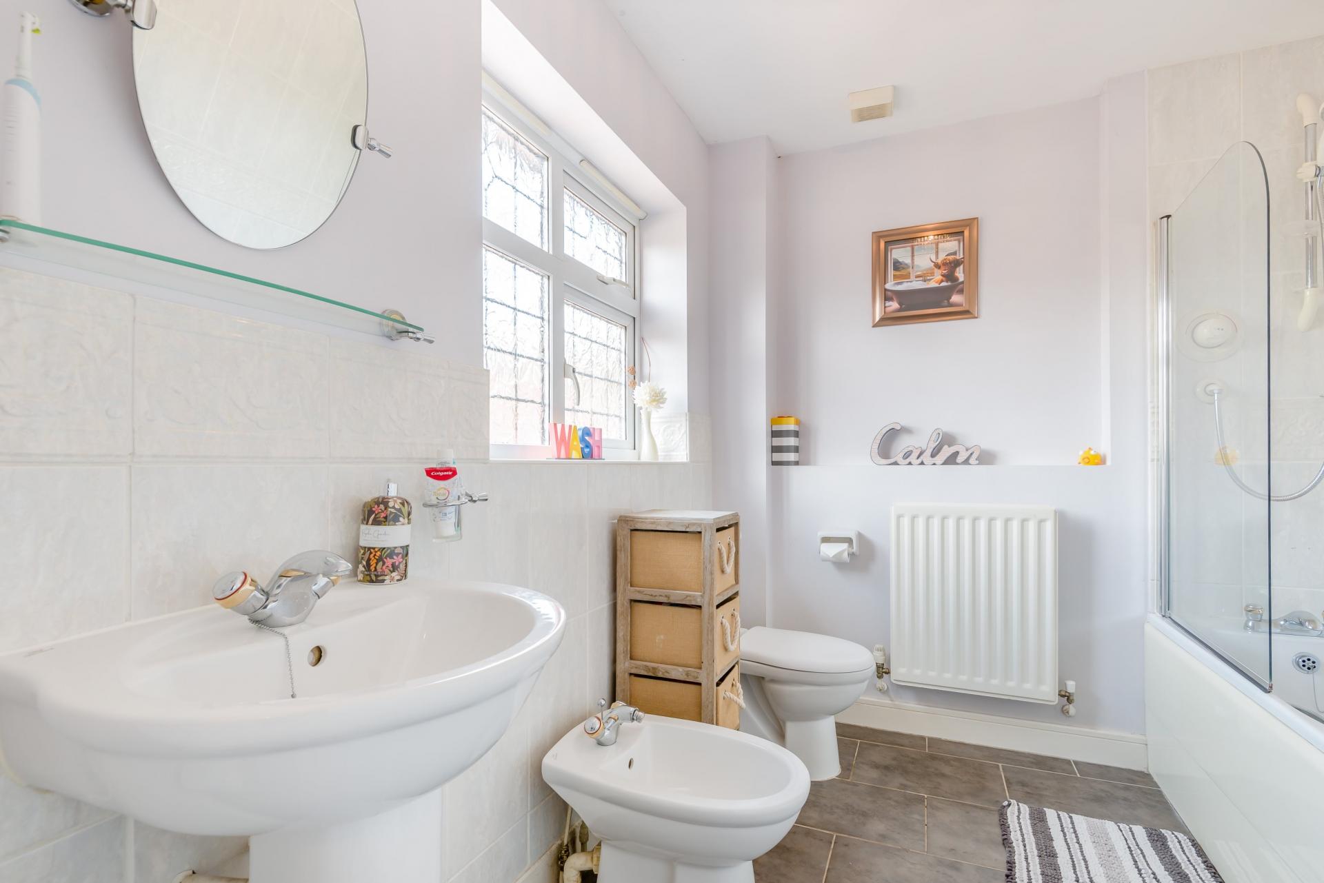 On the first floor, a light and airy landing leads to four double bedrooms. The generous main bedroom has a bay window overlooking the front of the property and benefits from attractive, contemporary-style, built-in wardrobes. It also has a luxurious ensuite bathroom with both a bath and a step-in shower cubicle with a power shower.