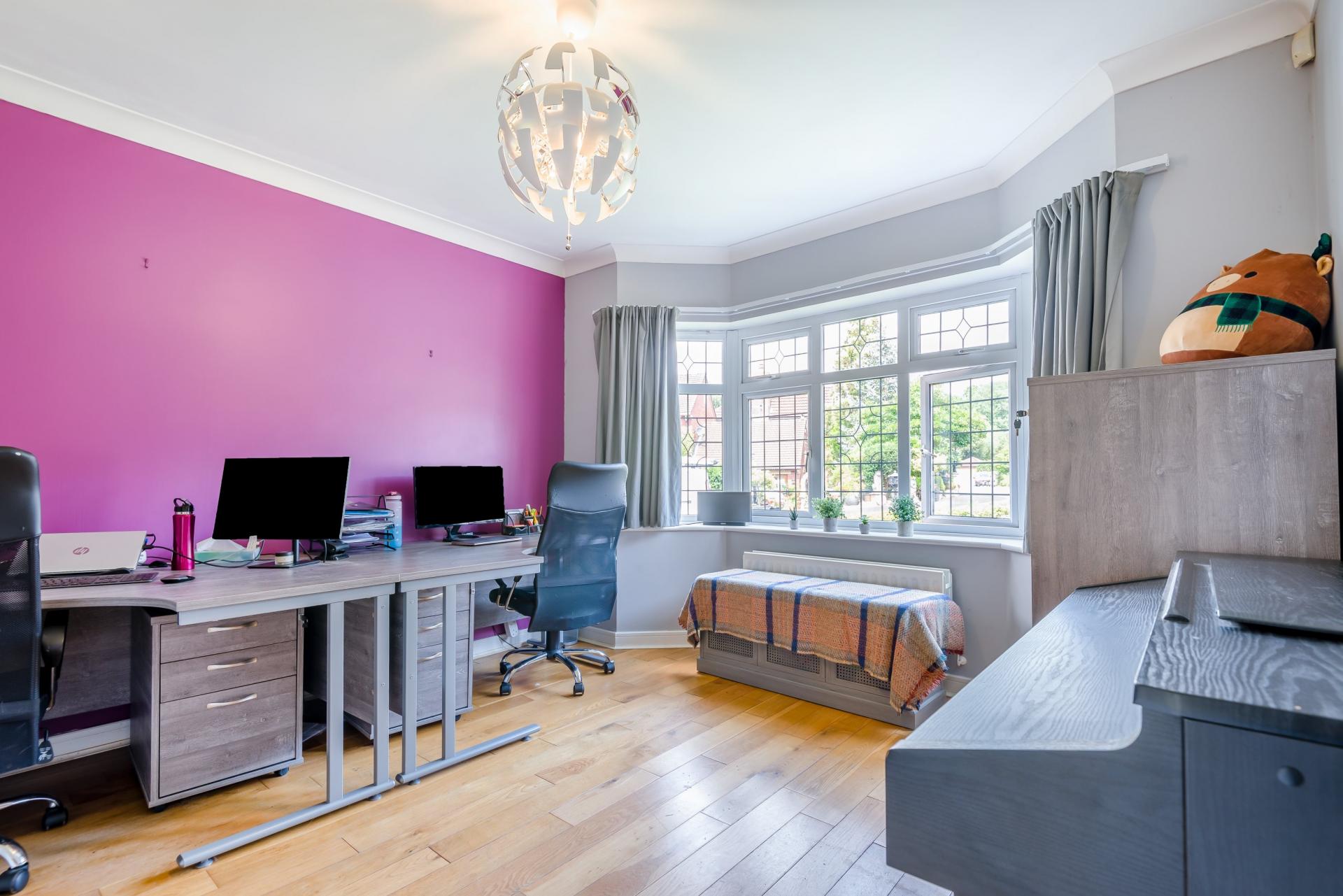 There is a further reception room with a bay window overlooking the front of the house. Currently used as a study, it would also make a lovely sitting room or TV room. If further family living space should be required, the integrated double garage provides potential for conversion, subject to planning.