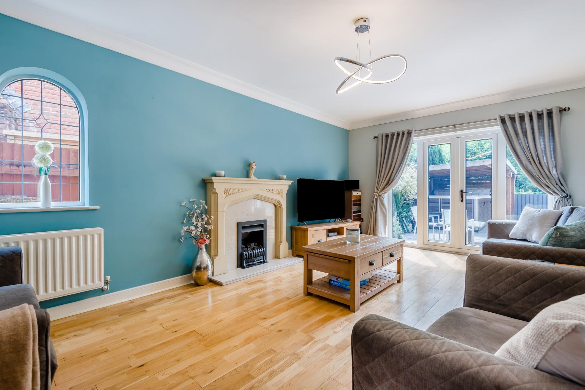 The living room is situated adjacent to the dining area and also has double glazed French doors to the rear patio. It is a spacious and elegant reception room, with a coved ceiling, an arched window to one side and a feature fireplace housing a gas fire.