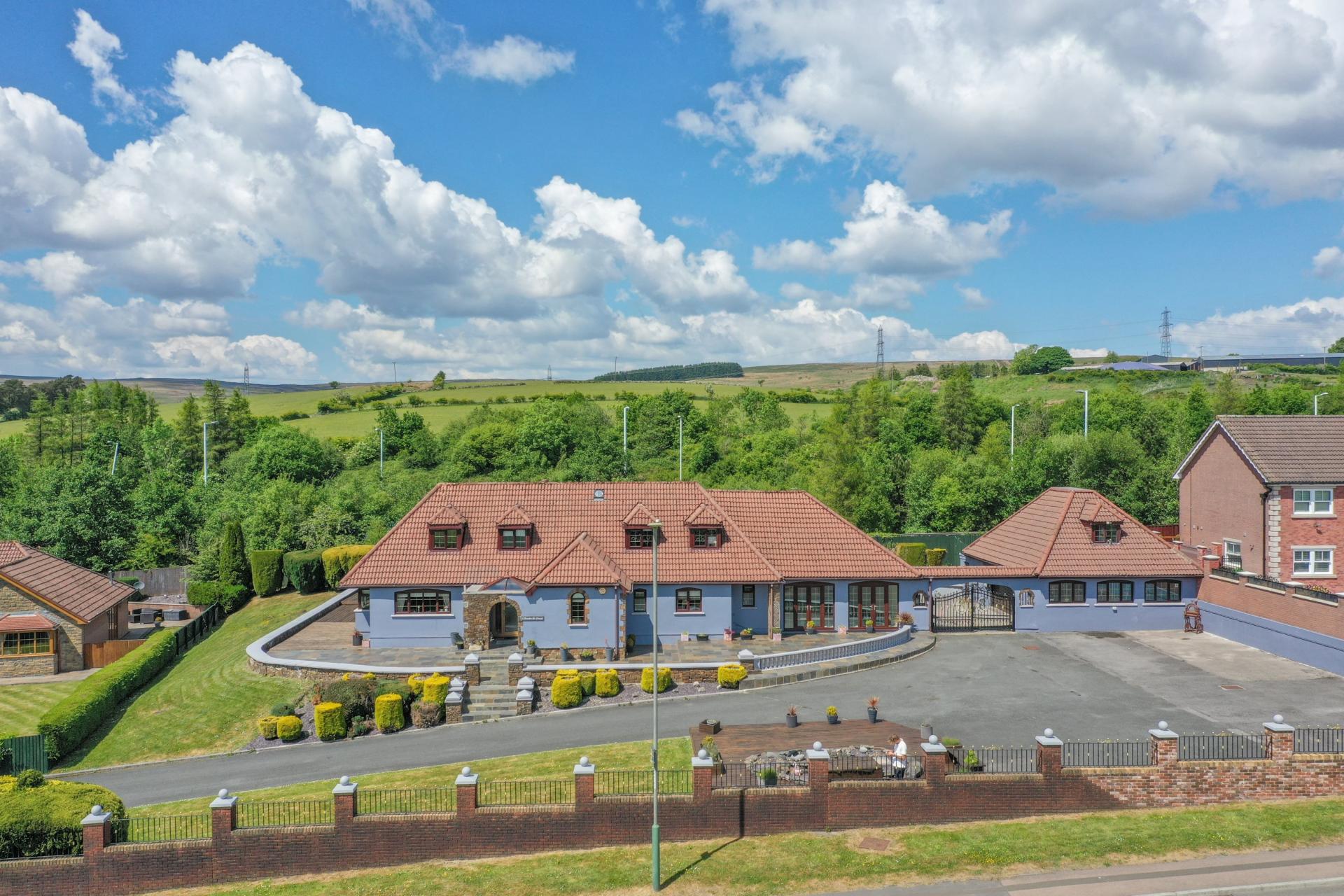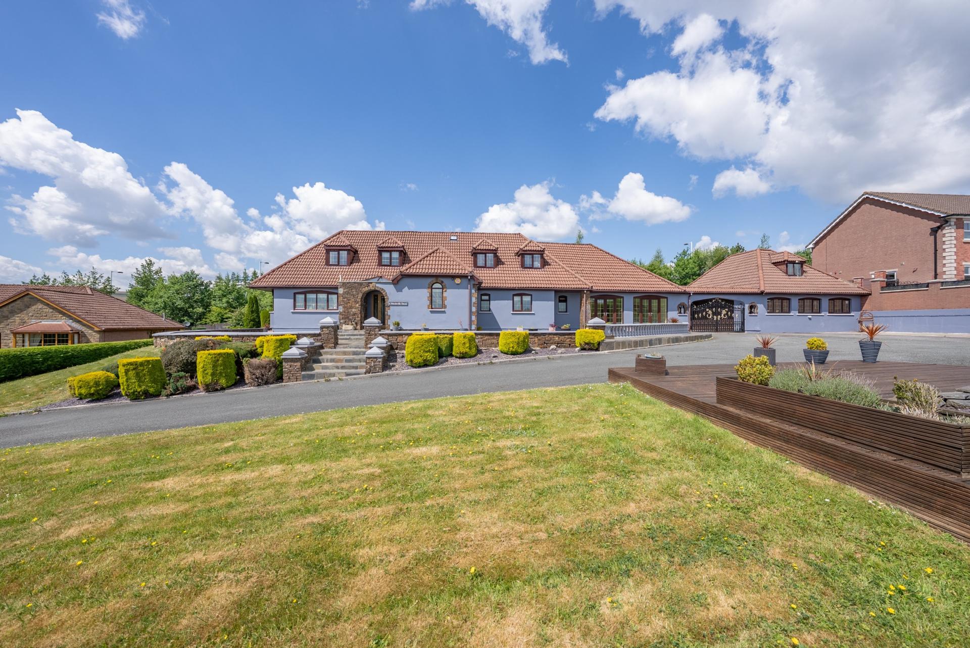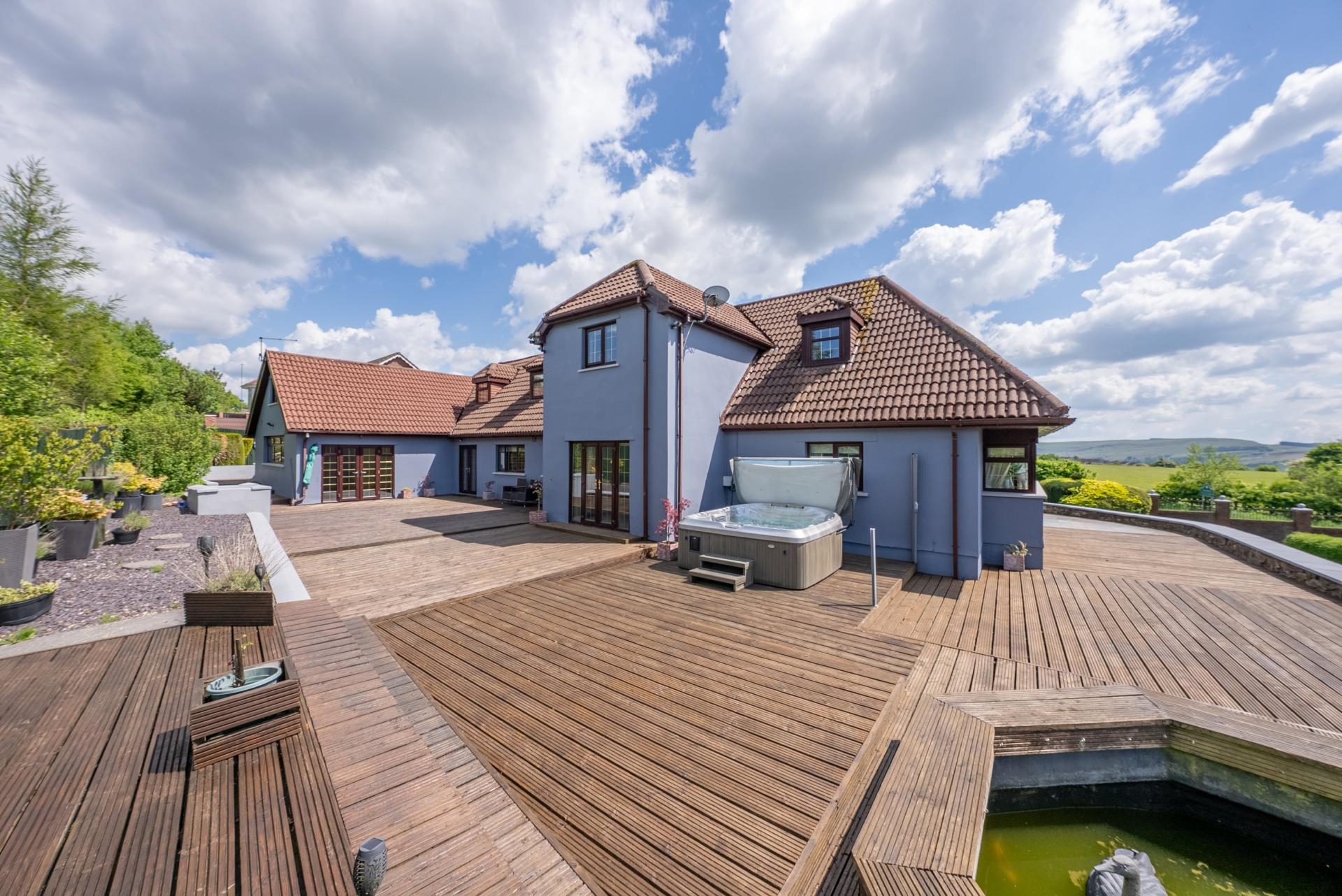 Outside - Externally, the property continues to impress. A detached double garage with electric doors is accompanied by two versatile storage rooms and an upper-level gym or home office ideal for remote working, fitness, or creative pursuits. A double gated driveway ensures generous private parking, while the gardens are thoughtfully landscaped to provide a tranquil haven, with lush lawns, patio terraces, a decked seating area, and two ornamental ponds all framed by mature trees and mountain vistas.