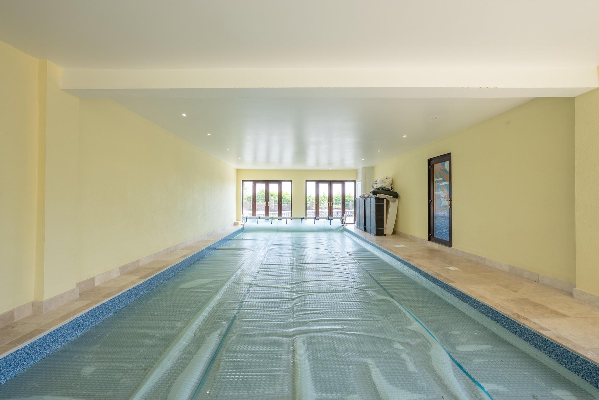 - Luxurious indoor swimming pool suite with shower area and French doors opening to decked gardens