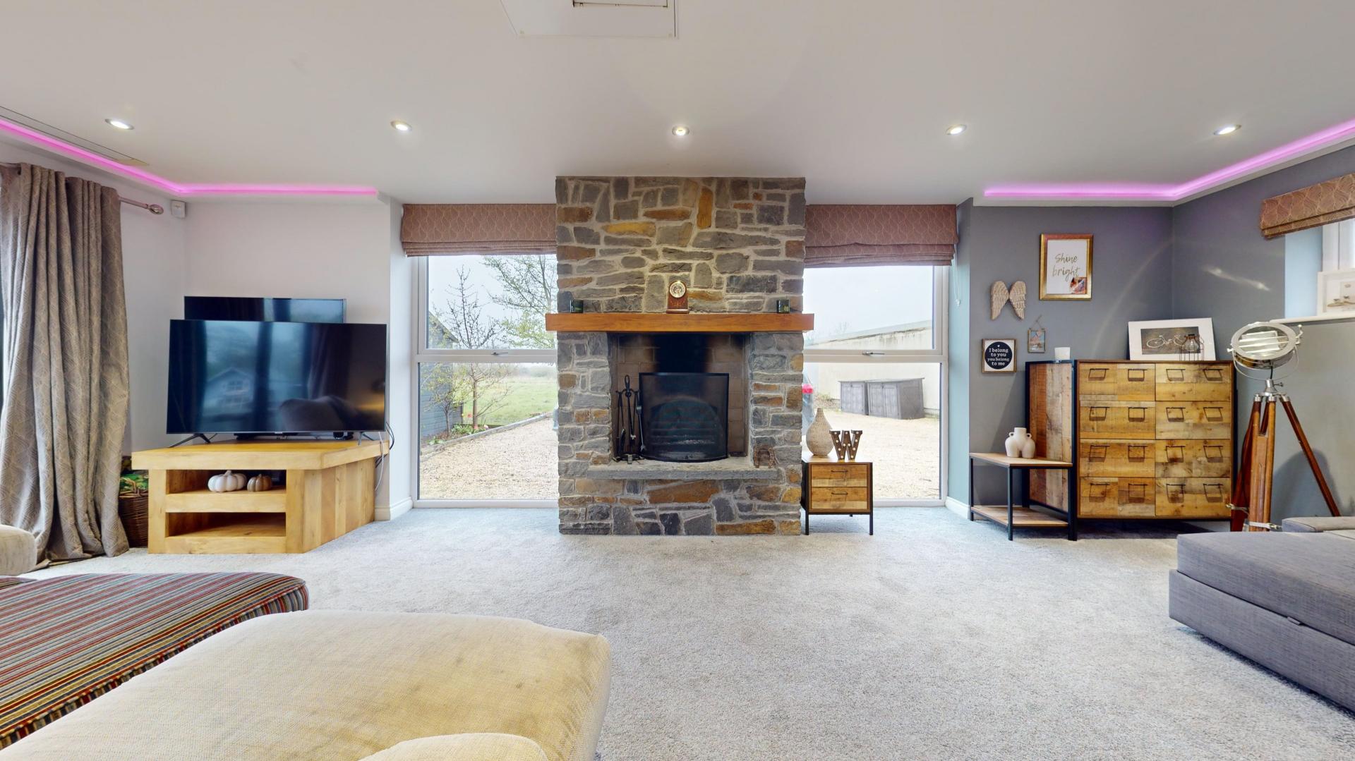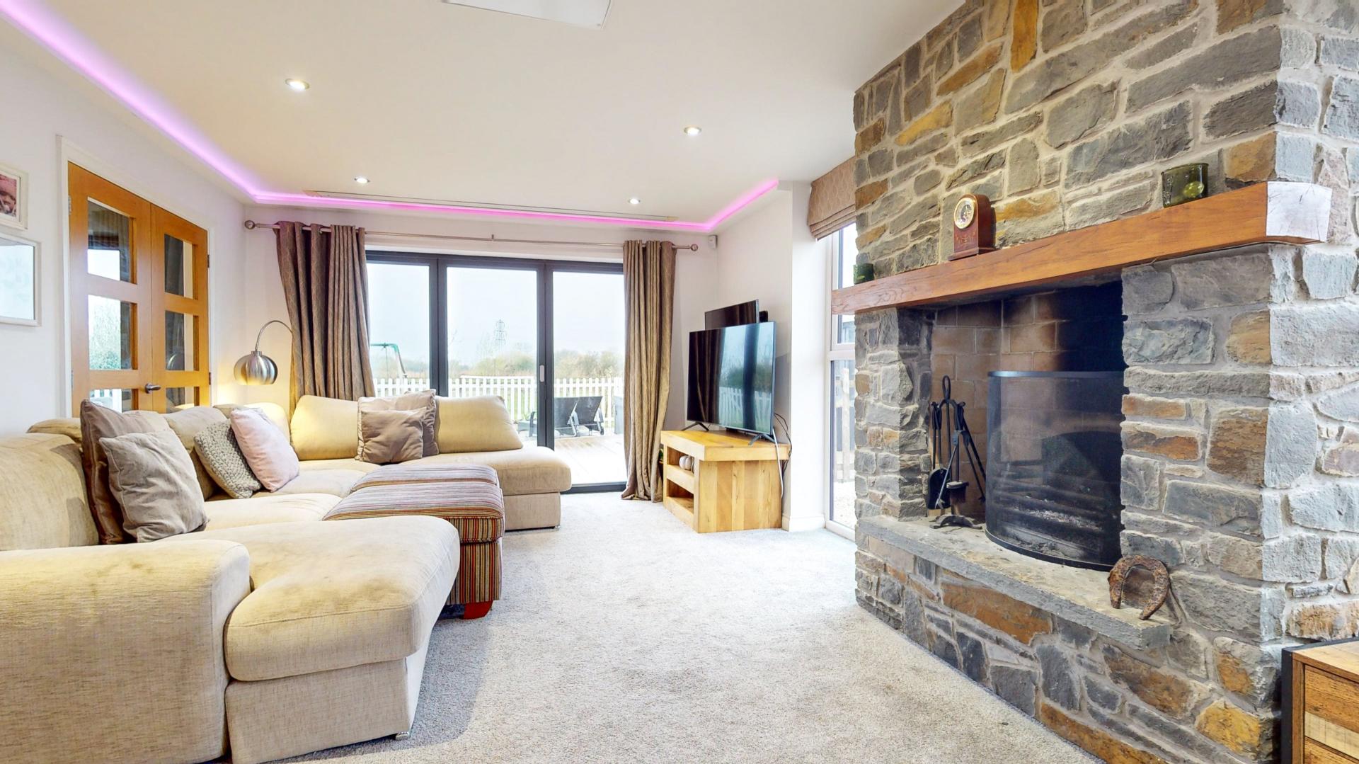 Stepping inside, you're enveloped in a contemporary cottage ambiance. The tiled hallway leads to the main sitting room, featuring a striking stone fireplace and abundant natural light streaming in from its double aspect outlook. A glass staircase adds a touch of sophistication, while the nearby downstairs wc ensures practicality.