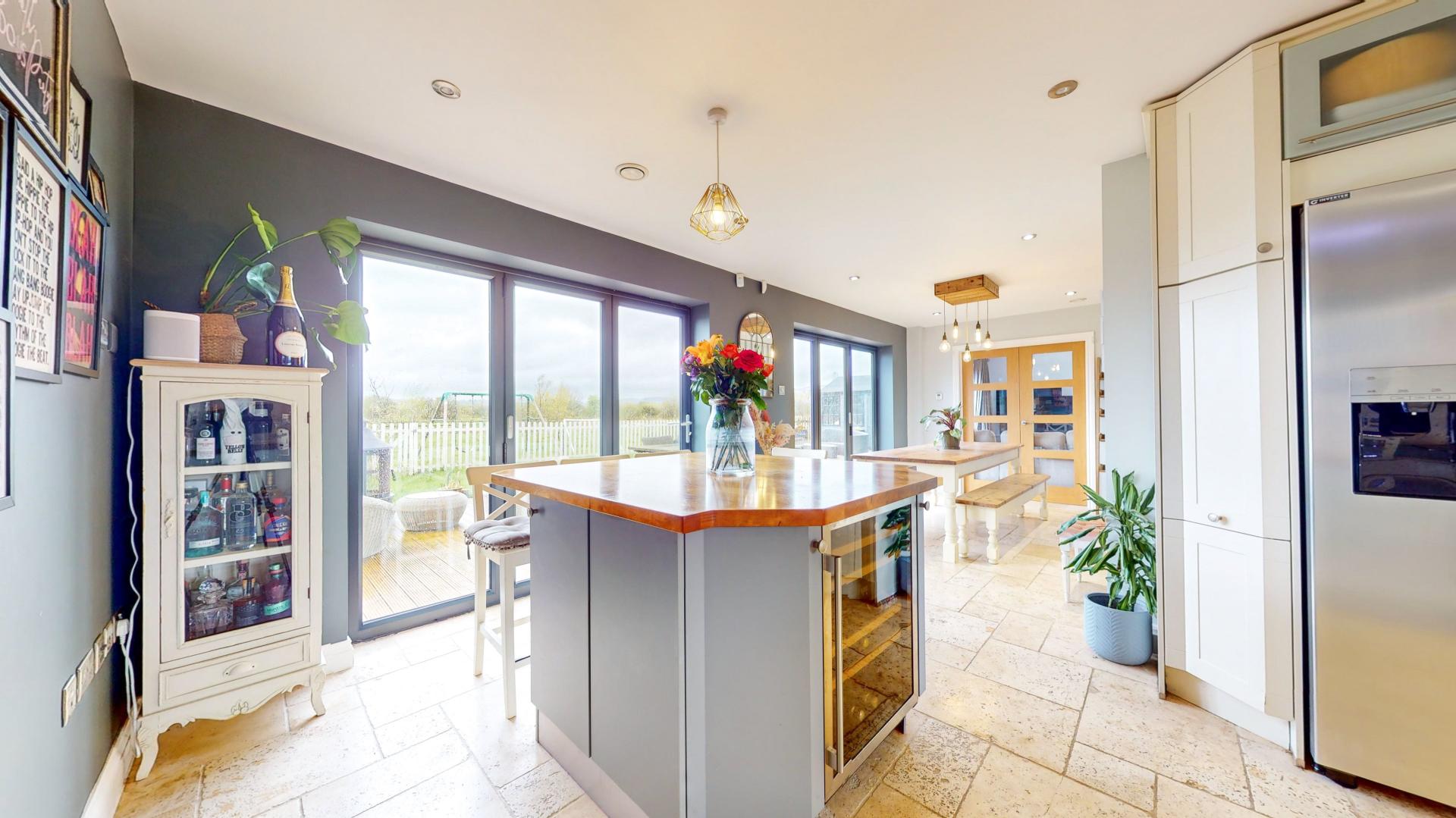 The kitchen/dining room serves as the focal point of family gatherings, boasting ample storage, integrated appliances, and a generous island/breakfast bar. A unique glass window feature accentuates the space, offering a seamless connection to the hallway and staircase. Two sets of expansive bi-fold doors open onto the private rear garden, facilitating effortless indoor-outdoor living ideal for summer BBQs and gatherings. Double doors provide access to the main living room, enhancing the flow of the home.
