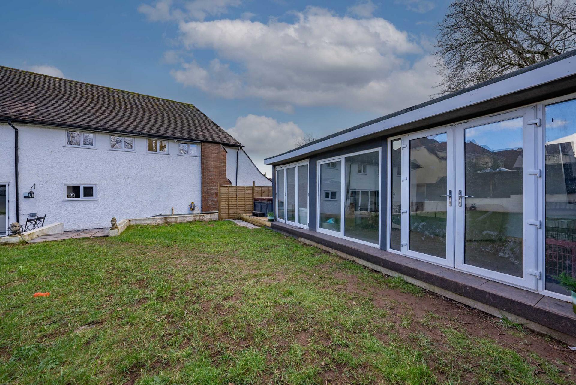 At the rear there is a large flat lawned garden with patio area, surrounding fencing, hot tub and an extensive summerhouse with bi-fold doors and toilet facilities within.