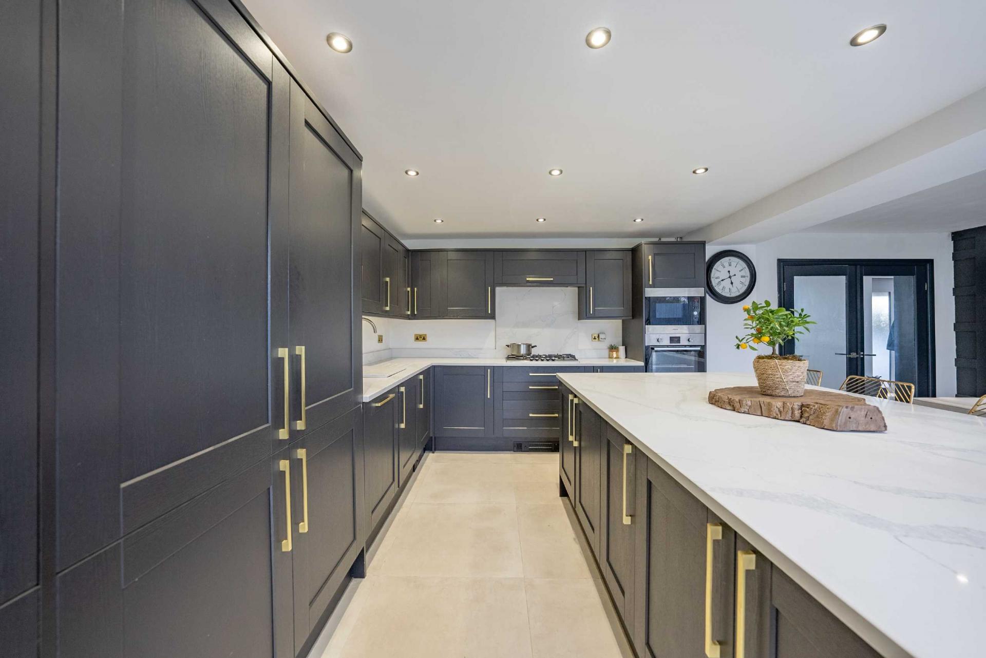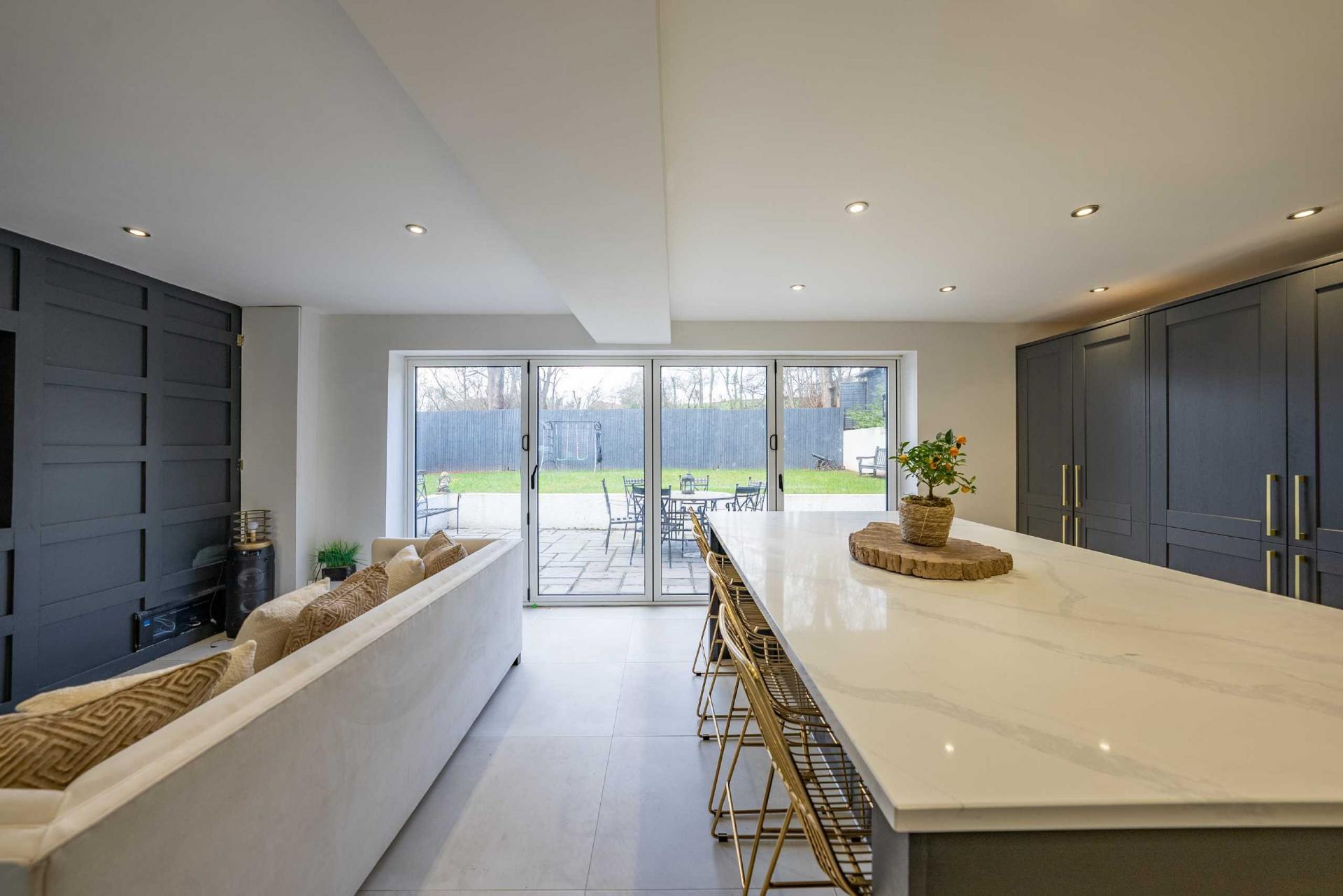KITCHEN / DINER - 6.61m x 4.53m - Black wall and base units with gold coloured door furniture, 1.5 bowl stainless steel sink unit, white quartz worktop and uplifts with integrated drainer, instant hot water mixer tap, five burner gas hob with extractor over, integrated fridge, freezer and dishwasher. Central island unit/breakfast bar with quartz work surface, seating for four diners, store cupboards beneath, built in oven and microwave. Ceramic floor tiling throughout, black panelled wall with tv recess, ceiling downlighters, bi-fold doors overlooking the rear garden. Hidden door access through kitchen units to: