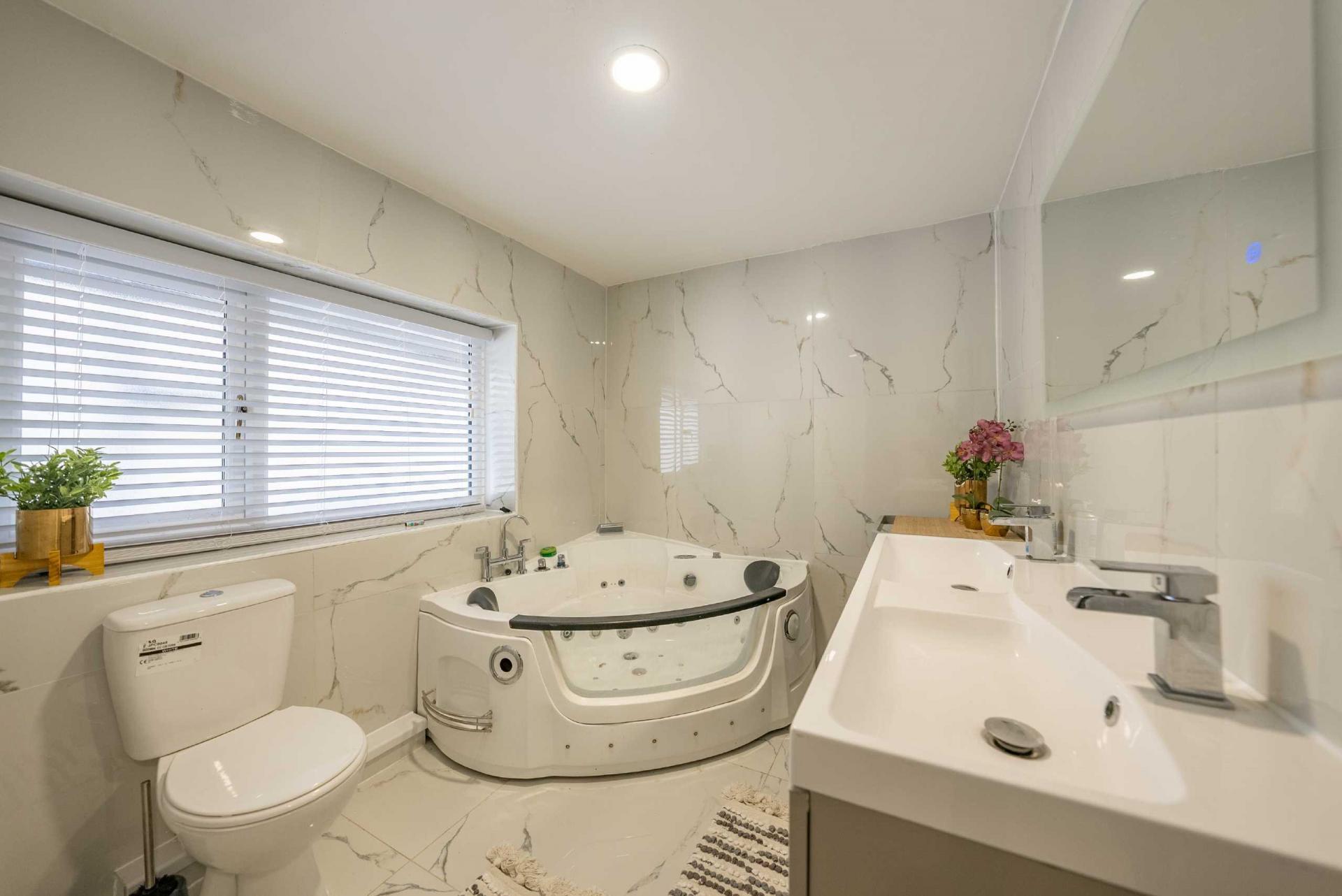 FAMILY BATHROOM - Marble tiling to walls and floor, radiator, rear facing window, w/c, corner spa bath, his and hers wash hand basins with vanity unit, ceiling downlighters.