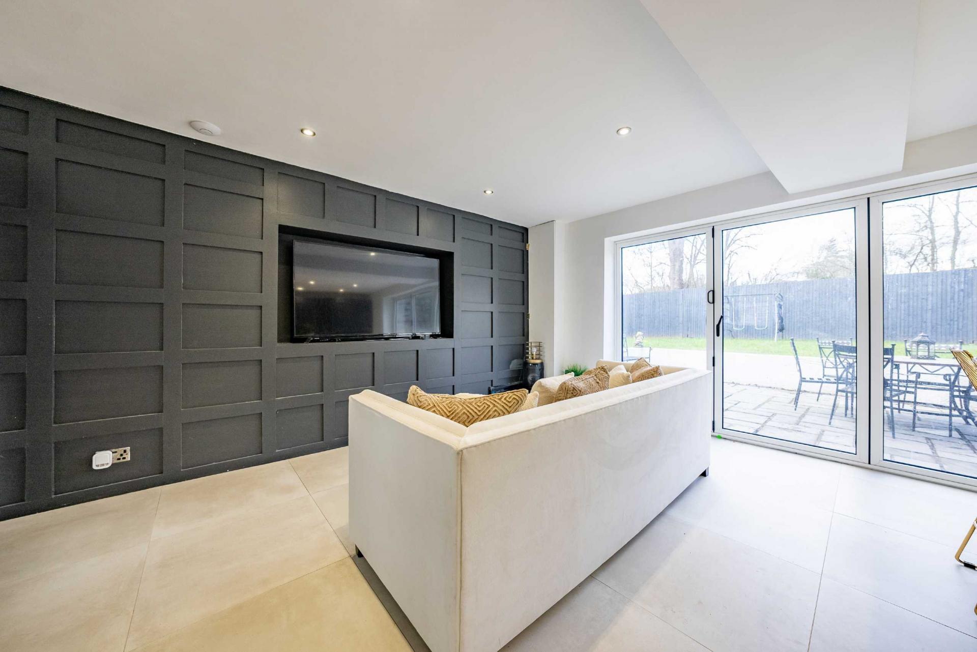 SITTING ROOM - 5.31m x 3.64m - Front facing window, radiator, side facing bi-fold doors, feature fireplace with inset coal effect electric fire, ceiling downlighters.