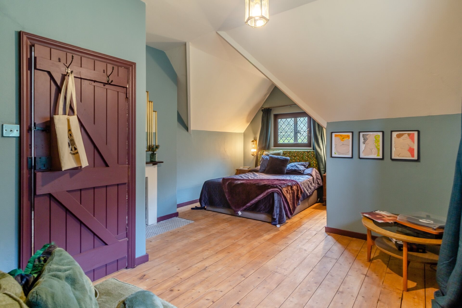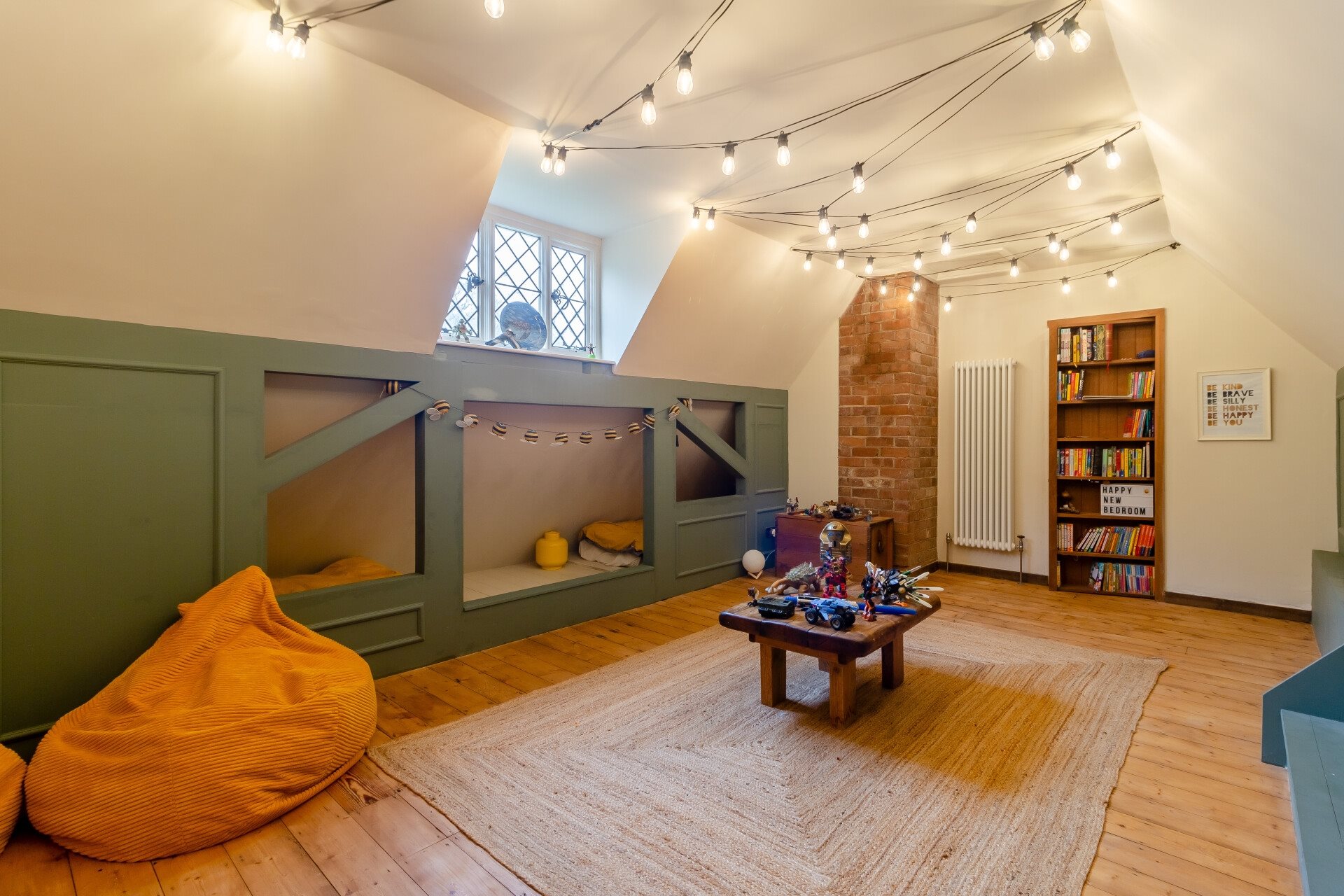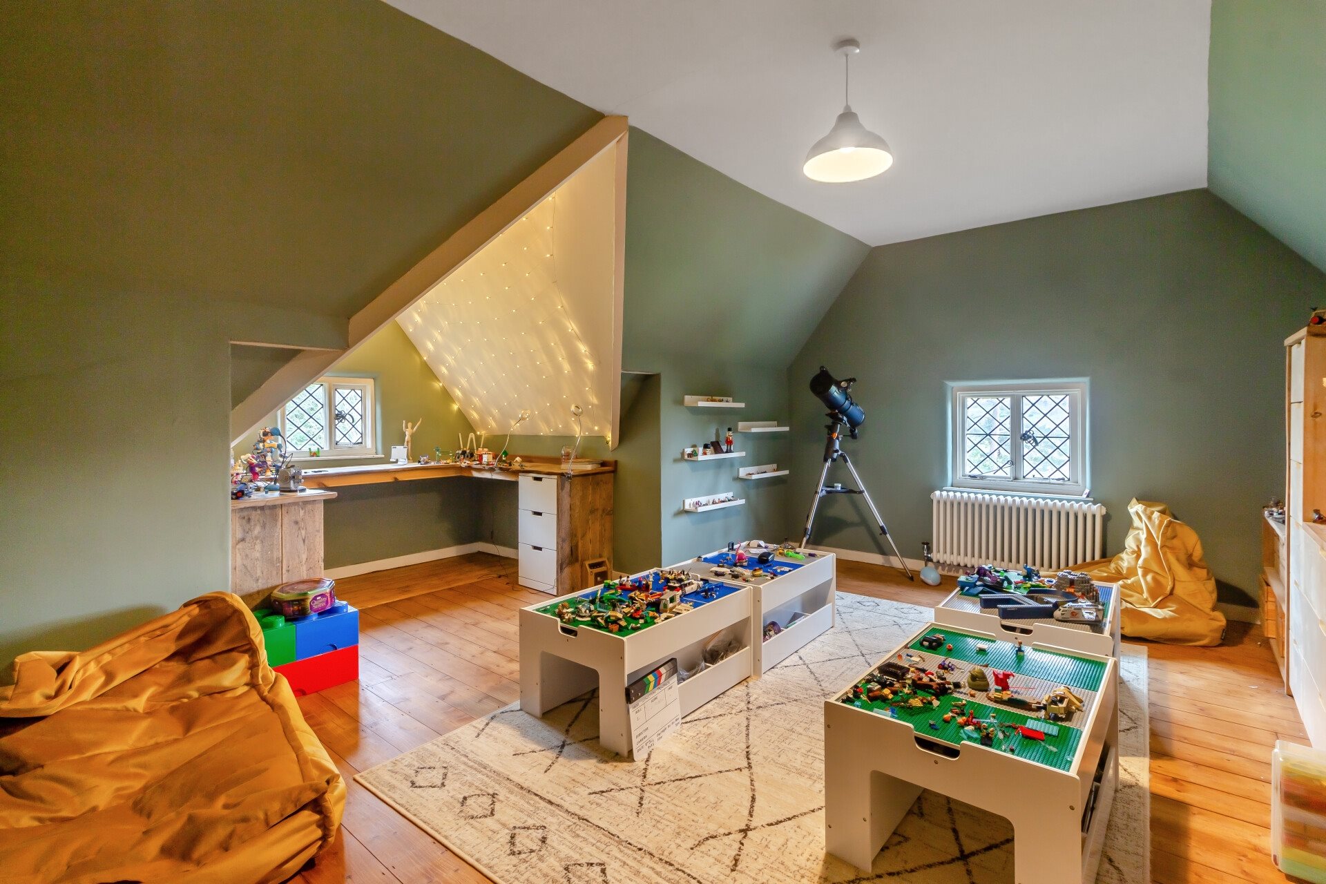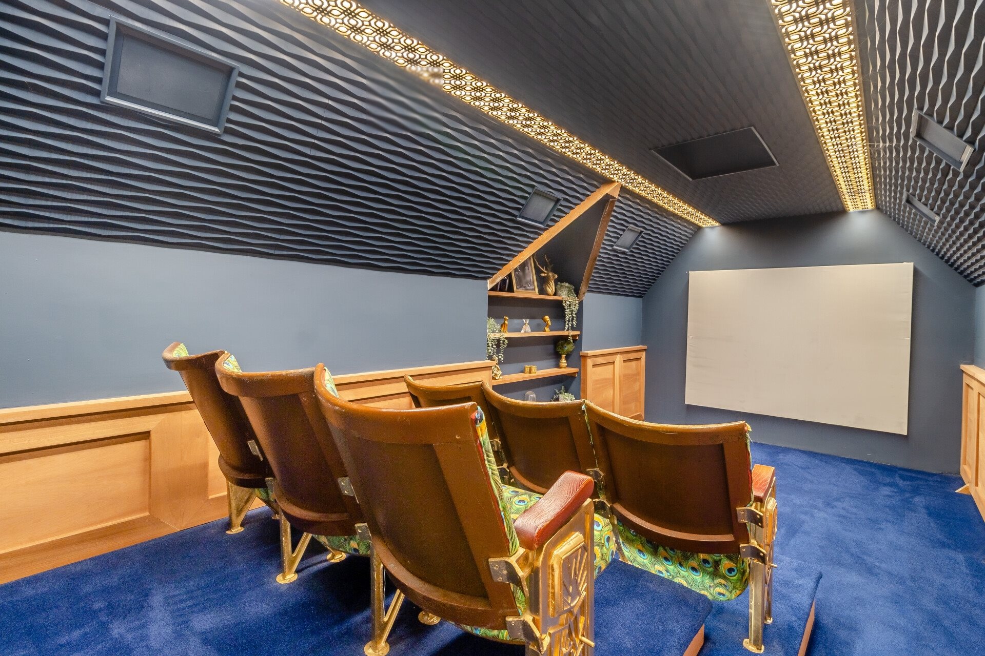 The top floor of Clomendy Wood is an exciting and innovative space. Among the highlights is a beautifully renovated 'bunk room,' tucked into the eaves, offering a fun and creative sleeping space. One of the showstoppers of the home is a bespoke cinema room, soundproofed and equipped with a theater-style setup, featuring original stall-style chairs from a London theatre a truly special feature for cinema lovers.