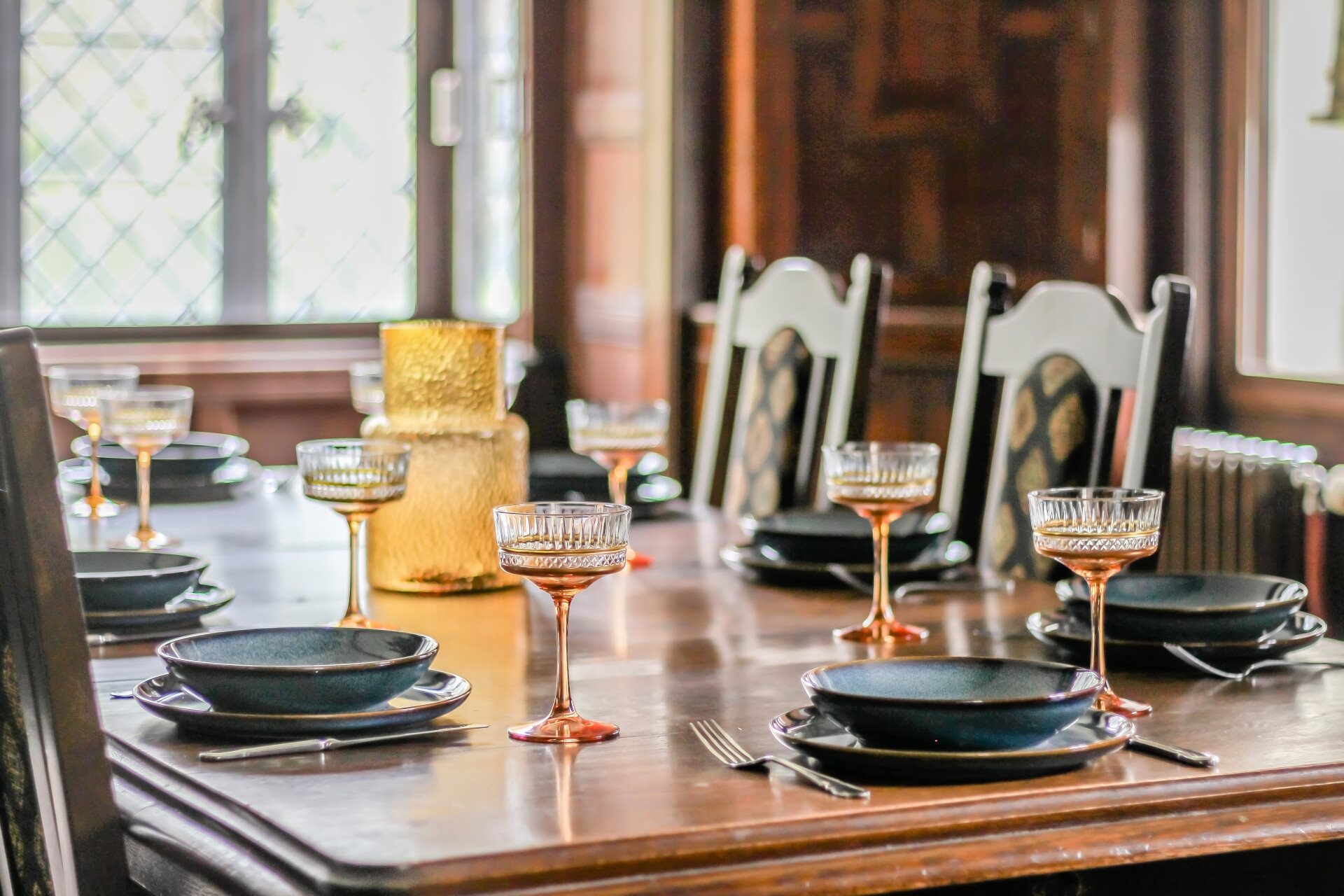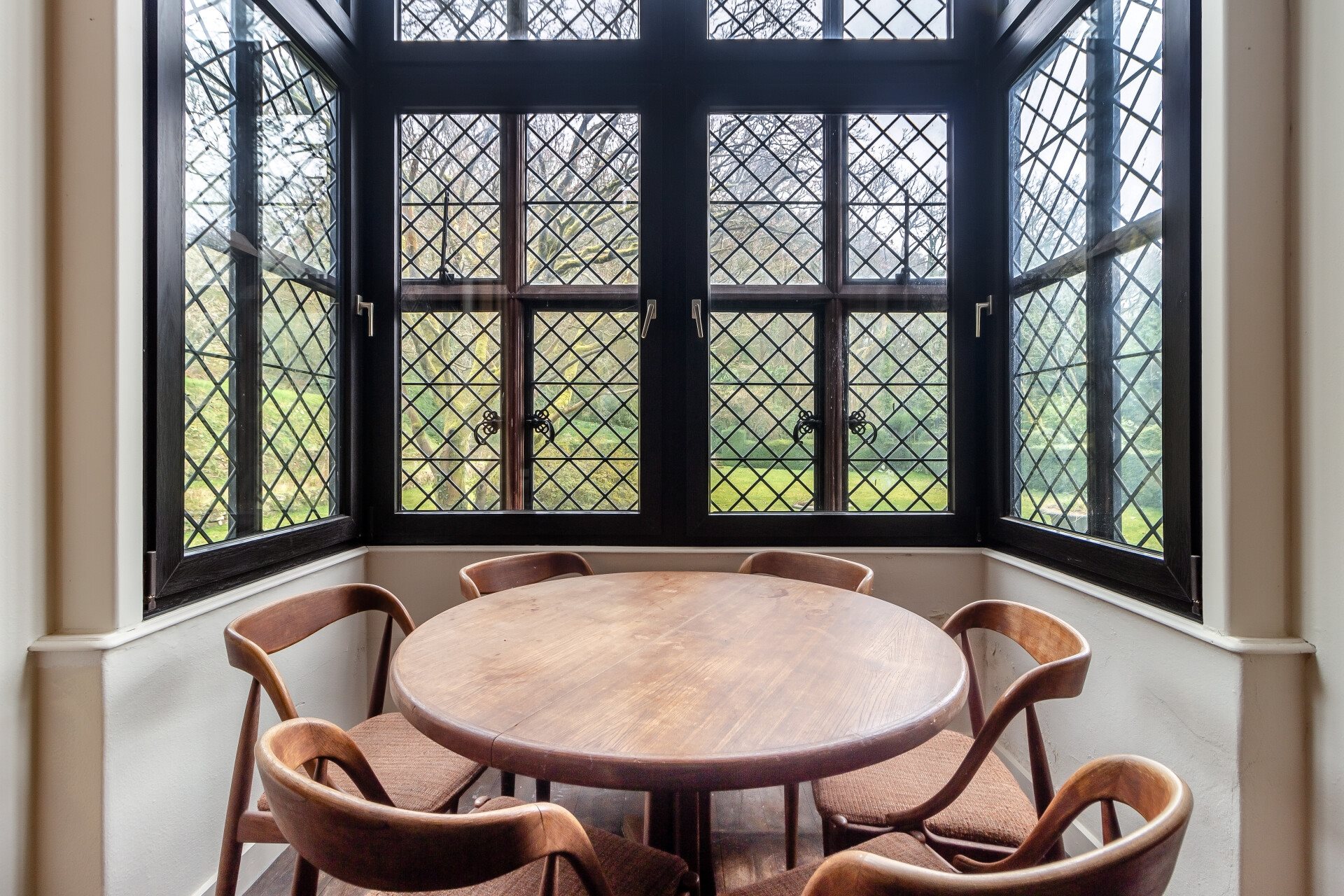 The ground floor of the property features an array of elegant, spacious rooms perfect for both family life and entertaining. Two distinguished dining rooms, with their rich wood paneling and statement fireplaces, offer exceptional settings for hosting guests. Large bay windows frame the views over the expansive lawn and surrounding woodlands. The kitchen is both practical and spacious, complete with modern appliances, while the downstairs bathroom adds to the convenience of this floor.
