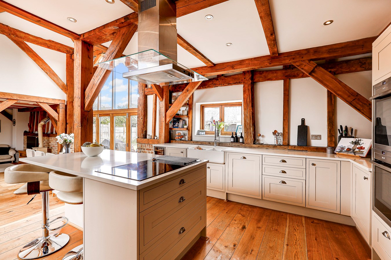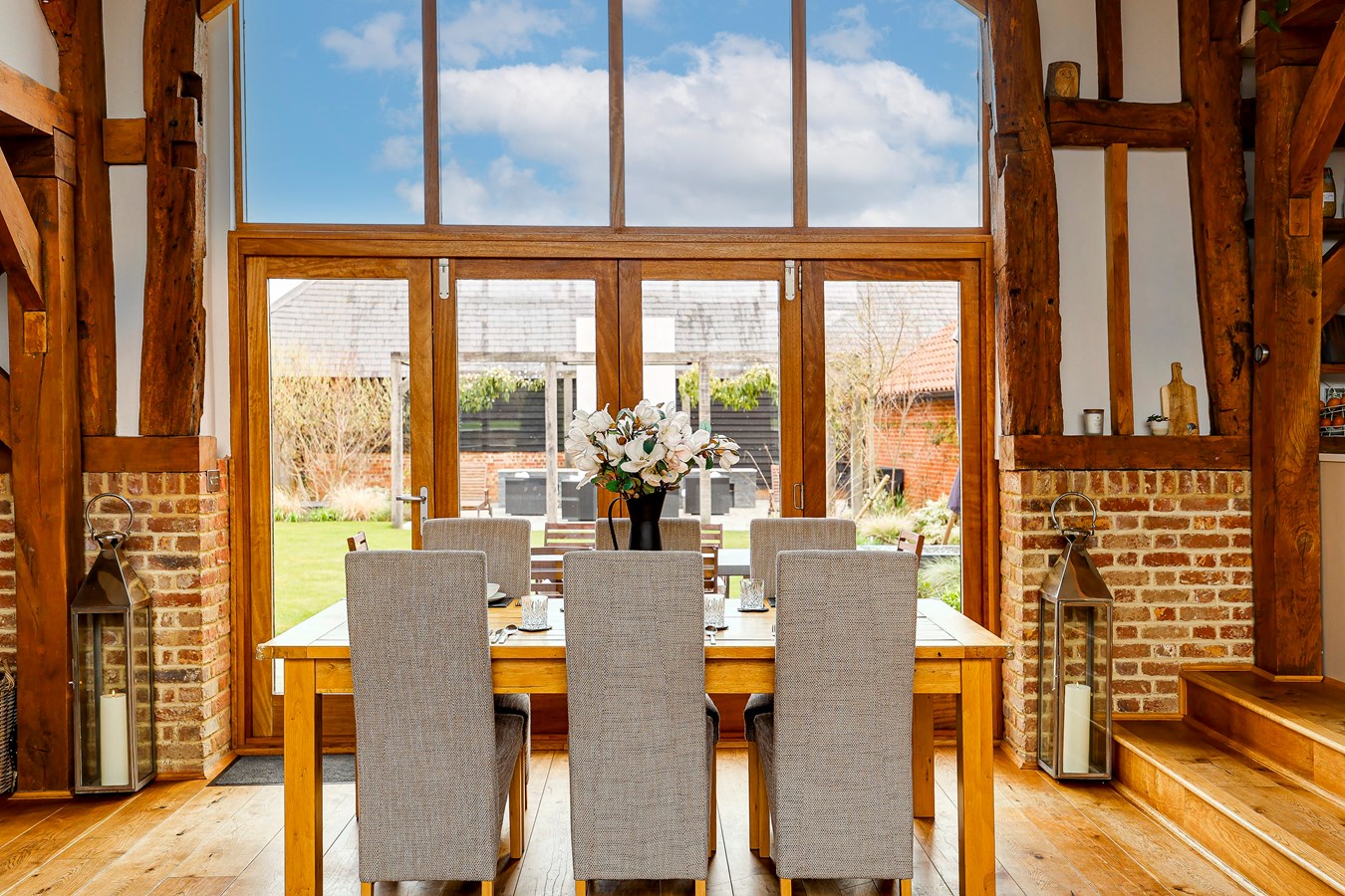 Step Inside:As you step inside, youre immediately greeted by an expansive open-plan kitchen, sitting, and dining area that stretches an impressive 15.2 metres in length. Soaring 7.2 metre vaulted ceilings, oak beams, and high-level windows create an airy, light-filled atmosphere. Bifold doors open seamlessly to the rear garden, offering the perfect connection between indoor and outdoor living. The property also benefits from underfloor heating, integrated wired speakers, and a fully-meshed WiFi network, with Ethernet connections to the home office/gym for ultimate connectivity. Thoughtfully designed with modern comforts, the property also features Nest thermostats, TV and BT/data points and security cameras, ensuring ease of living and peace of mind.