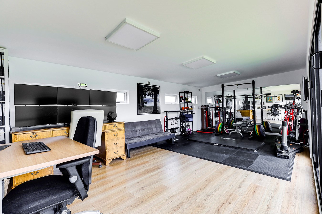 A highlight of the property is the versatile 30m² home office/gym, which offers both privacy and connection to nature. With its own separate entrance and bifold doors leading directly to the gardens, it provides an ideal environment for work, fitness, or leisure. Whether you're working from home or pursuing personal fitness goals, this space allows you to do so in style and comfort.