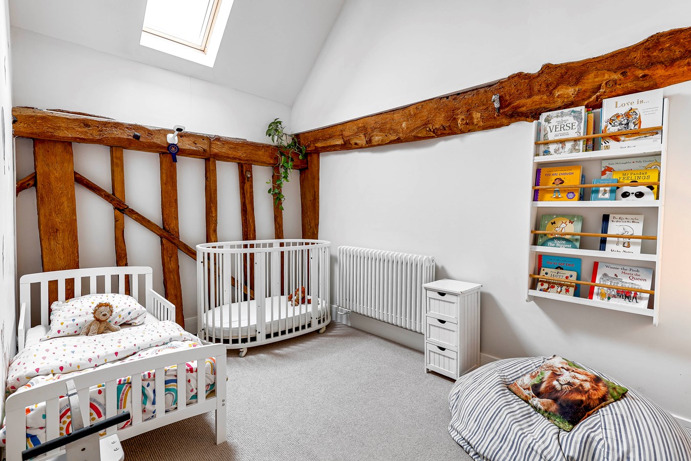 The heart of the home is the stylish, Tewkesbury Shaker-style kitchen, featuring quartz countertops, a double Belfast sink, and a full suite of integrated Neff appliances, including an induction hob, twin ovens, dishwasher, washing machine, and tumble dryer. A freestanding Samsung American-style fridge/freezer and a separate wine cooler add further appeal to the space. Throughout the ground floor, engineered oak flooring complements the historic charm of the exposed 350-year-old oak beams, with a cozy log burner enhancing the atmosphere. A utility room, guest bedroom, and a stunning bathroom complete this level.