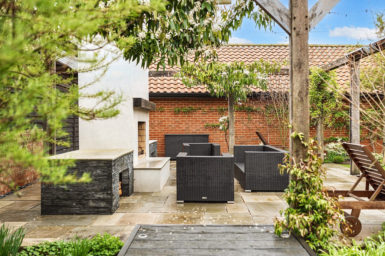The south-west-facing rear garden is truly a haven. Featuring mature beds, a tranquil water feature and a large outdoor fireplace set beneath a festoon-lit pergola, this space is perfect for year-round entertaining, complete with integrated heaters. A separate deck area houses a fully-serviced Jacuzzi (included in the sale), offering an ideal spot to unwind. The centrally positioned lawn is perfect for outdoor activities, while the thoughtfully landscaped surroundings provide privacy and seclusion. Adding to the garden's charm, uplighters illuminate the mature trees, creating a magical ambience at night.