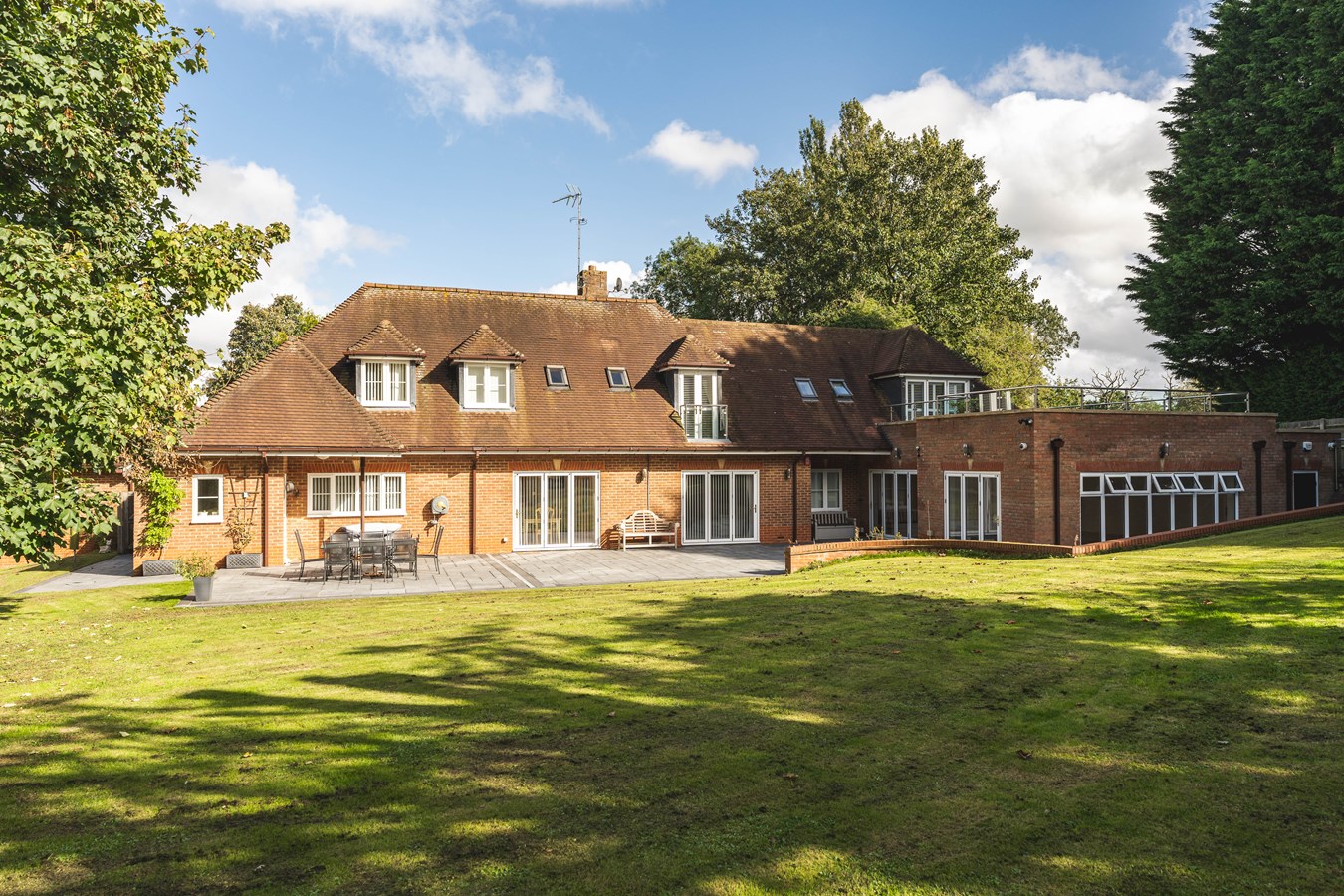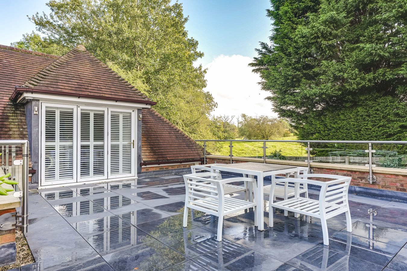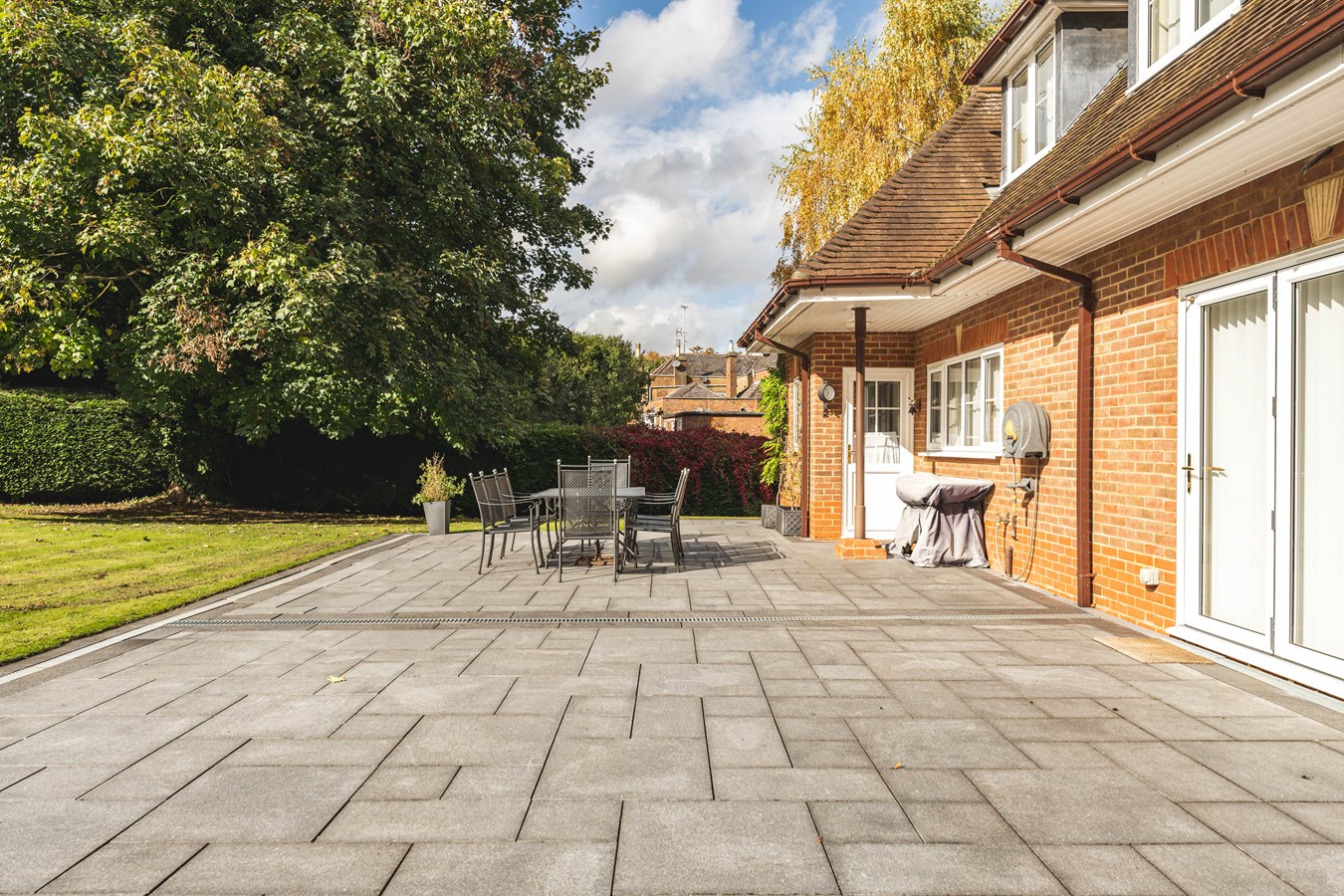 As you step outside, you are greeted by a large garden that blends lush greenery with thoughtfully designed spaces, creating a peaceful retreat from the outside world. The expansive patio area, perfect for al fresco dining or evening drinks with friends, effortlessly accommodates outdoor entertaining with space for a large dining set, lounge furniture and barbecue. Mature trees and hedges provide natural beauty and privacy, while open lawn areas offer plenty of space for relaxation or play.