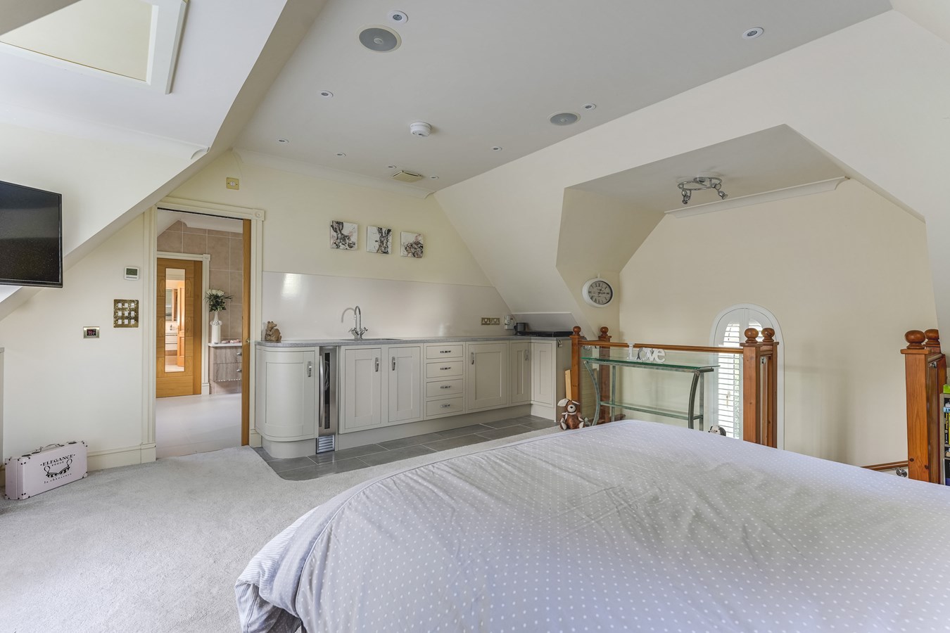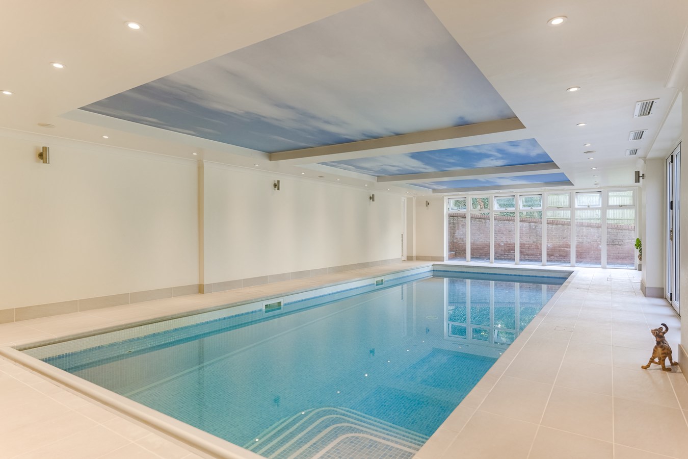 A true highlight of this home is its private indoor swimming pool, providing year-round indulgence in a serene, secluded environment. Adding to the unique ambience, the pool area features a bespoke ceiling crafted by a Welsh artisan, with hand-painted panels depicting clouds drifting across the sky, creating a tranquil, immersive atmosphere. Whether for fitness, relaxation, or entertaining guests, this exclusive feature elevates the home to an unmatched level of luxury.