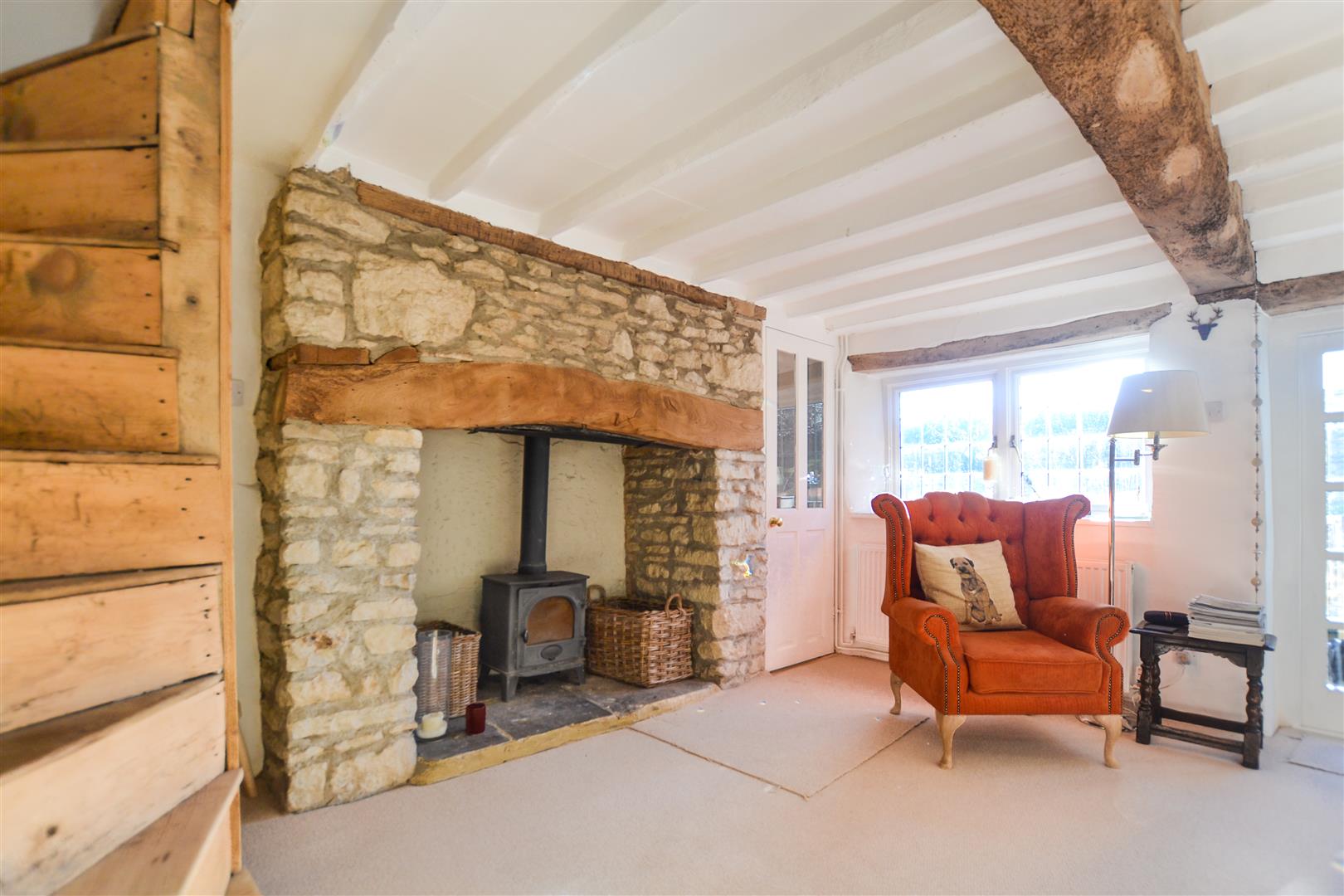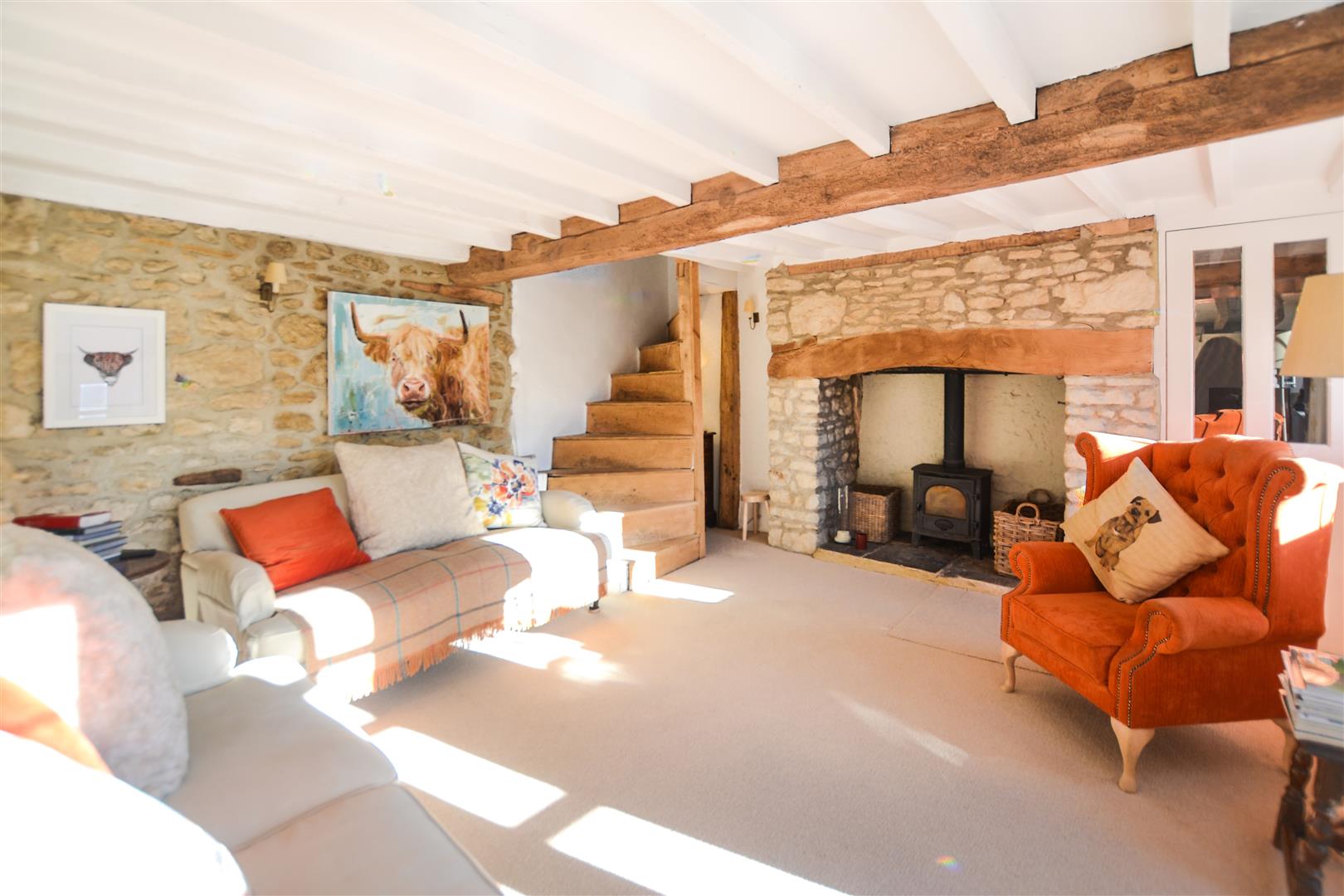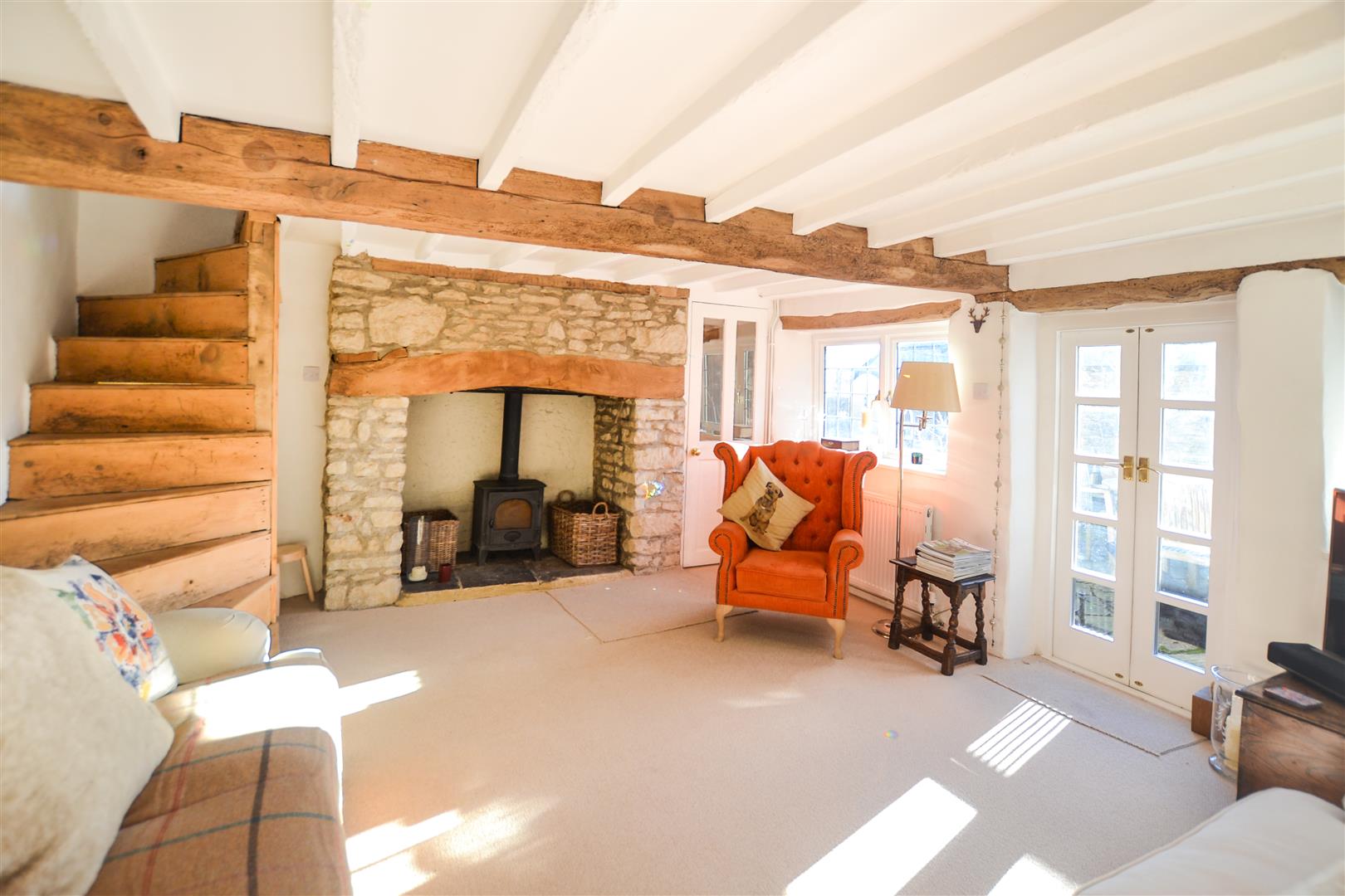 The charming south facing aspect sitting room is light and spacious with a feature inglenook fireplace and log burner with french doors that provide access to the courtyard front garden.
