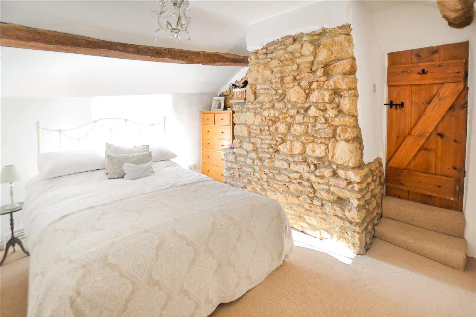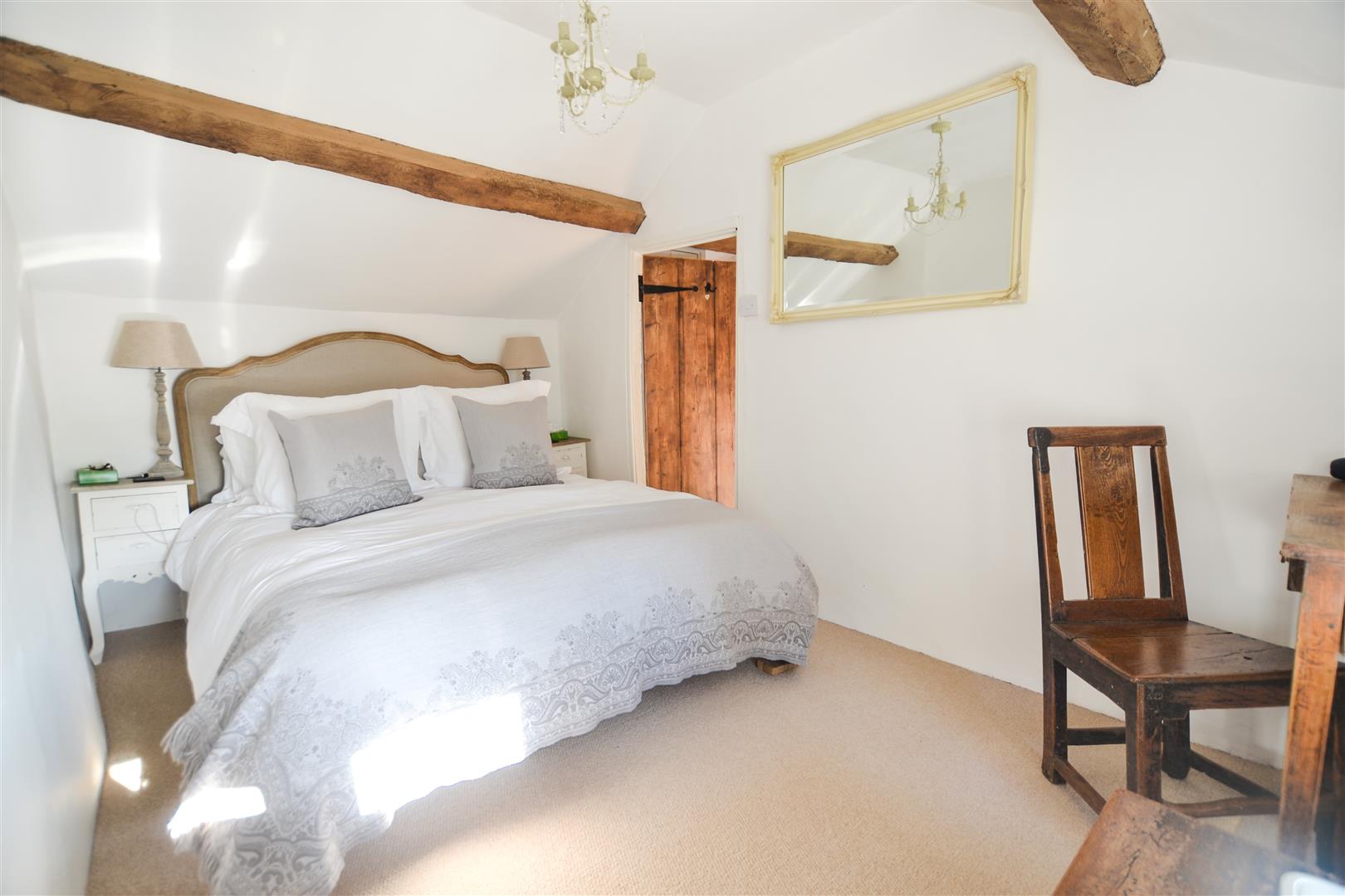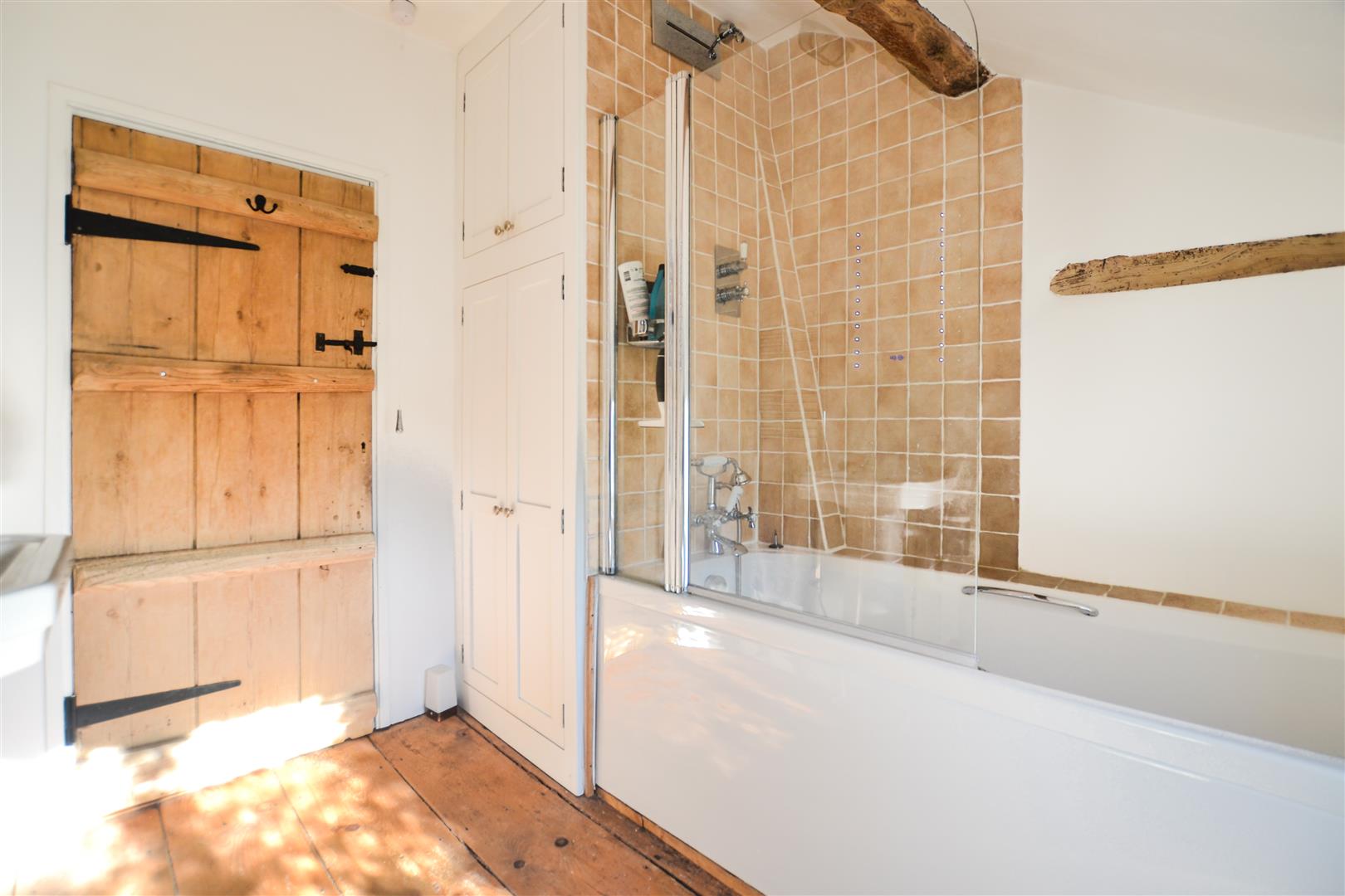 To the first floor the master bedroom with built in wardrobes enjoys views over the front garden. There is a further double bedroom and family bathroom which have been completely refurbished. Exposed stonework and whitewashed walls add charm to these very pretty rooms.