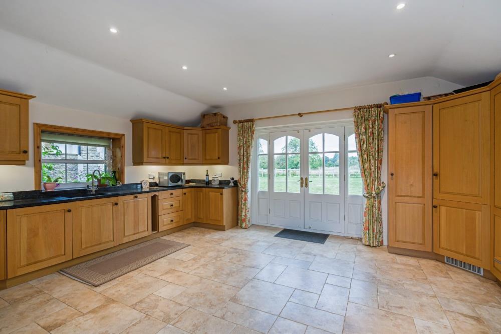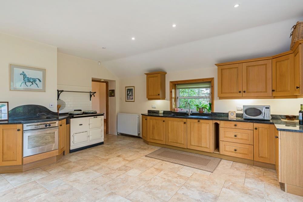Fitted with a number of floor and eye level units, integrated appliances, along with a two oven AGA it also has plenty of space for a large table and chairs.