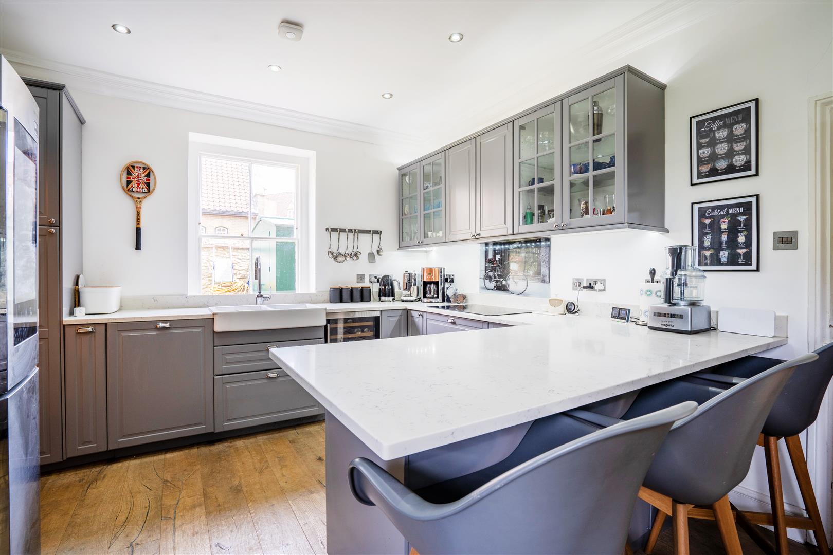 The kitchen/dining room is fitted with a generous number of floor and eye level contemporary units, a breakfast bar, and integrated appliances, all complemented by quartz work surfaces.