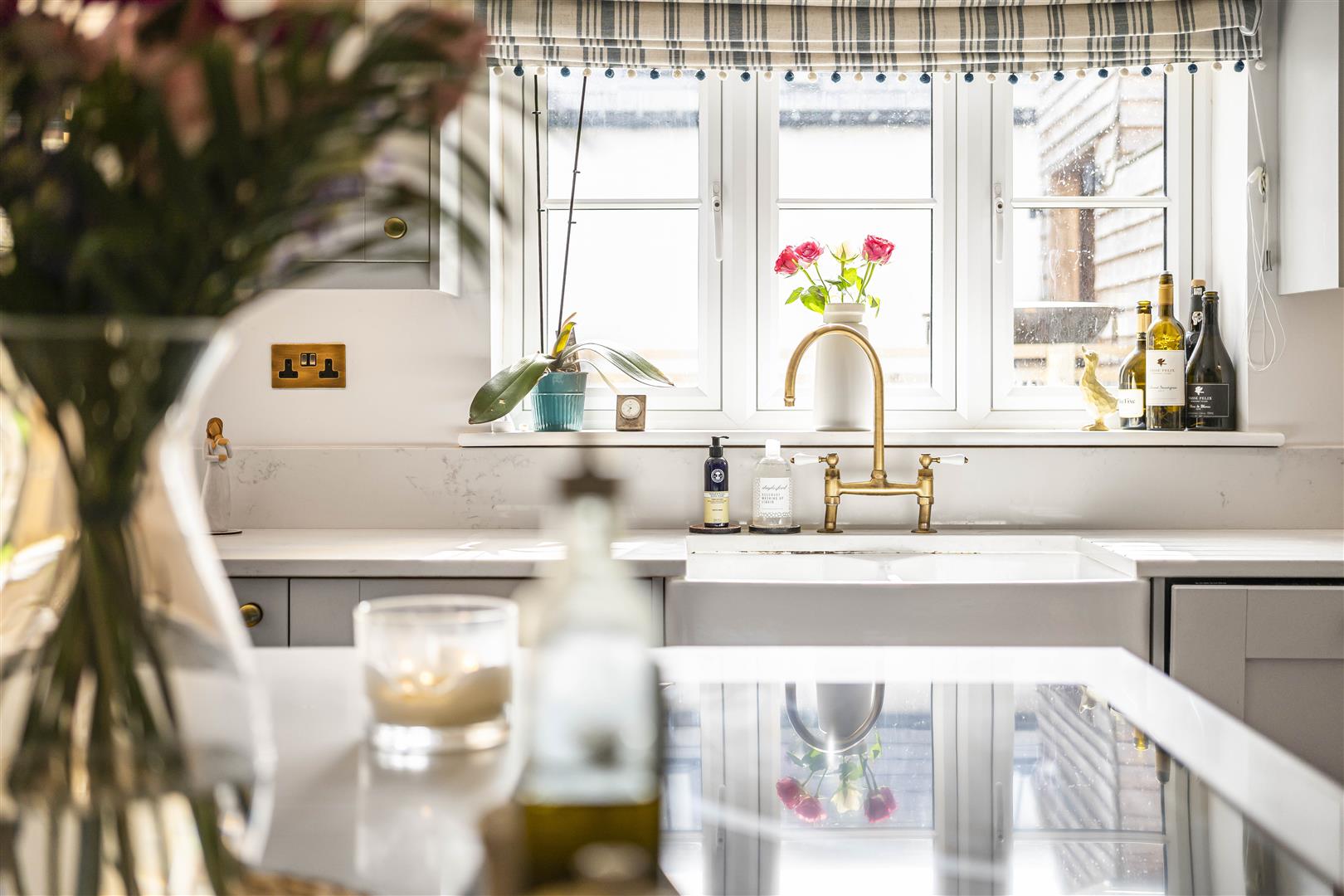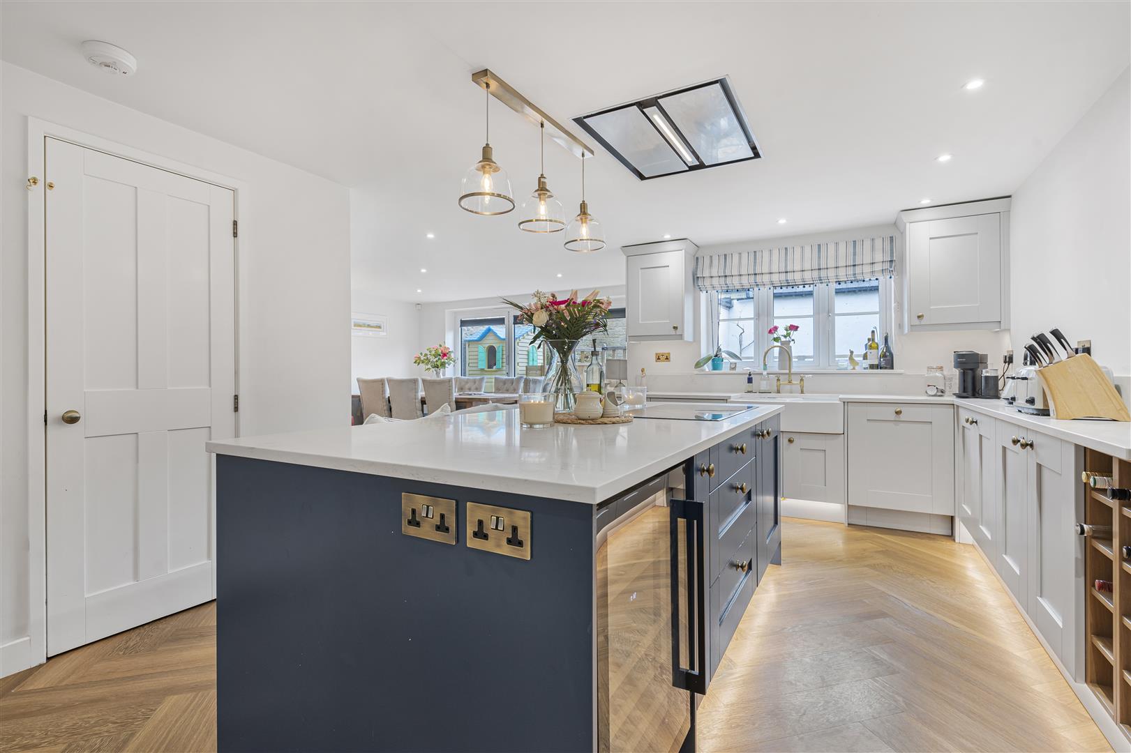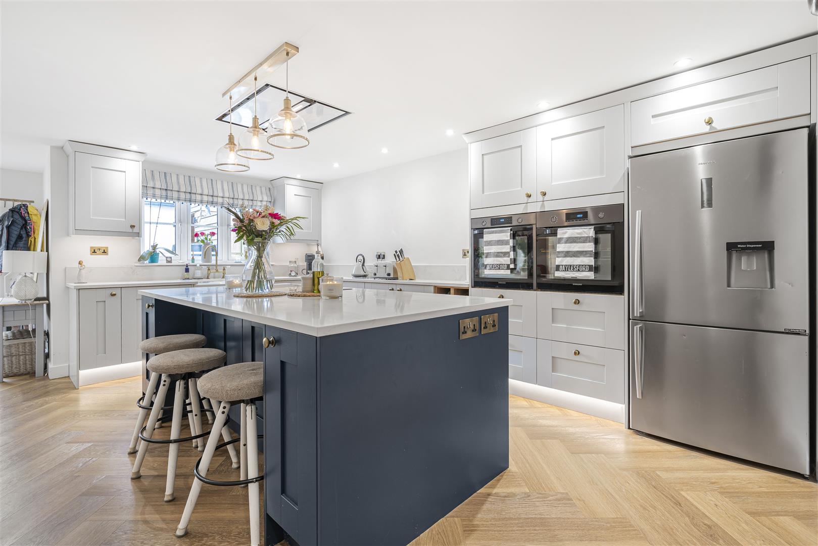 The kitchen has been expertly designed and installed to the highest standards, incorporating integrated appliances, a Belfast sink, twin ovens, a dishwasher, and mood lighting. The fabulous island houses a large induction hob, wine fridge, and breakfast bar.