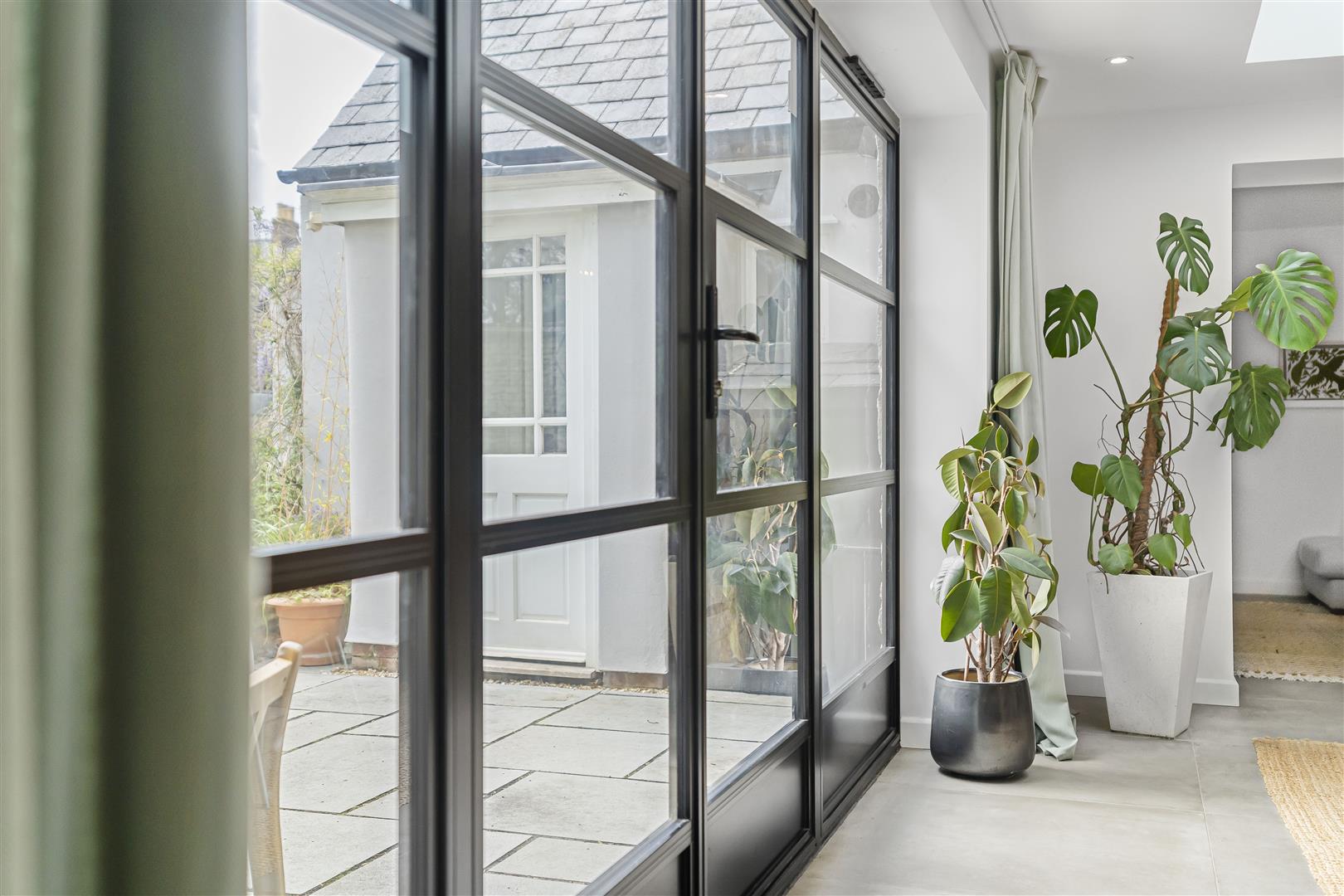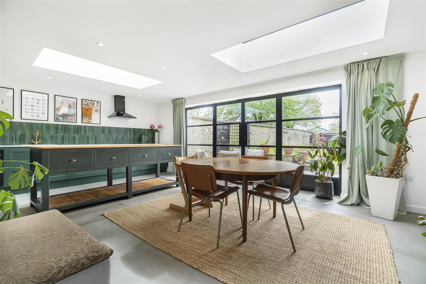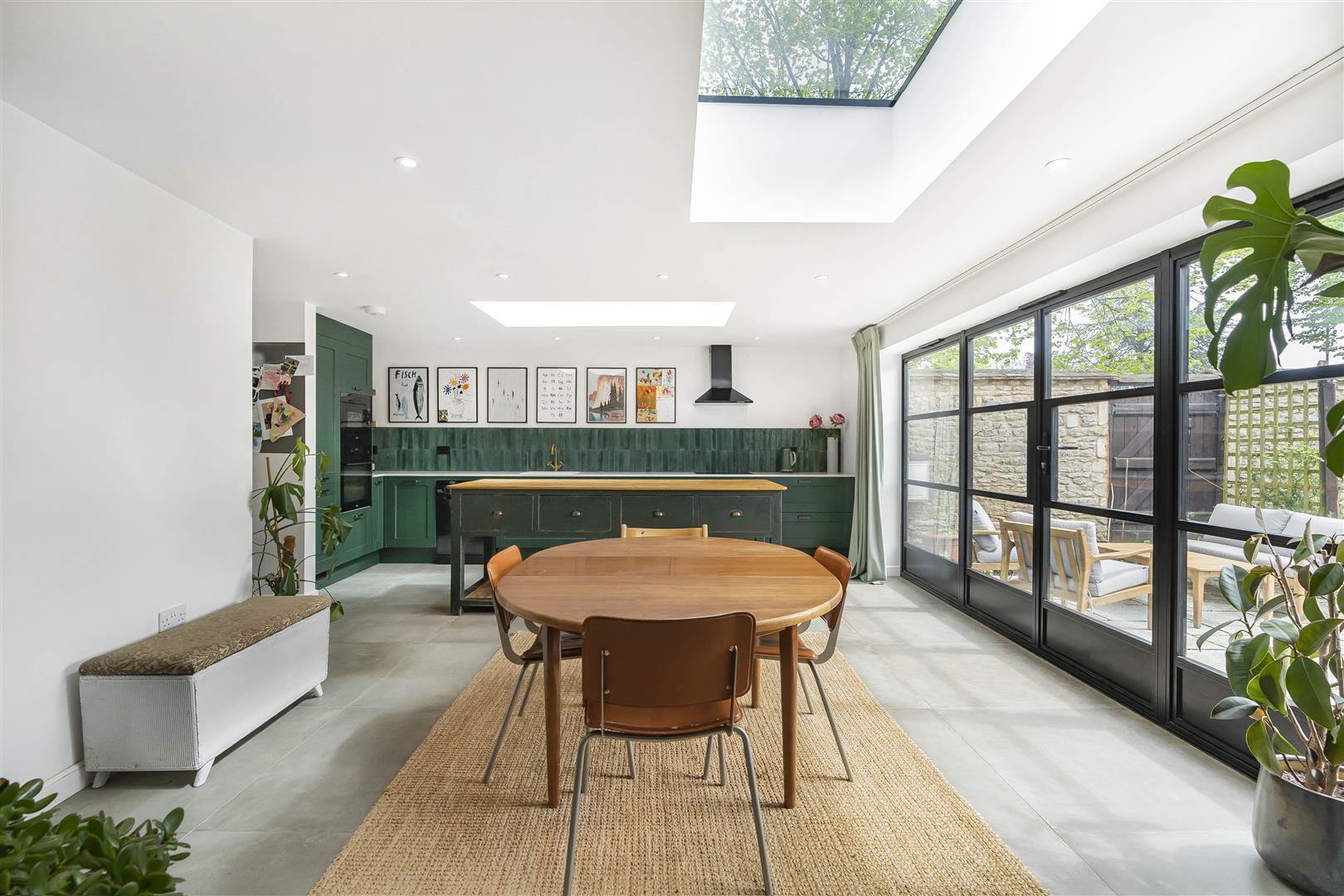 Through the sitting room is the open plan kitchen/dining room with underfloor heating, which is a lovely open space to sit and enjoy your southernly facing rear garden through the beautiful rear Crittall style doors.