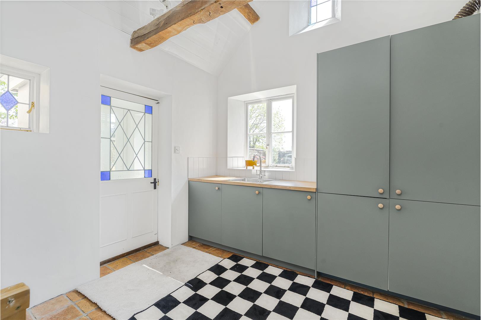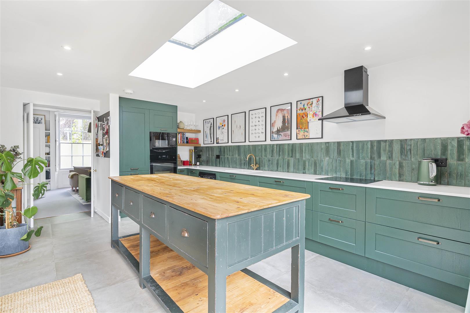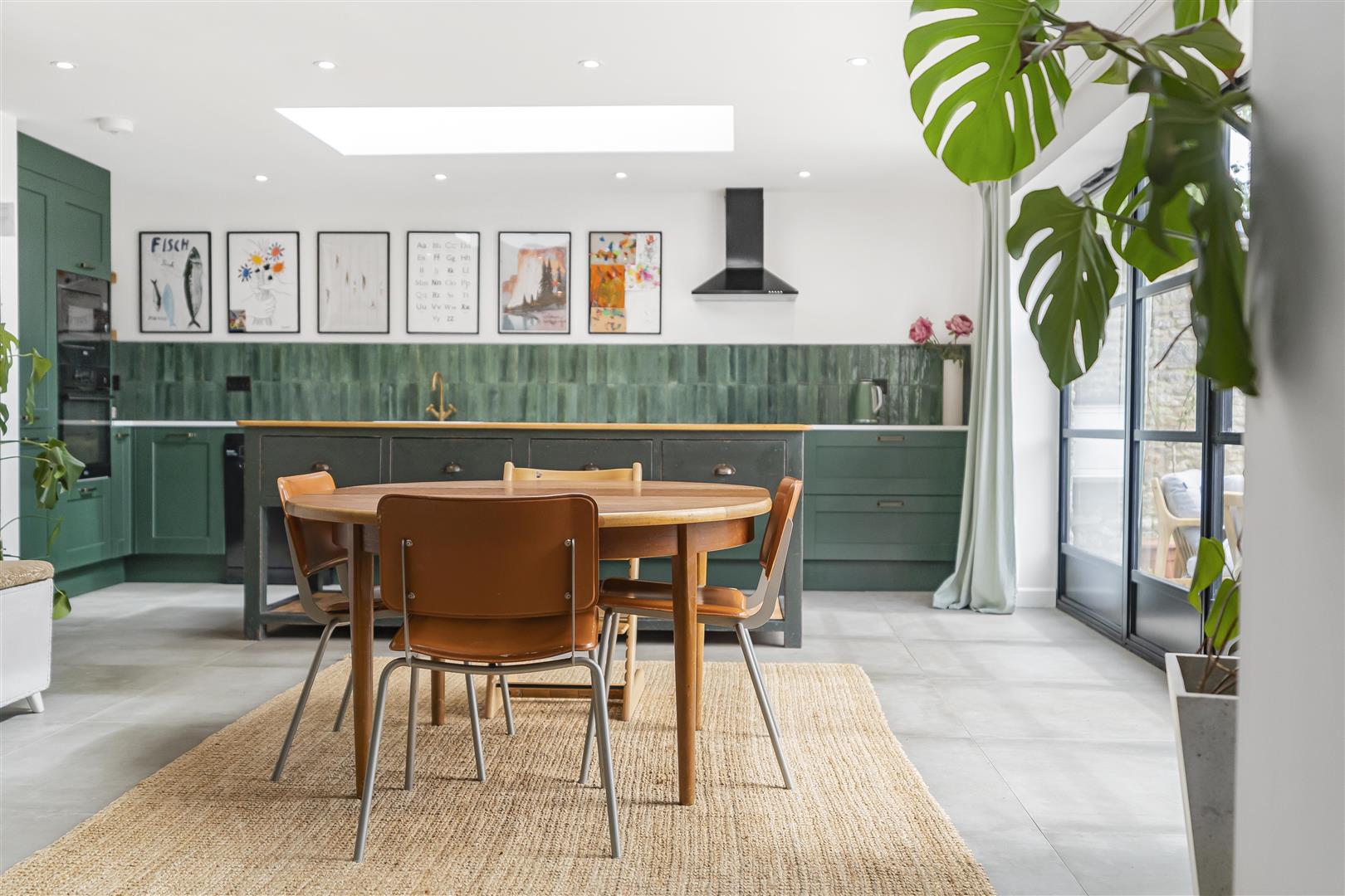 Through the sitting room is the open plan kitchen/dining room with underfloor heating, which is a lovely open space to sit and enjoy your southernly facing rear garden through the beautiful rear Crittall style doors.
