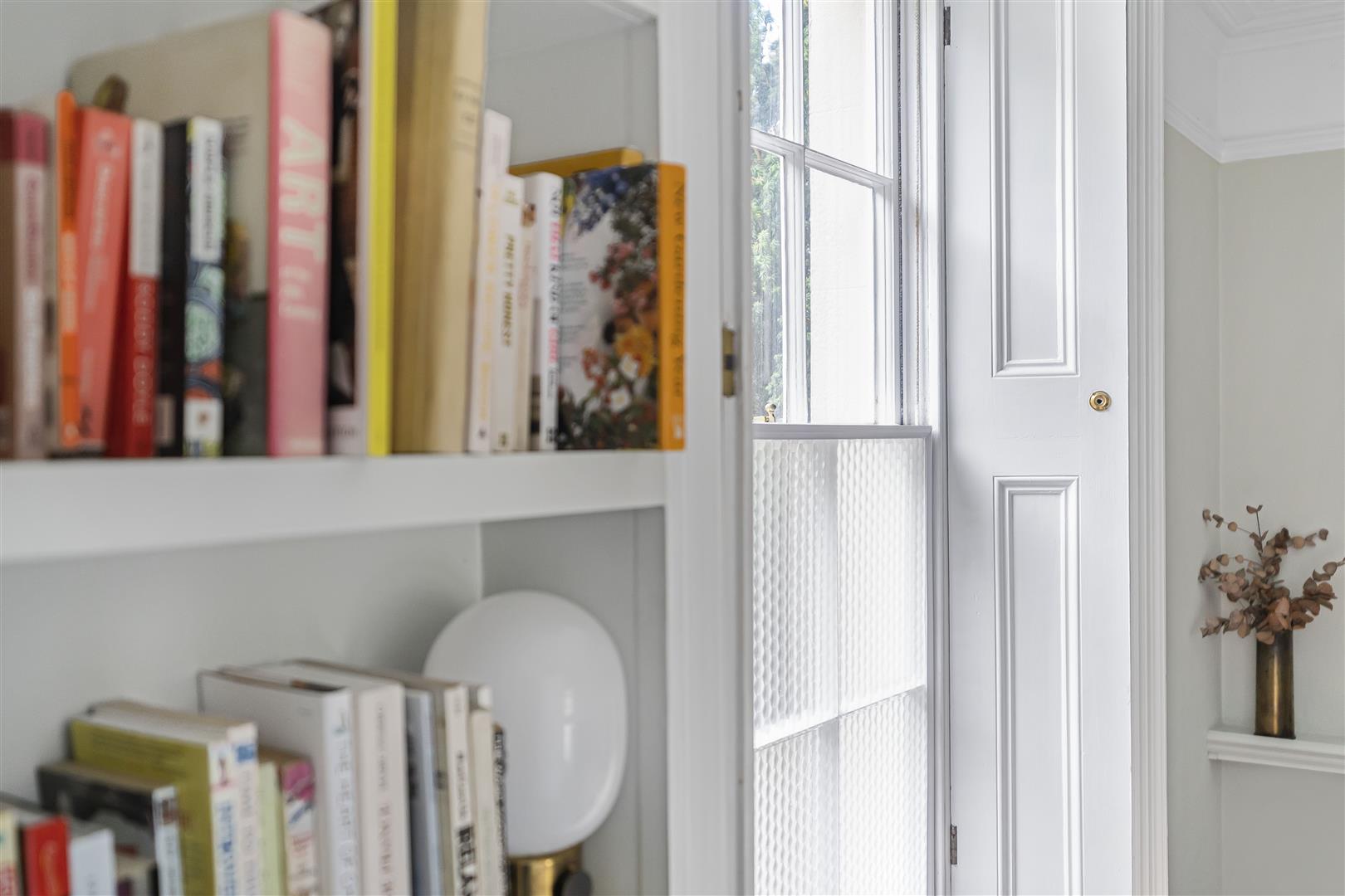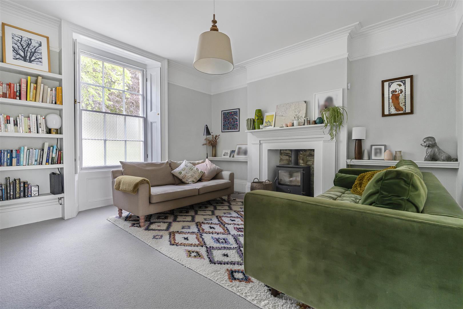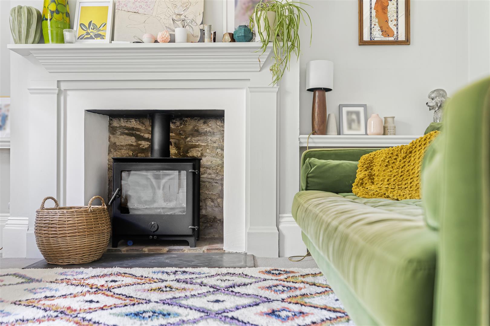 The sitting room including the first of two wood burning stoves and the office are to the front of the property, both rooms enjoy high ceilings, feature fireplaces and sash windows with shutters.