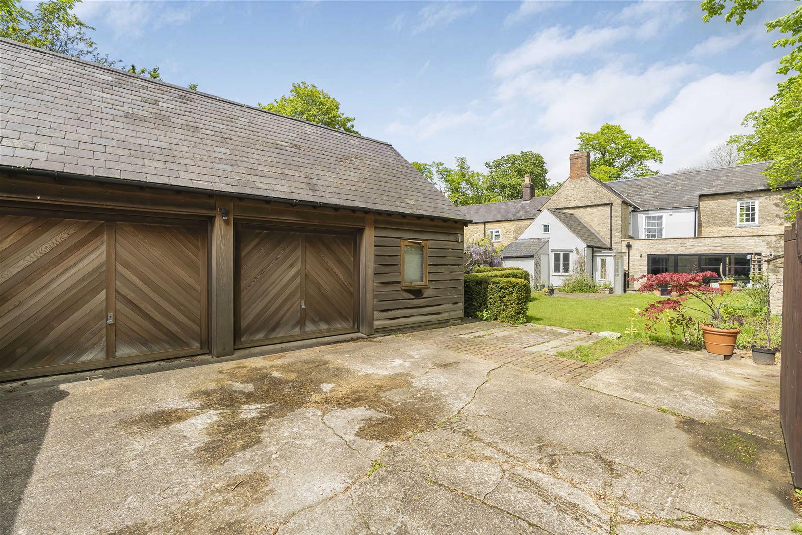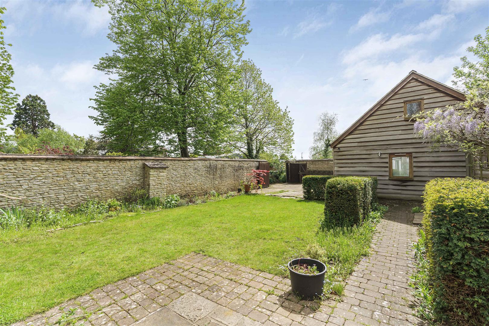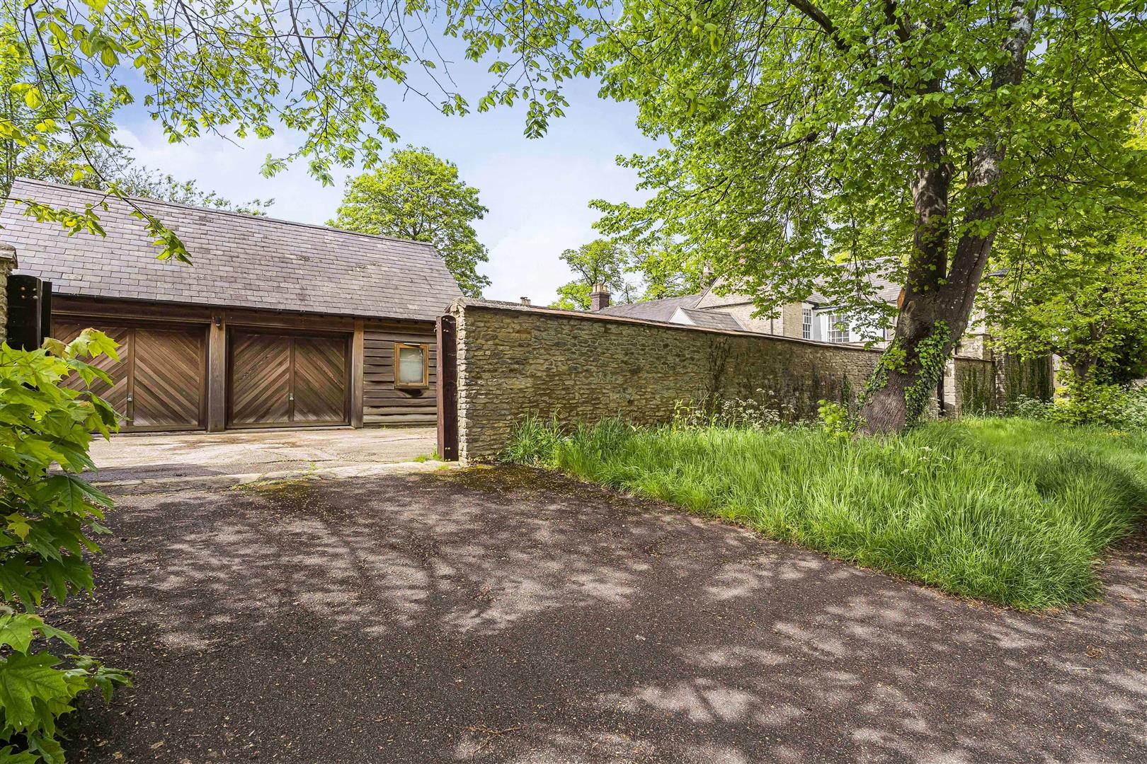 The garden is enclosed by the original stone wall, with double wooden gates to the garage and driveway parking.