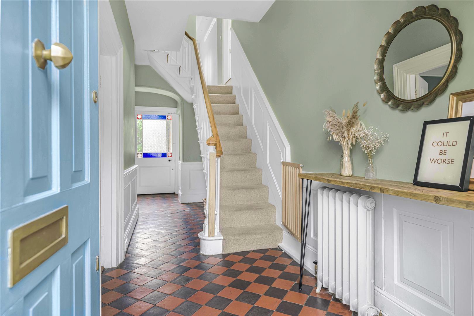 From the moment you enter this handsome and imposing period property, you are welcomed into the stunning entrance hallway, which boasts high ceilings, original tiled flooring, and an elegant staircase.