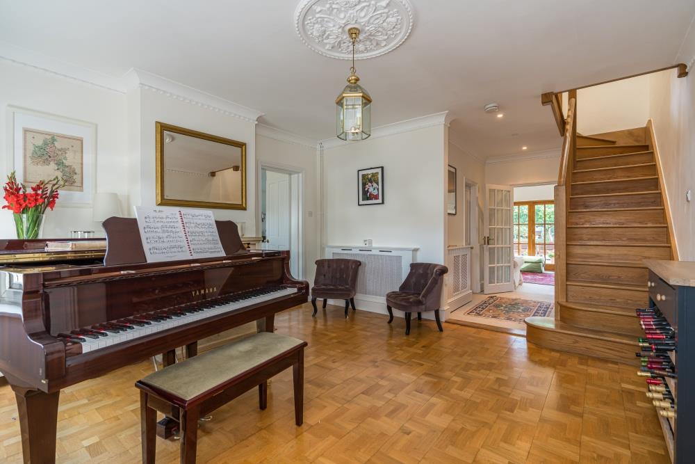 Upon entering the property you are welcomed by a substantial hallway, which provides the perfect space for the family's grand piano, with a feature fireplace and extremely attractive wooden floor it would also make for a fabulous formal dining room.