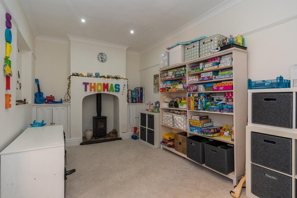 The games room/study has an attractive wood-burning stove and makes a good space for a children's playroom, library, or a music room.
