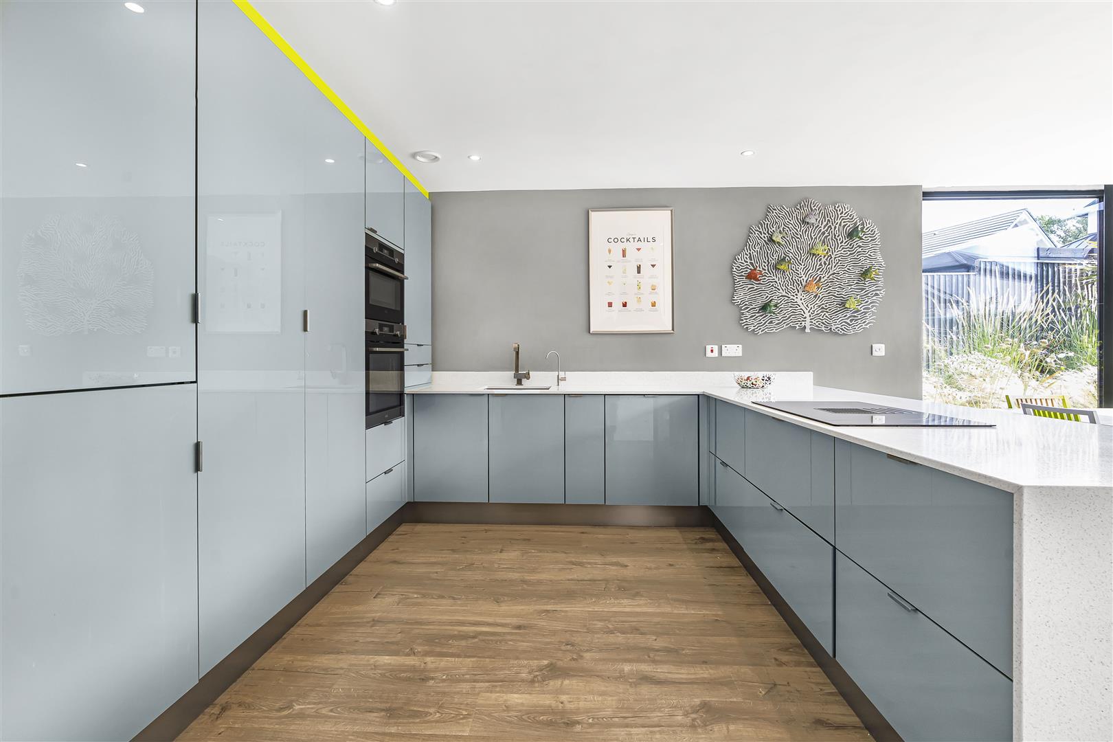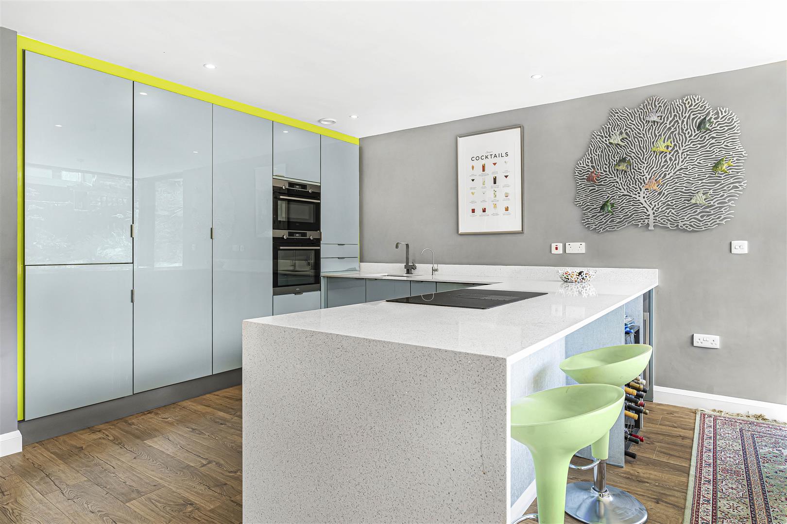 The kitchen has floor-to-ceiling windows and a door to the garden filling the room with natural light. Fitted with floor and eye level units, integrated appliances, a concealed worktop area in one of the cupboards for the kettle and toaster, and a breakfast bar complemented by quartz waterfall-edged worksurfaces.