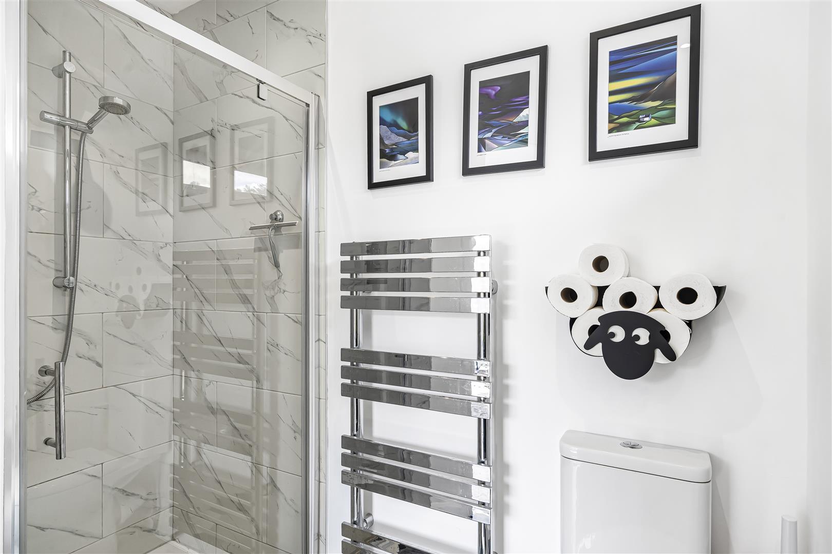 A utility room/store room accessed from the hallway with a door to the side of the house and garden houses the MVHR machine, washing machine, and a water softener.