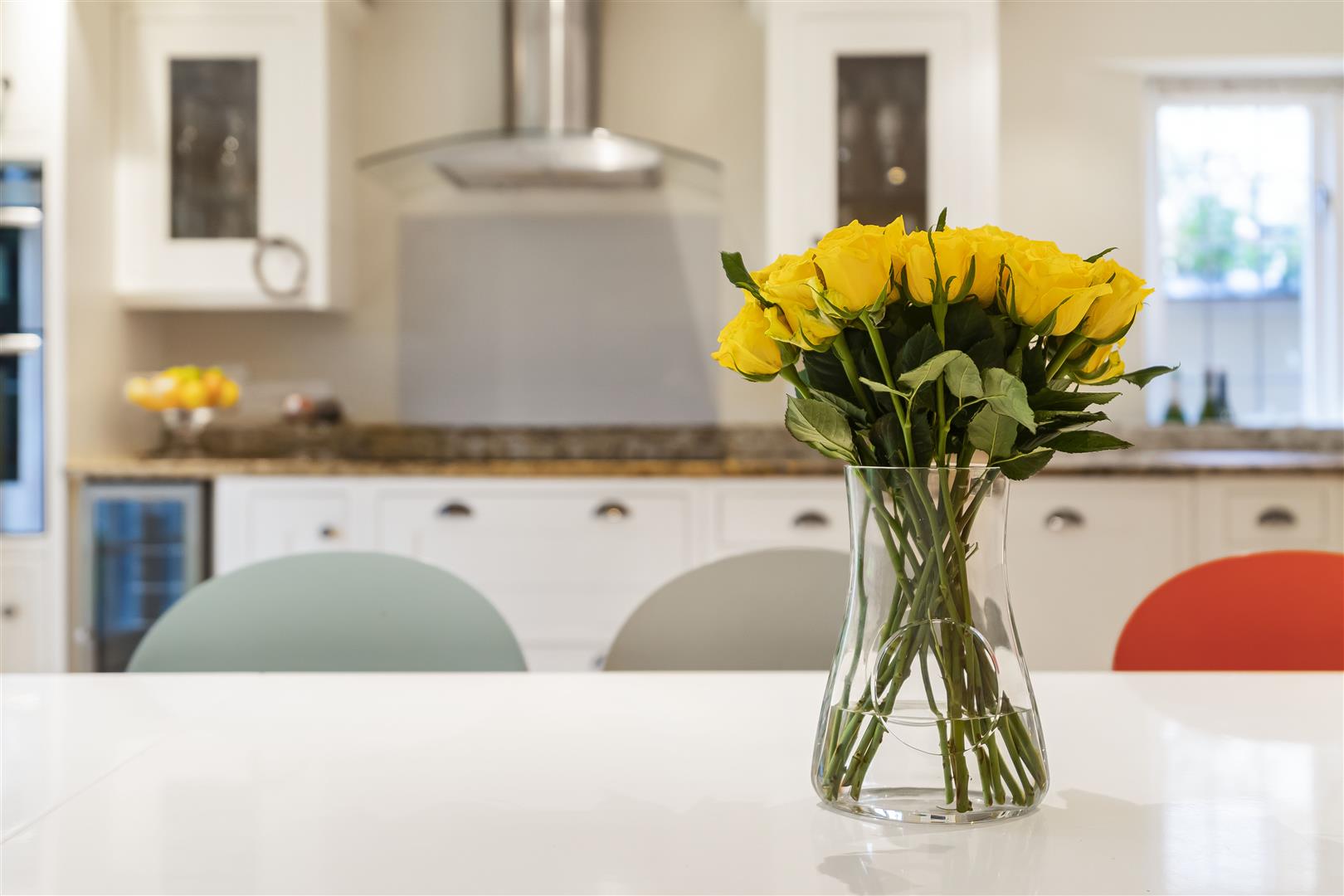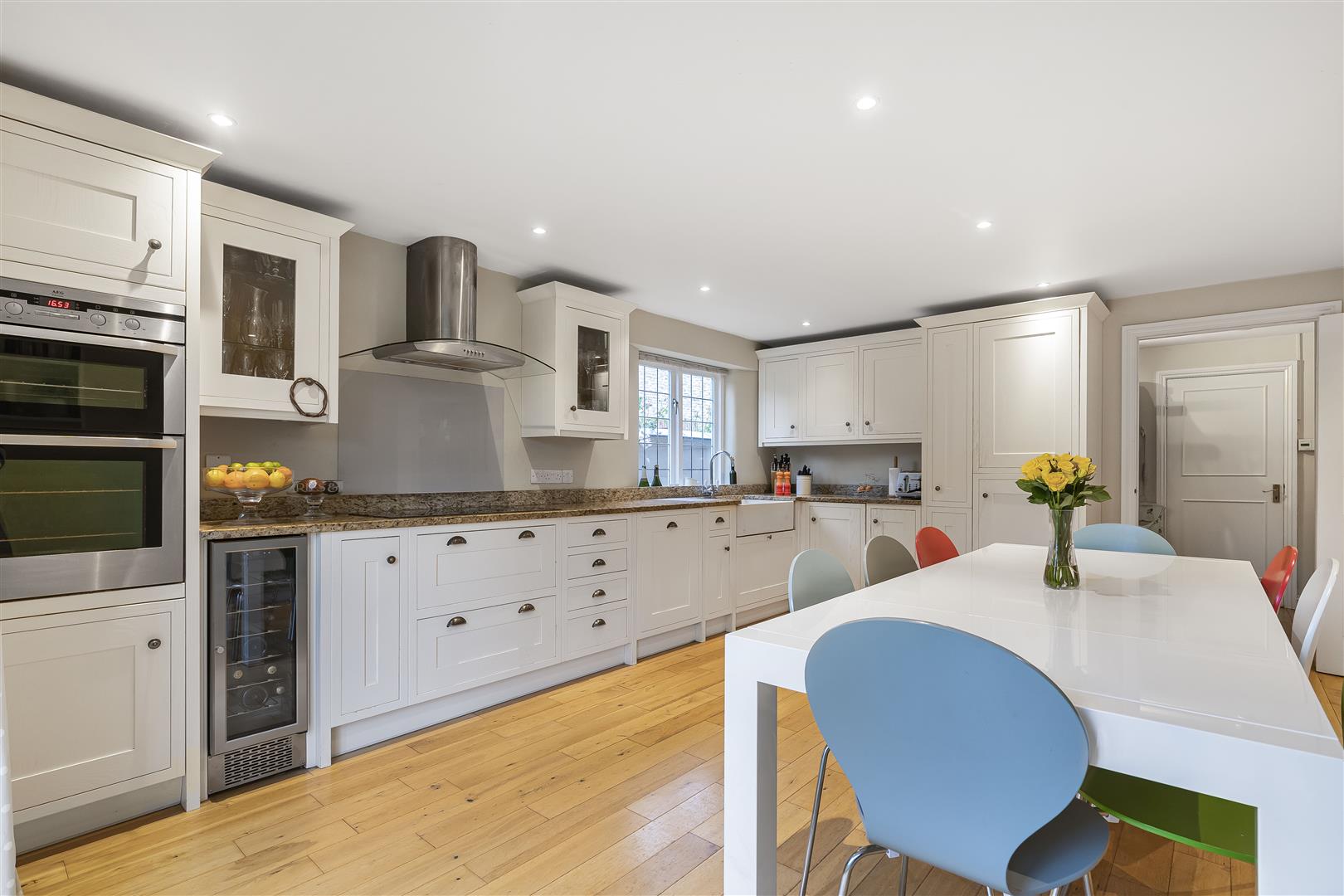 The kitchen/dining room is fitted with a generous number of units and integrated appliances, complemented by granite worksurfaces and wooden flooring.