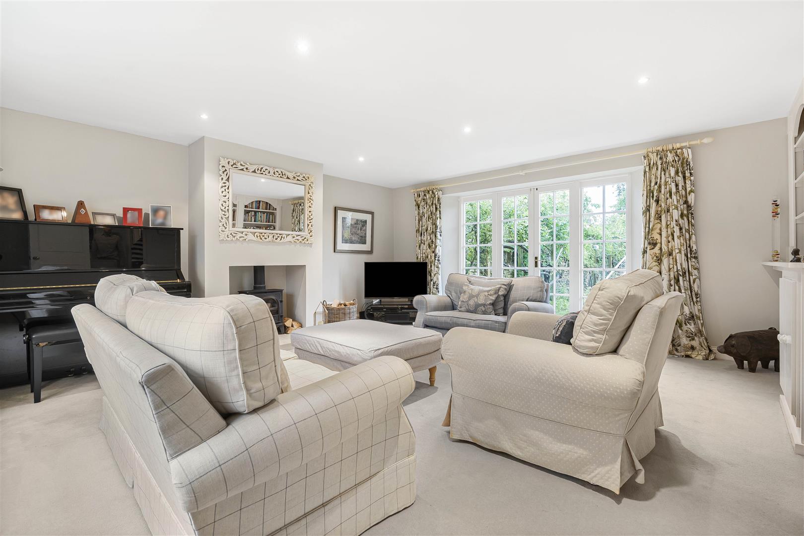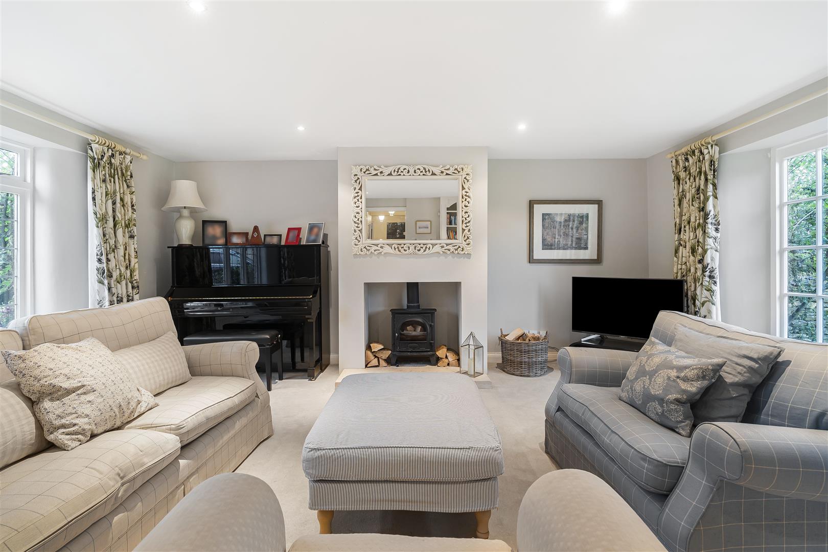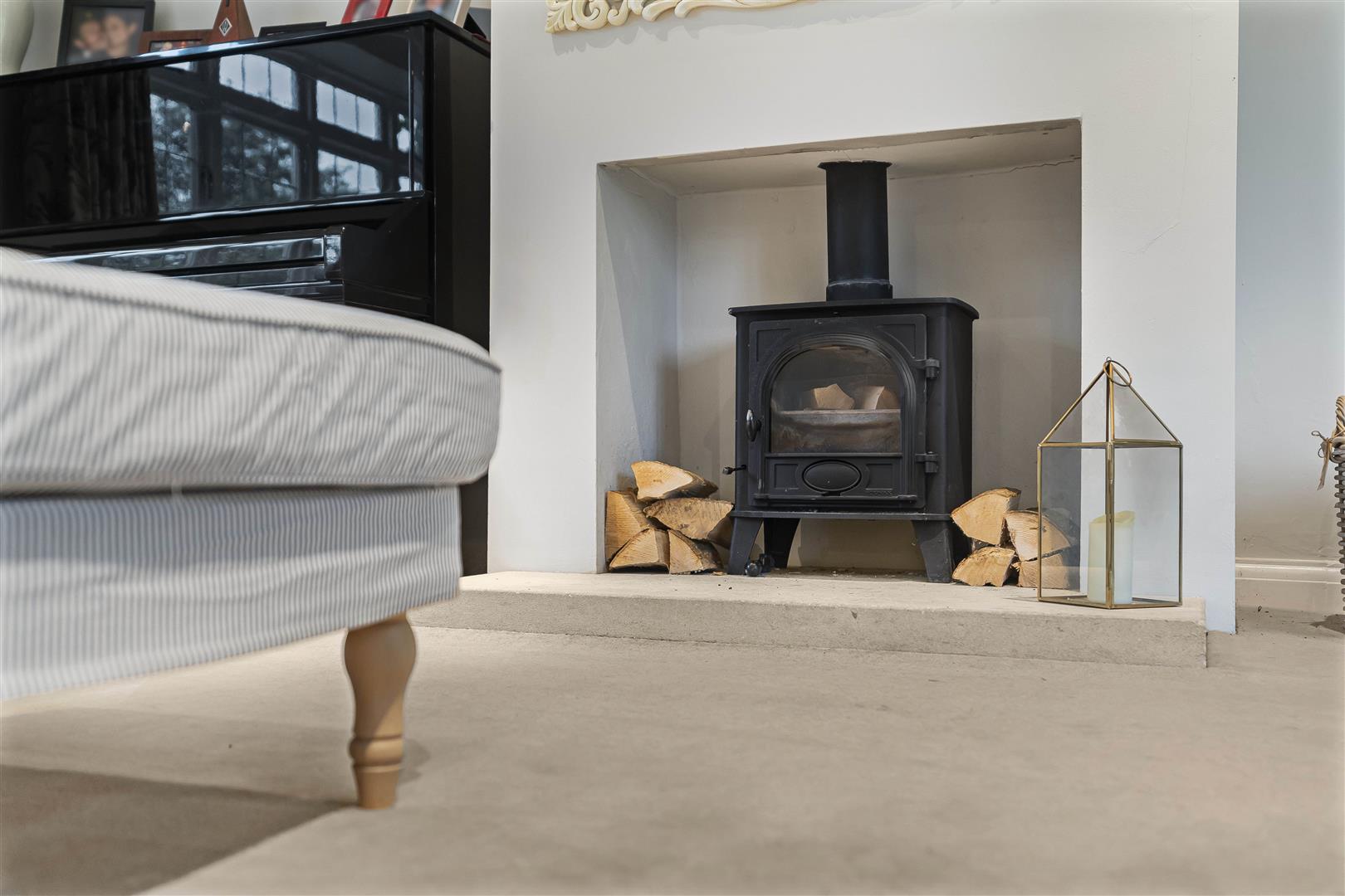 A spacious entrance hallway leads to the living room, which boasts a large window to the front, a woodburning stove, and French doors to the rear garden, making for an elegant room for entertaining.