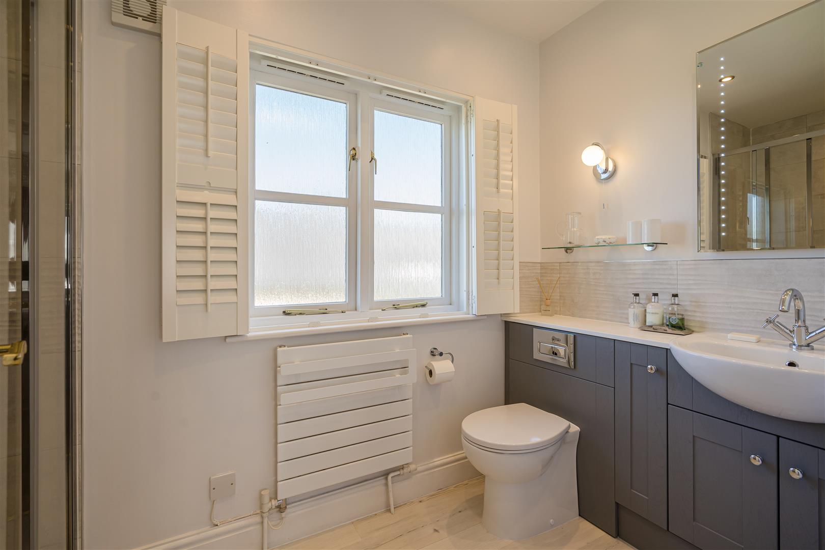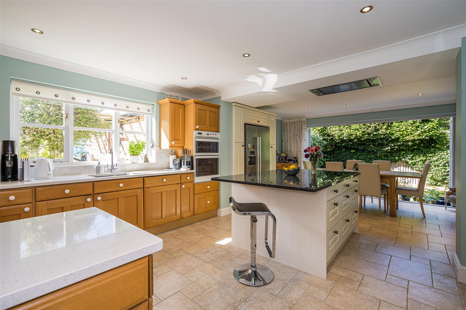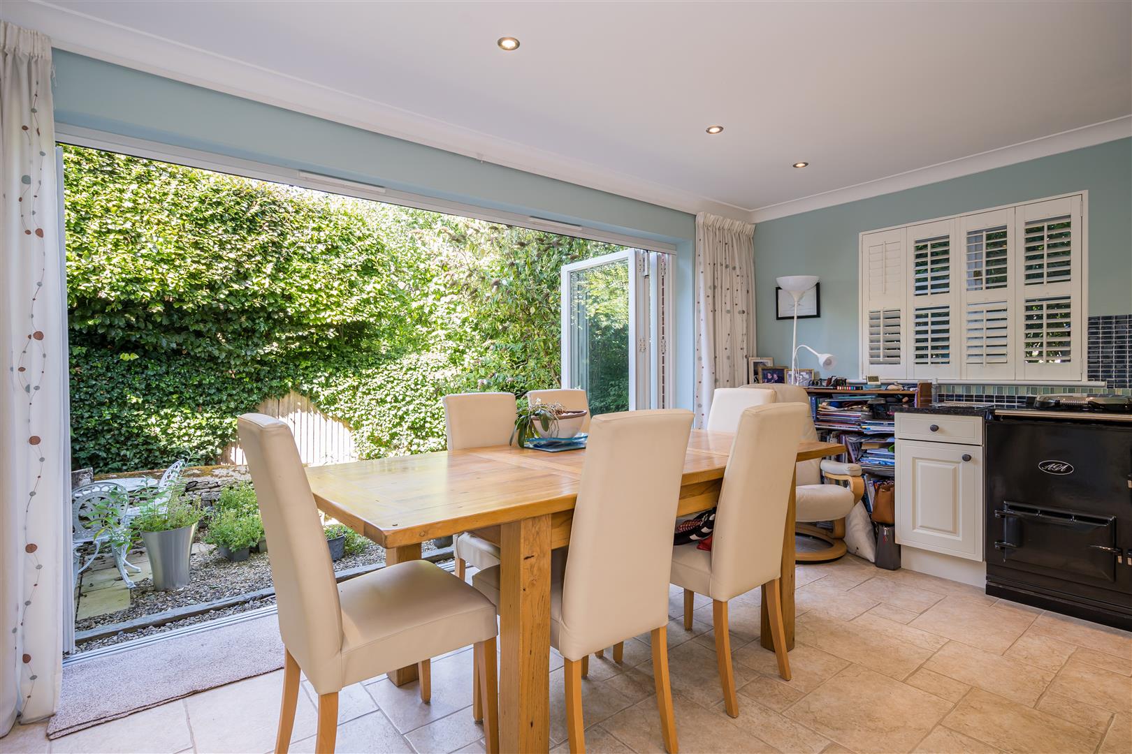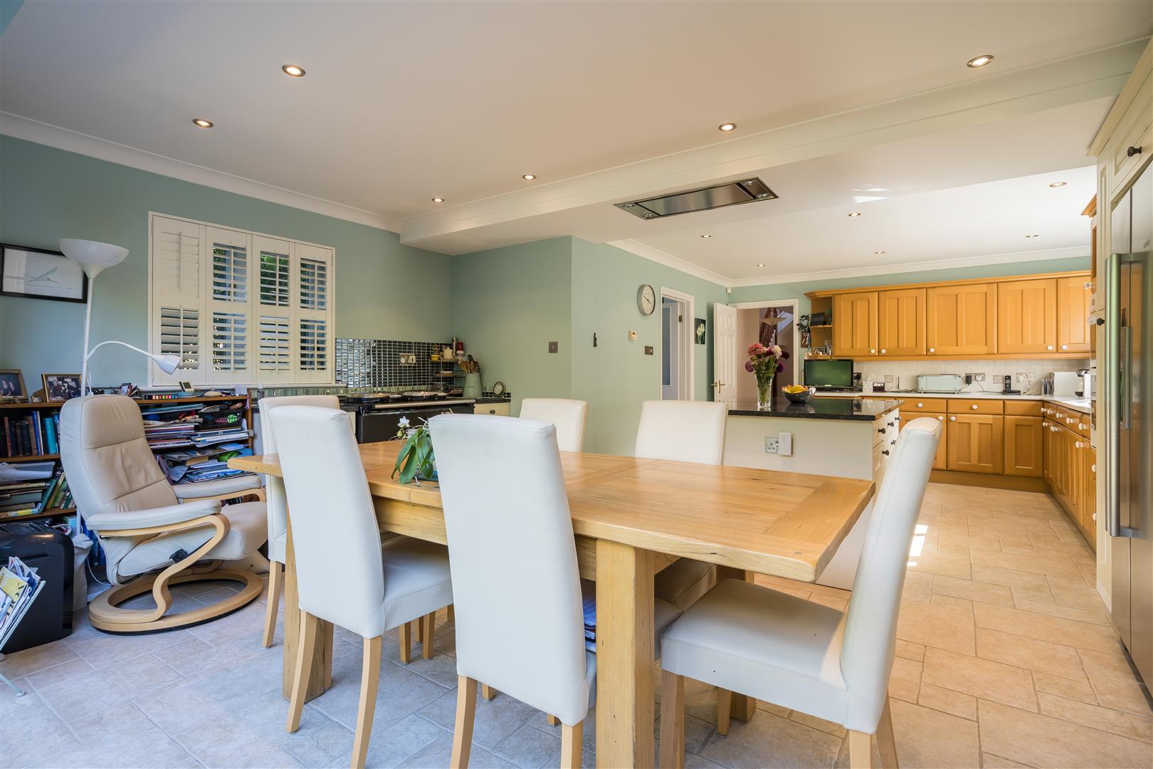 The kitchen is fitted with a combination of cream wood base and wall units and solid oak units, integrated appliances complemented by granite and quartz work surfaces along with space for a large American style Fridge-Freezer, making it is perfect for casual dining with friends and family, whilst overlooking the pretty courtyard garden to the side of the property.