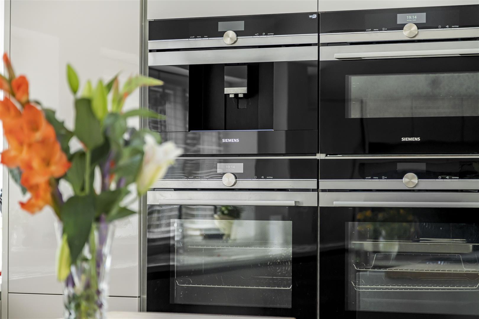The kitchen is beautifully appointed with a comprehensive range of sleek floor and eye-level units and integrated appliances, including three ovens and a coffee machine, all complemented by underfloor heating, stone effect tile flooring and ceramic worksurfaces.
