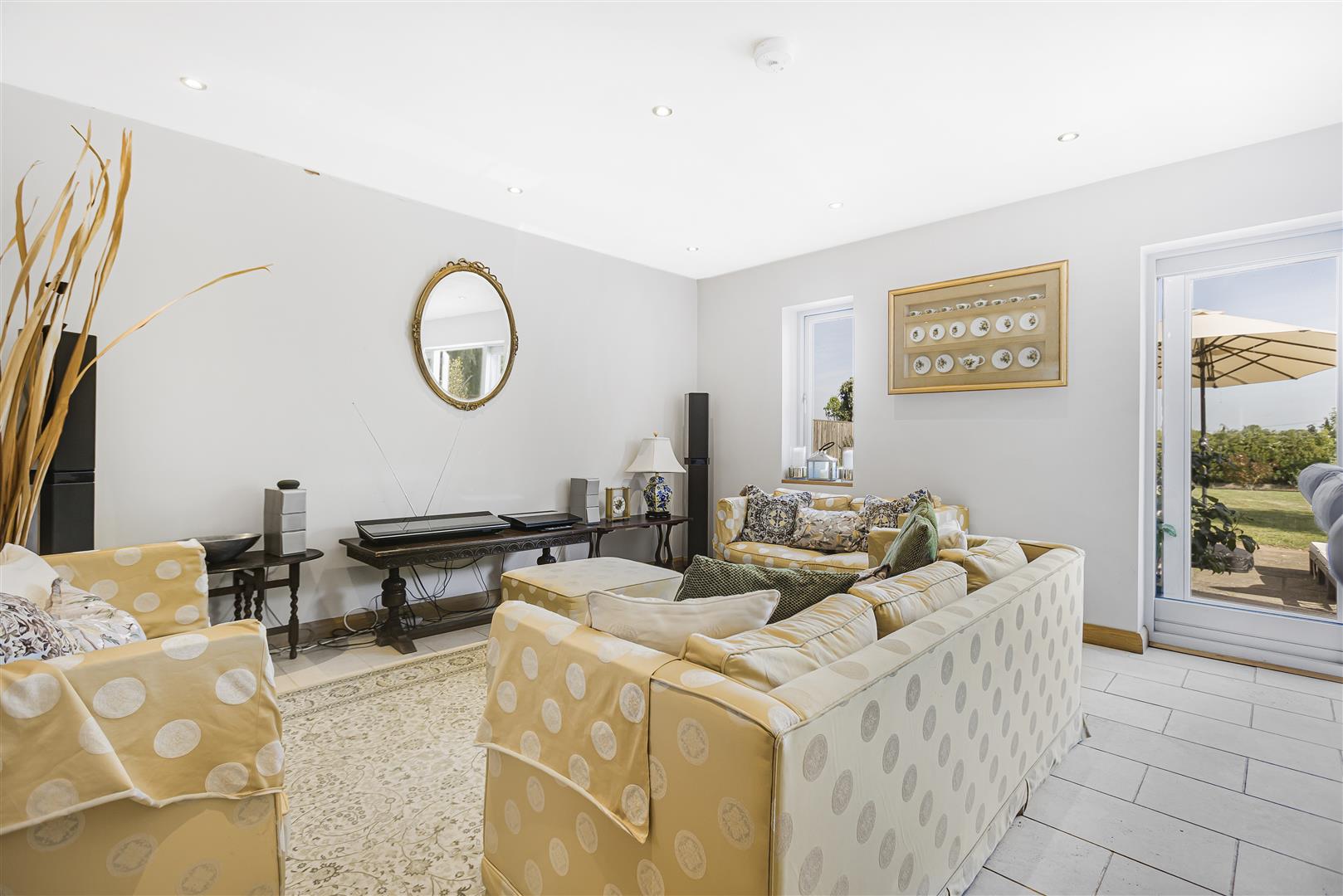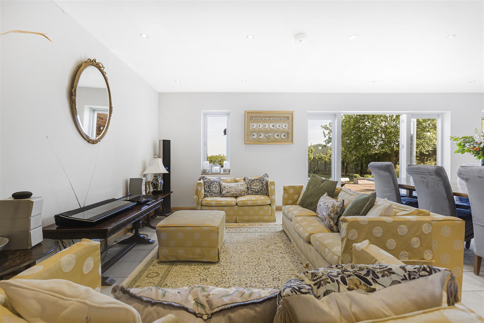 This stunning room also provides plenty of space for a large dining table/chairs, and family-sized sofas. French doors open out to the rear garden and patio, making for the perfect space to entertain family and friends.