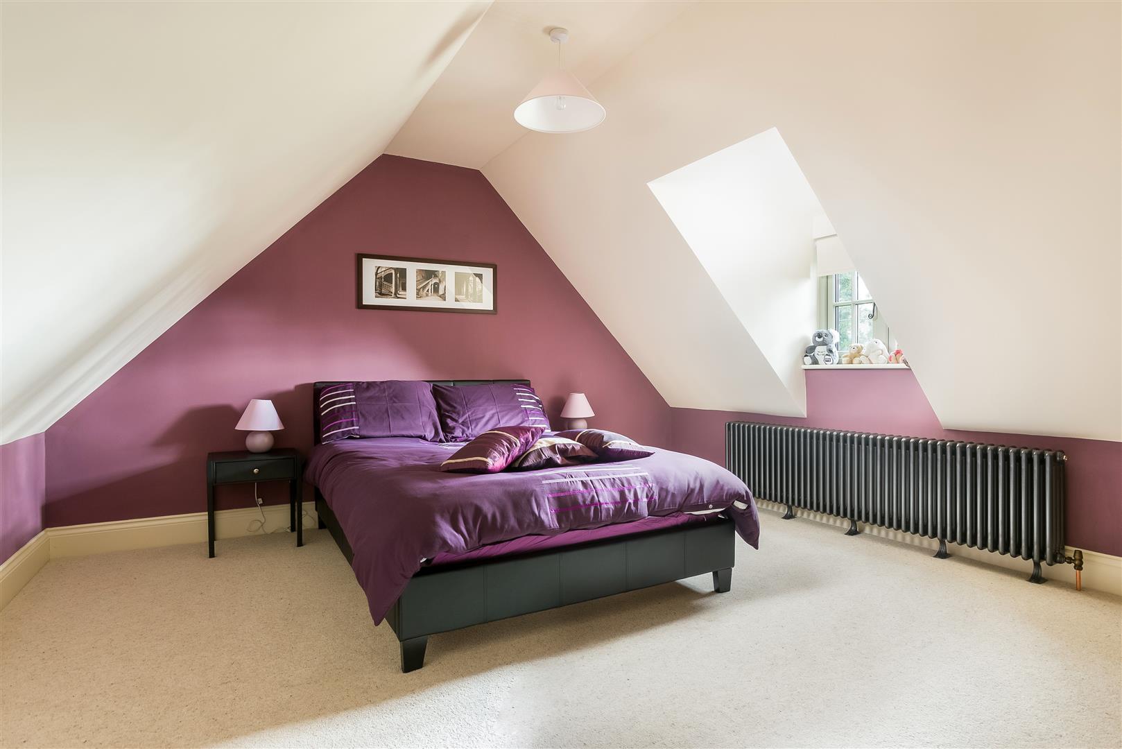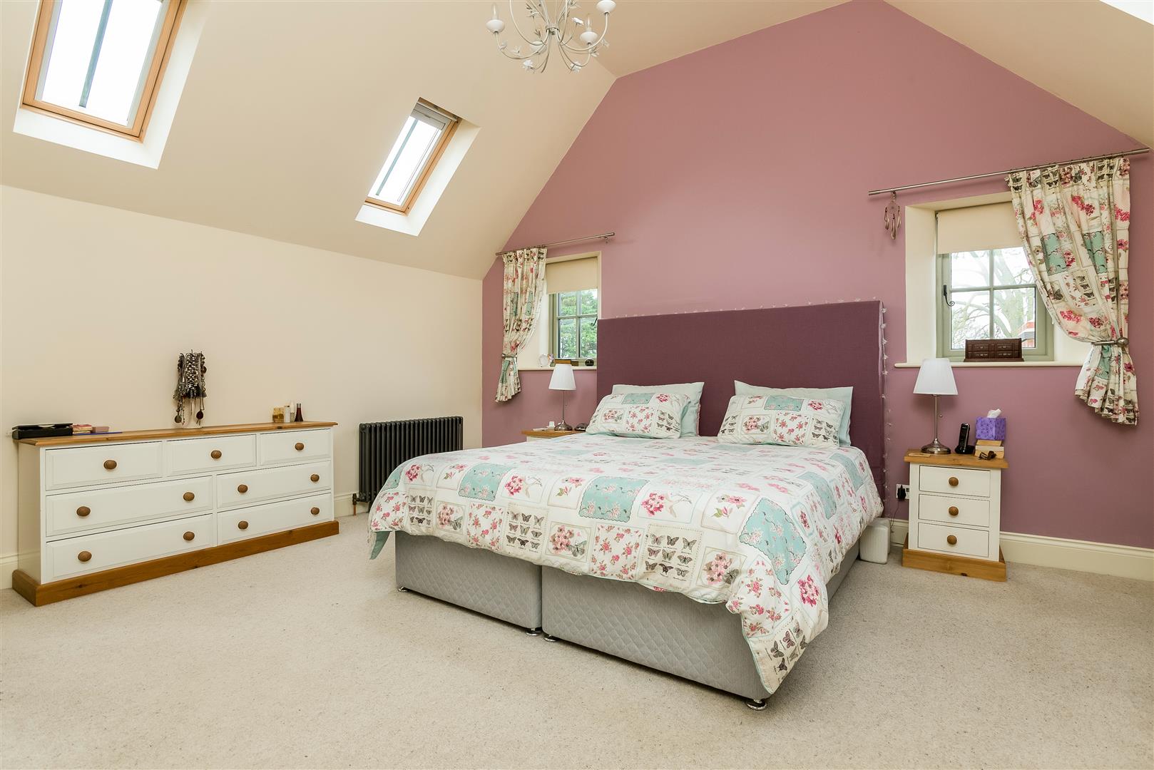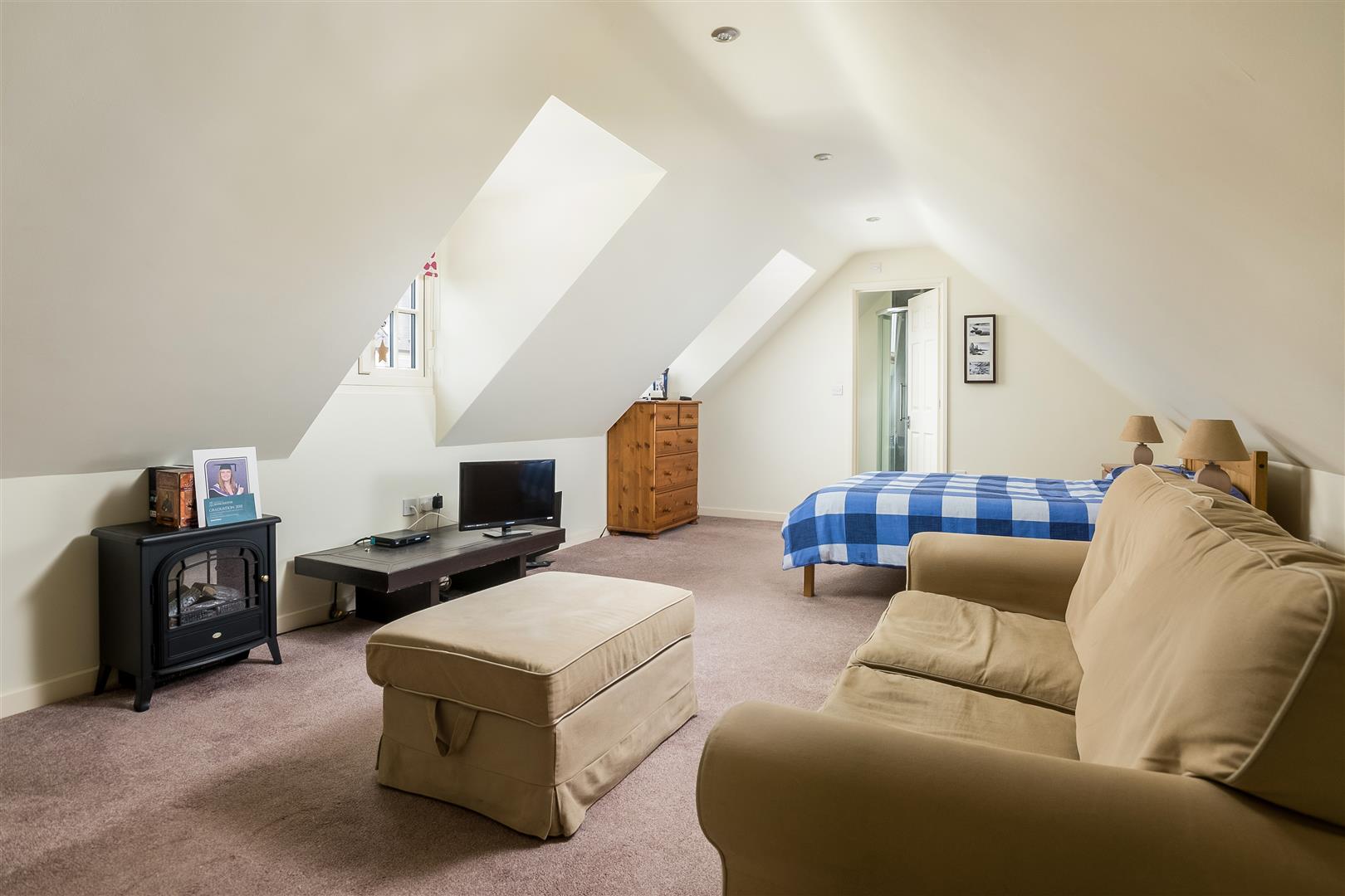 The master bedroom with vaulted ceiling has two windows to rear aspect and four double glazed Velux windows with electric blinds