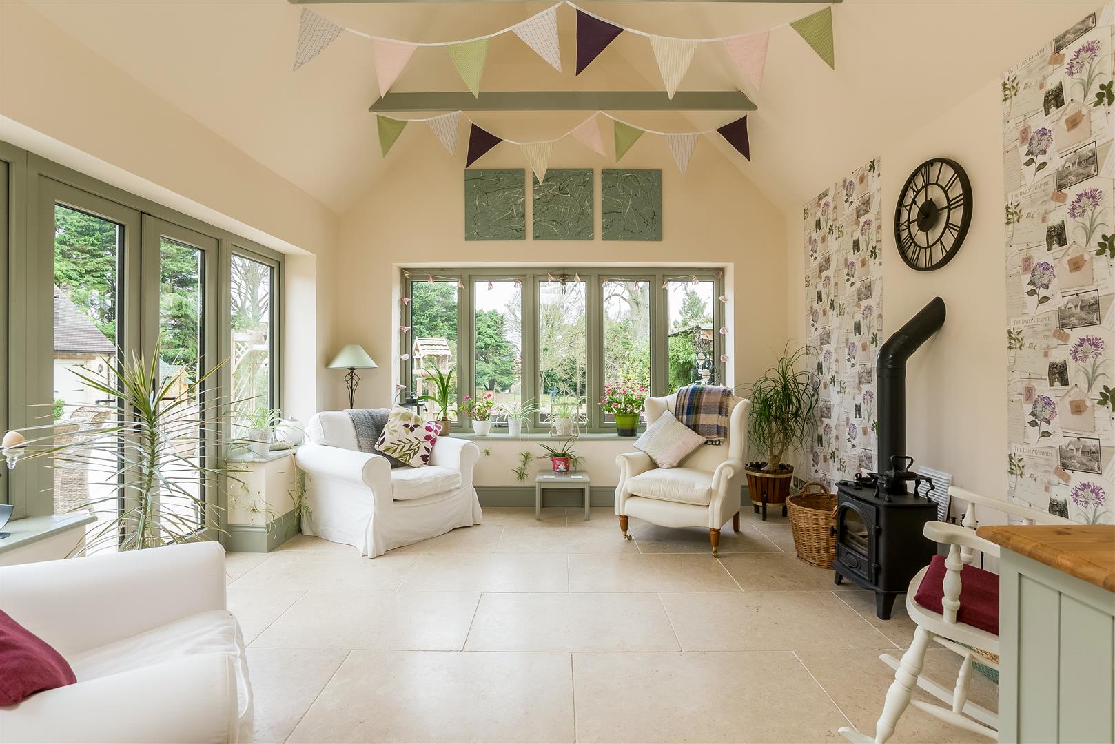 Steps lead down to the sunroom, which boasts French doors to the rear garden, lime flagstone floor with underfloor heating, wood-burning stove, vaulted ceiling with exposed beams